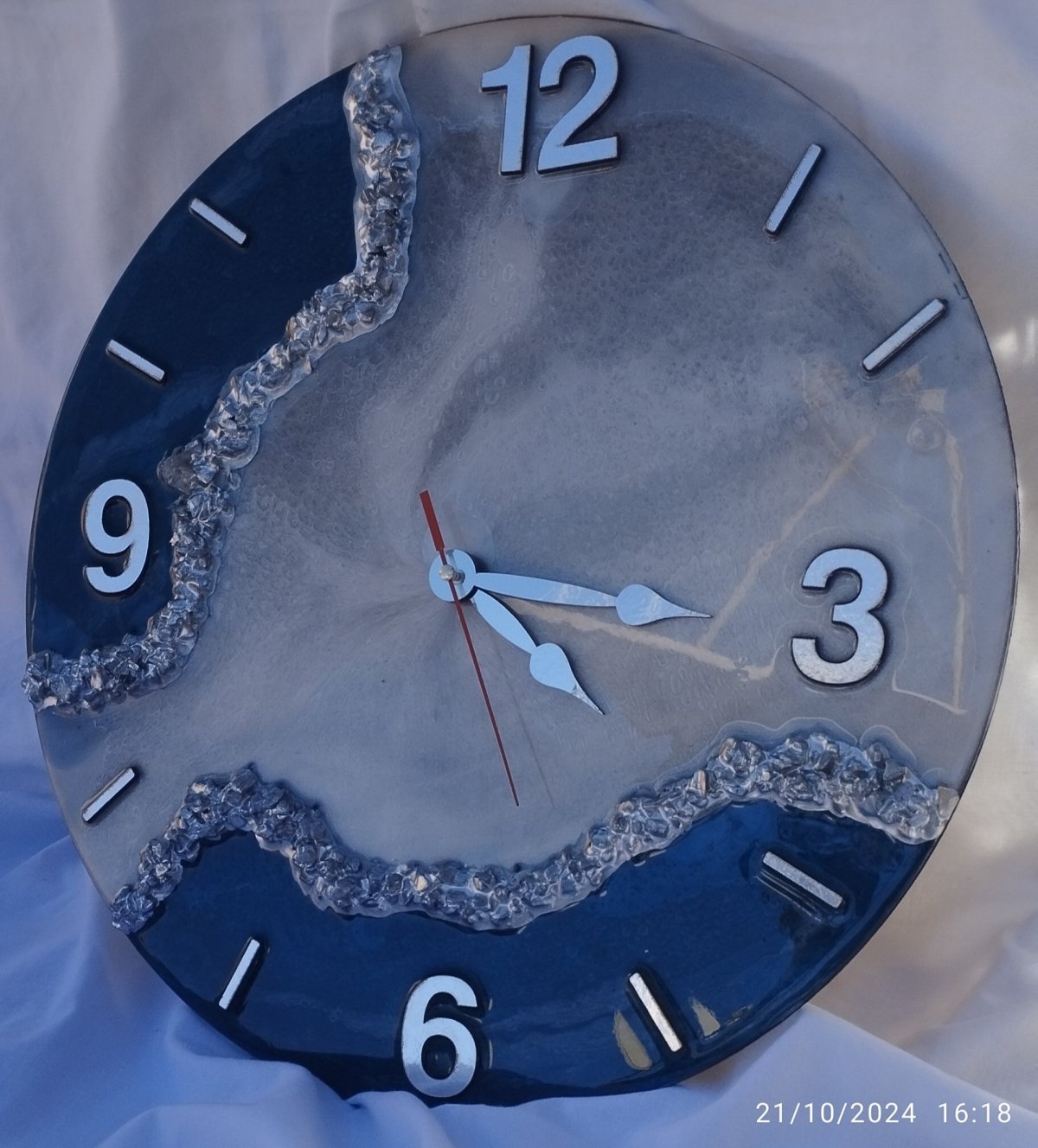 ساعة حائط ريزن قطر 50سم باللون الأزرق واللون الاوف وايت ميكس لون جراي ميتاليك ميكس أحجار لون فضي أرقام الساعة خامة إكريليك حفر لون فضي تقدم كهدية مميزة مختلفة وقيمة للديكور المنزلي أو أماكن أخرى تظهر جمال وأناقة المكان