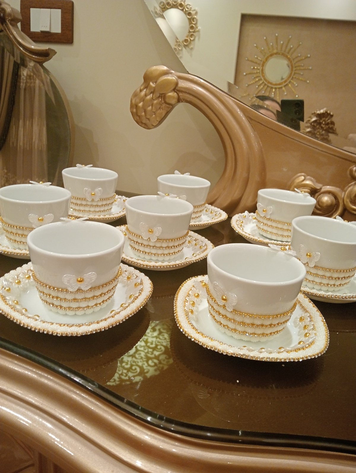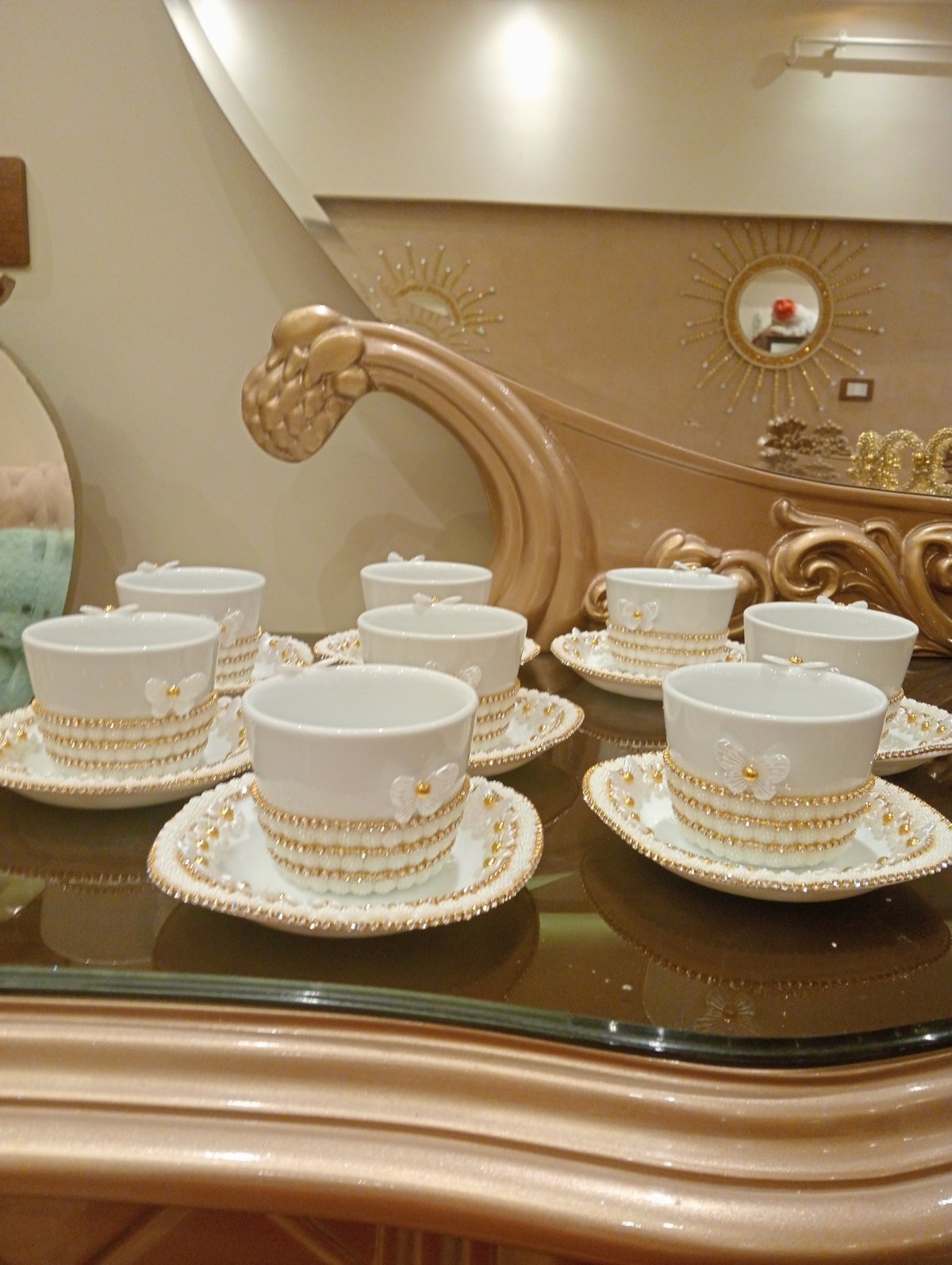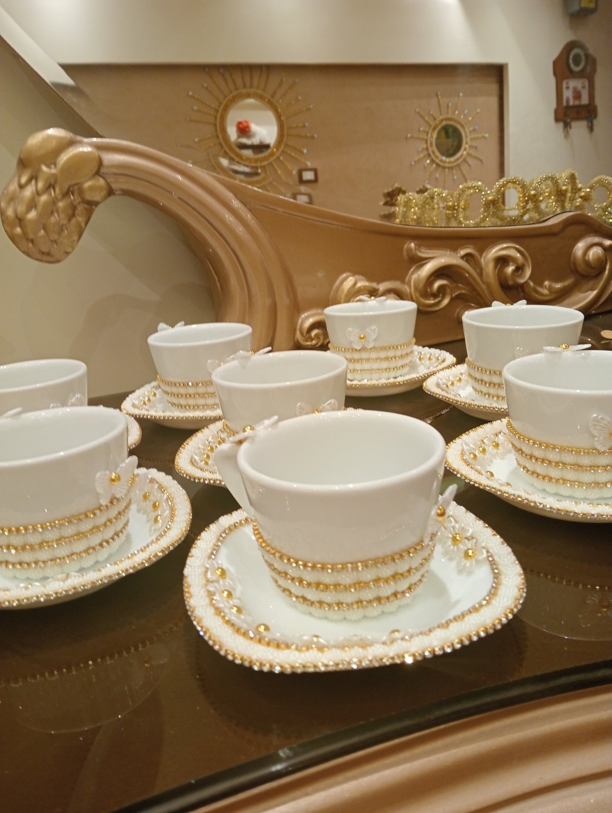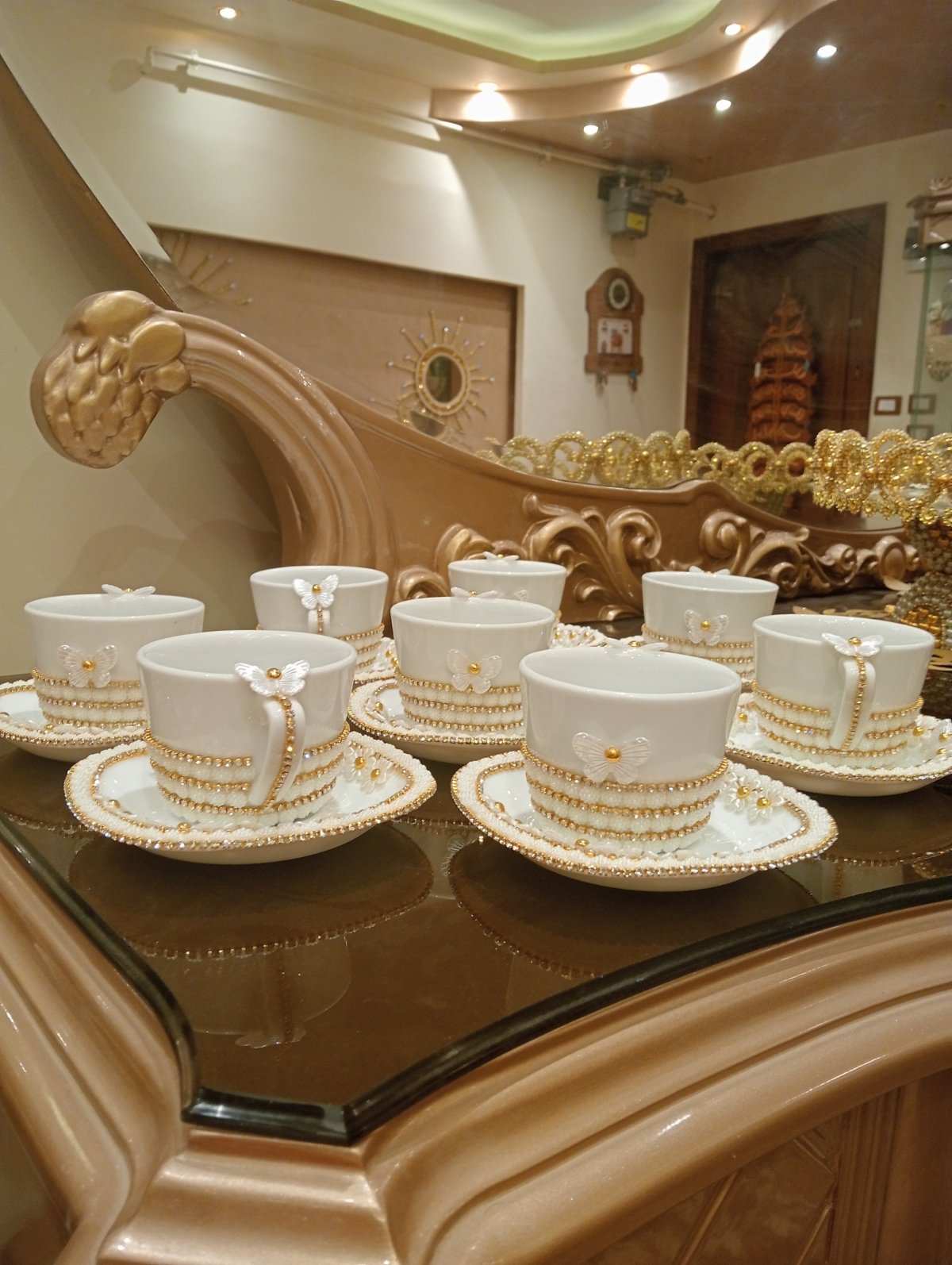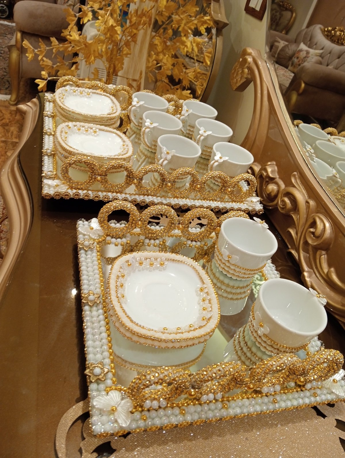 من الاطقم التي يتميز يها نيش سفرتك اطقم الشاي والقهوه والكاكاو كما يمكن استخدامها للضيوف لان خاماتها قابله للاستخدام وليست للديكور فقط فتصميمها يناسب الاستخدام الخامه صيني عدد 6 كوب شاي و6 طبق مزينه بالفروع الألماظ المعدن الغير قابله للكسر او الصدأ الغير قابل للتقشير CCB ولولي ومتاح عمل فنجان قهوه وكاكاو ومجات بنفس التصميم او كما تحبين من تصميم