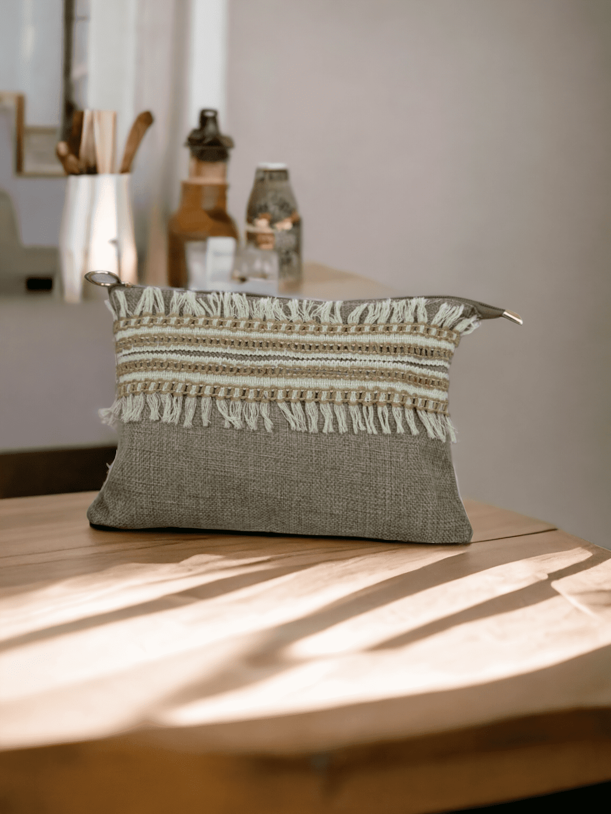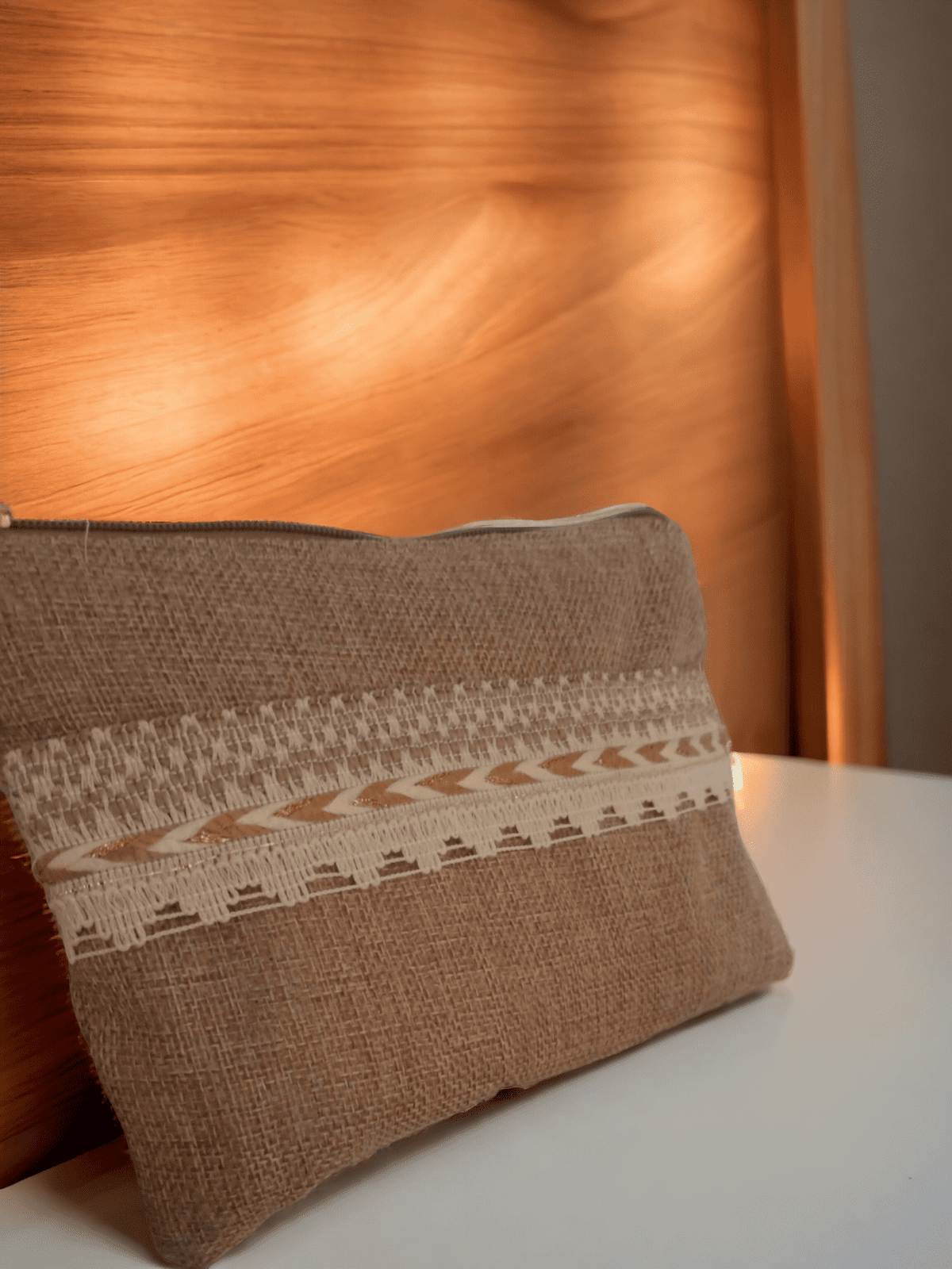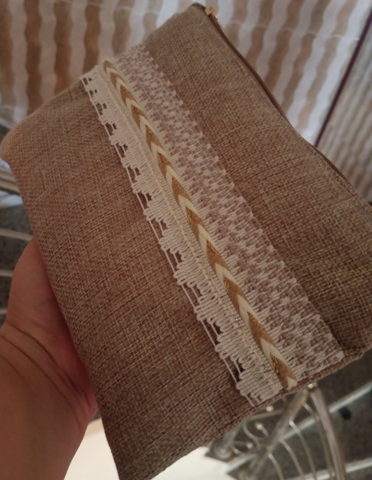 كلاتش من خامه الكتان مبطنه من الداخل بالستان مزينة بشرائط مقاس ٣٠×٢٠