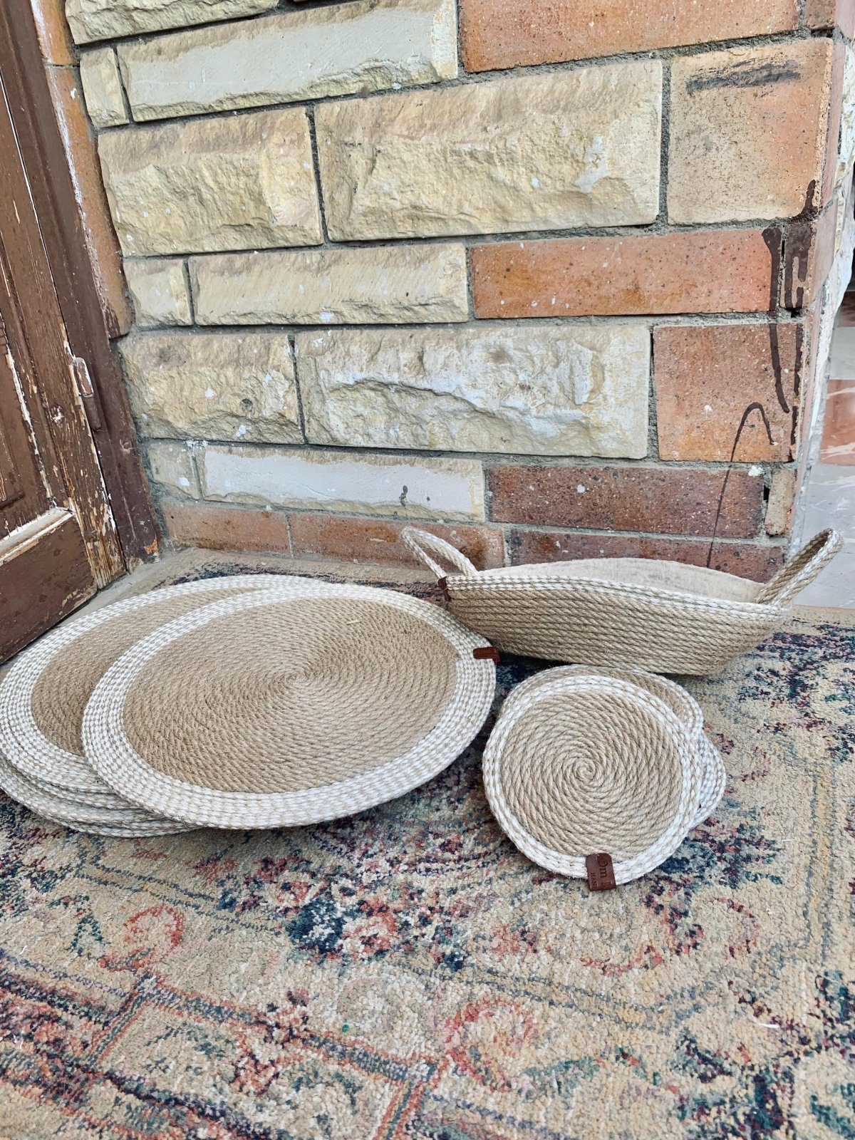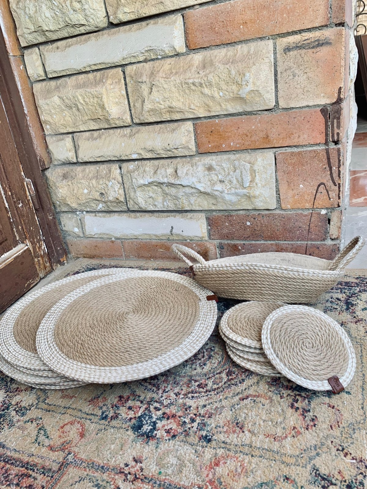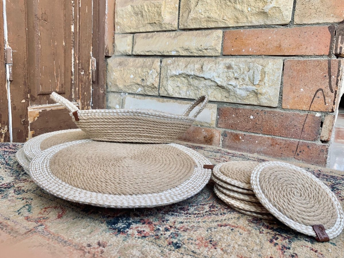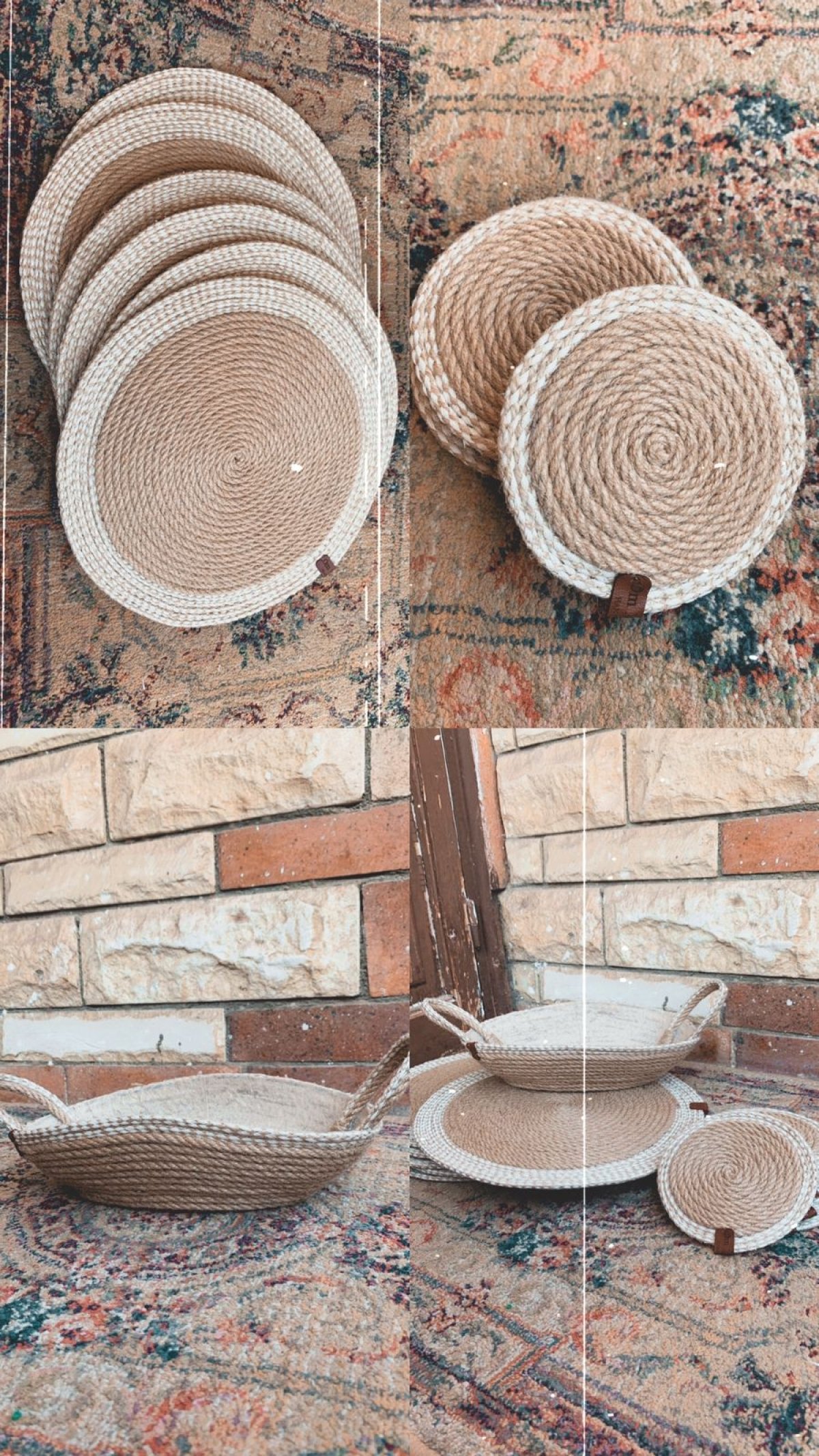 طقم كوستر للسفره الطقم مكون من : 6 كوستر كبير للاطباق قطر الكوستر 30 سم 6 كوستر صغير للمجات قطر الكوستر 10 سم منظم للملاعق والشوك والسكاكين 24 سم ×14 سم ×ارتفاع 6 سم طقم شيك جداً هيضيف لسفرتك شكل راقي وجميل.. متاح تنفيذ أشكال تانيه كتير مختلفه.. مصنوع من أجود خيوط الخيش.. ومتاح تنفيذه بخيوط مكرميه حسب الرغبة