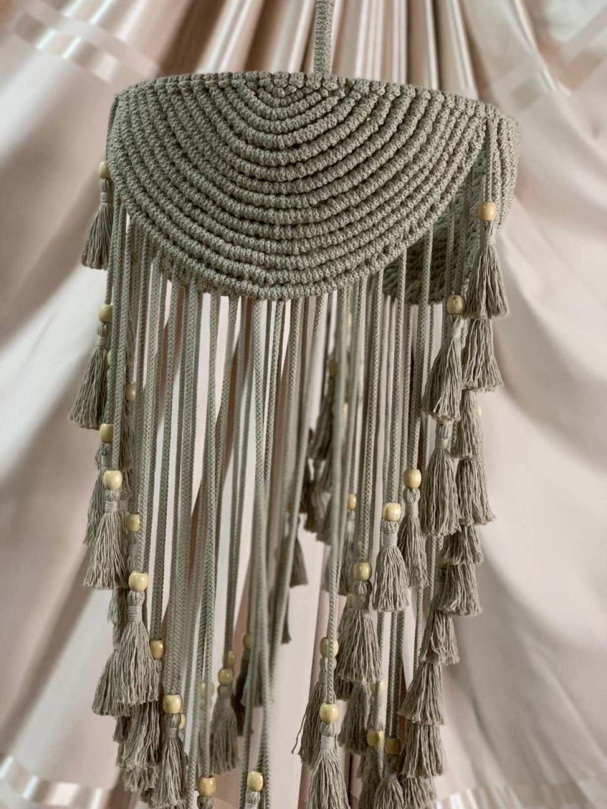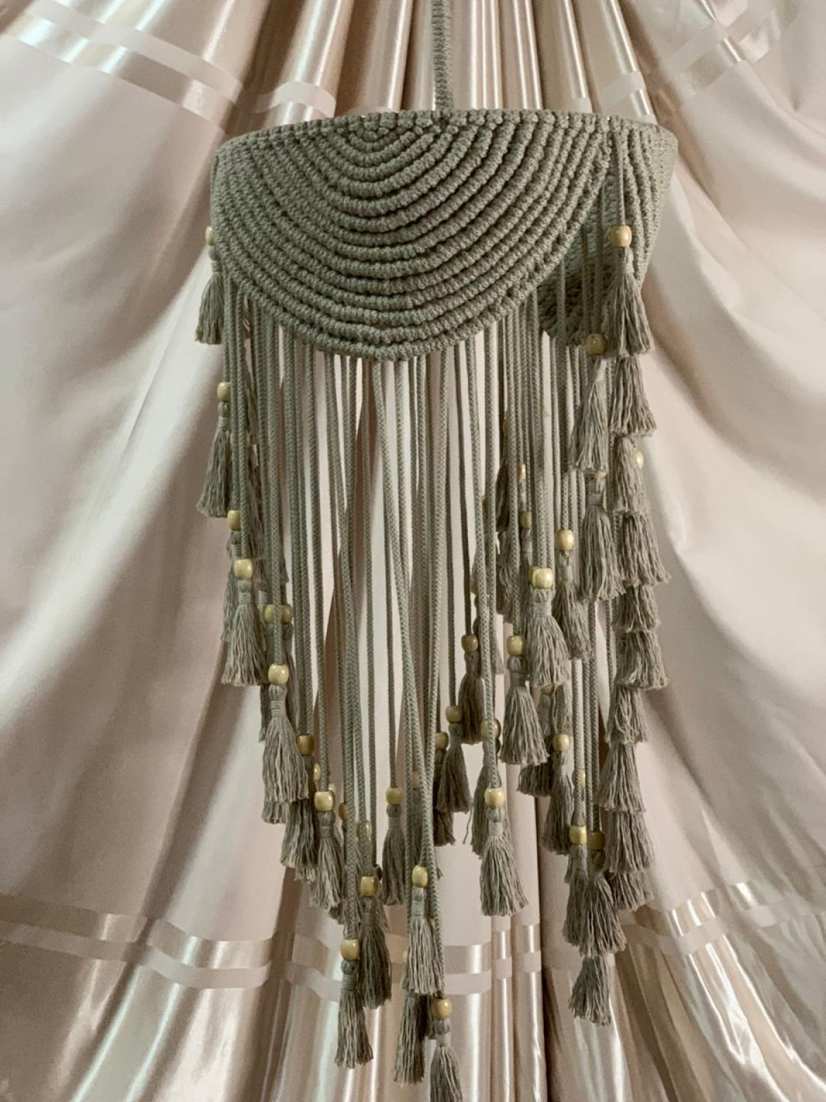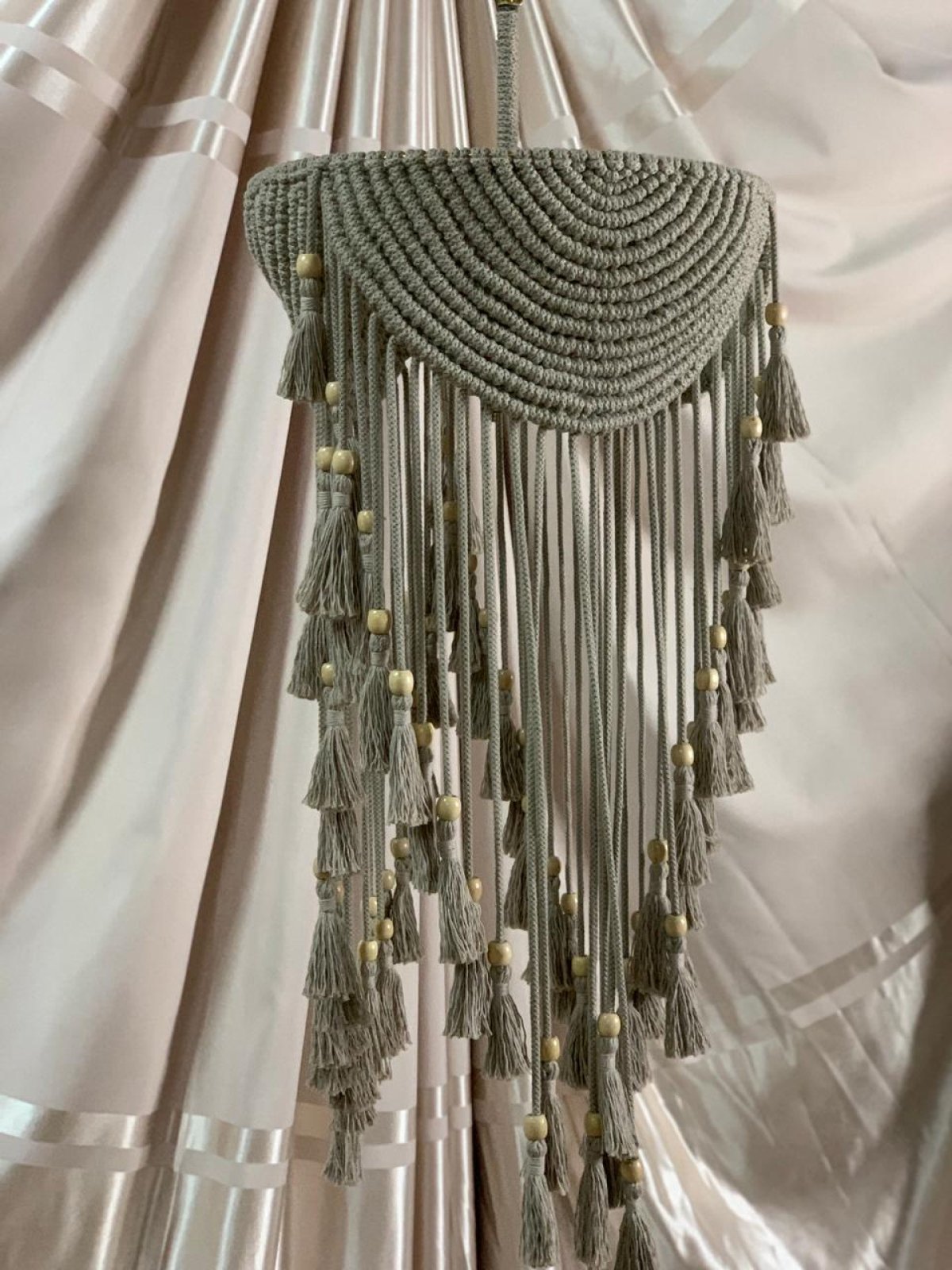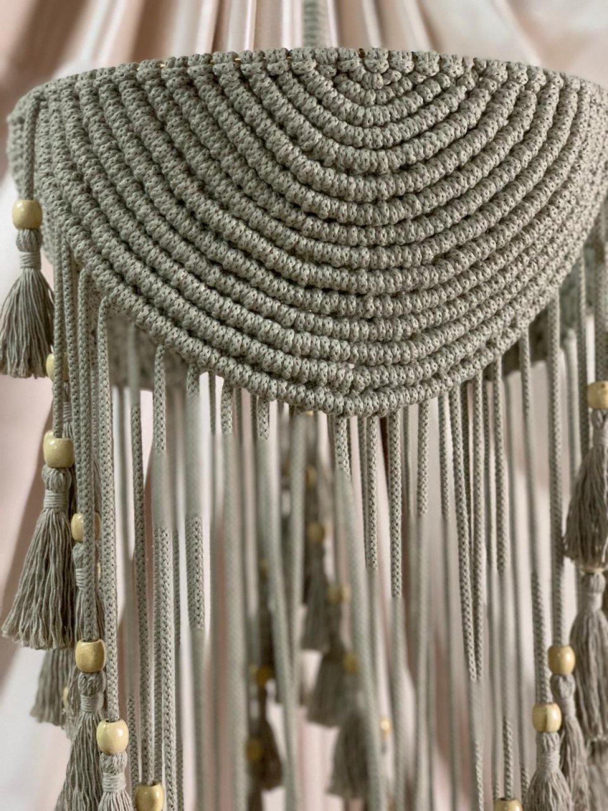 نجفه بوهو قطرها 40 سم.. ارتفاعها بالشراشيب 80 سم النجفه مصممة على شاسيه معدن ومجدوله بكوردون قطن مكرميه مضفر.. ومطعمه بحبات خرز باللون الاوفيت إستايل جديد وراقي من النجف البوهيمي
