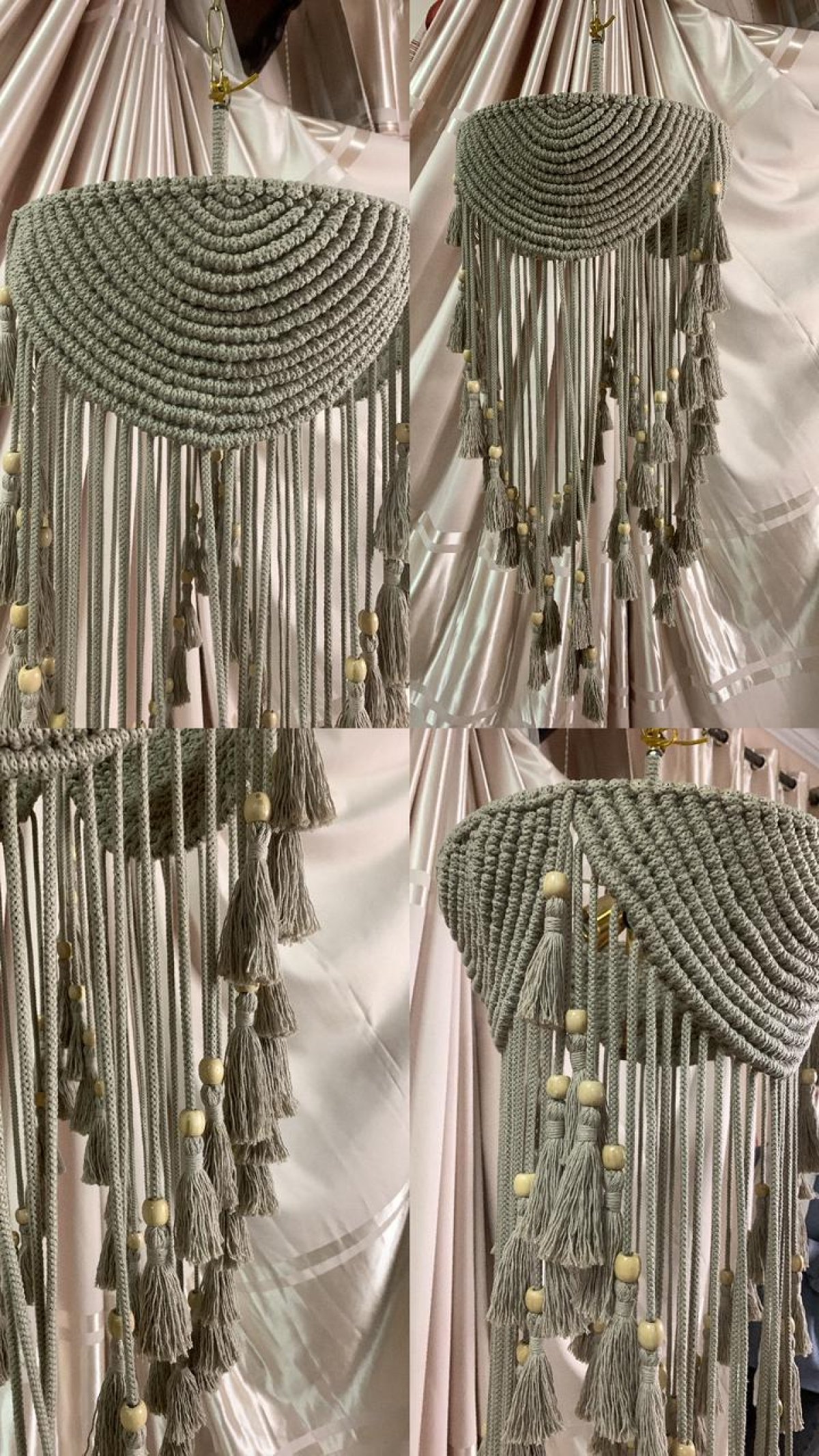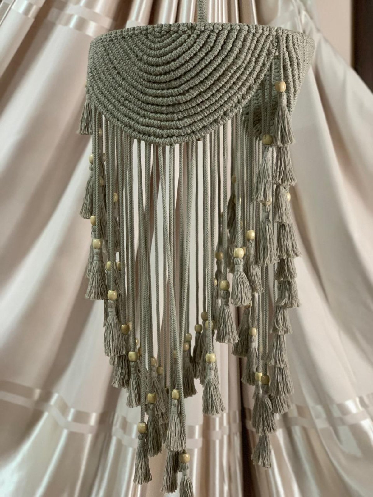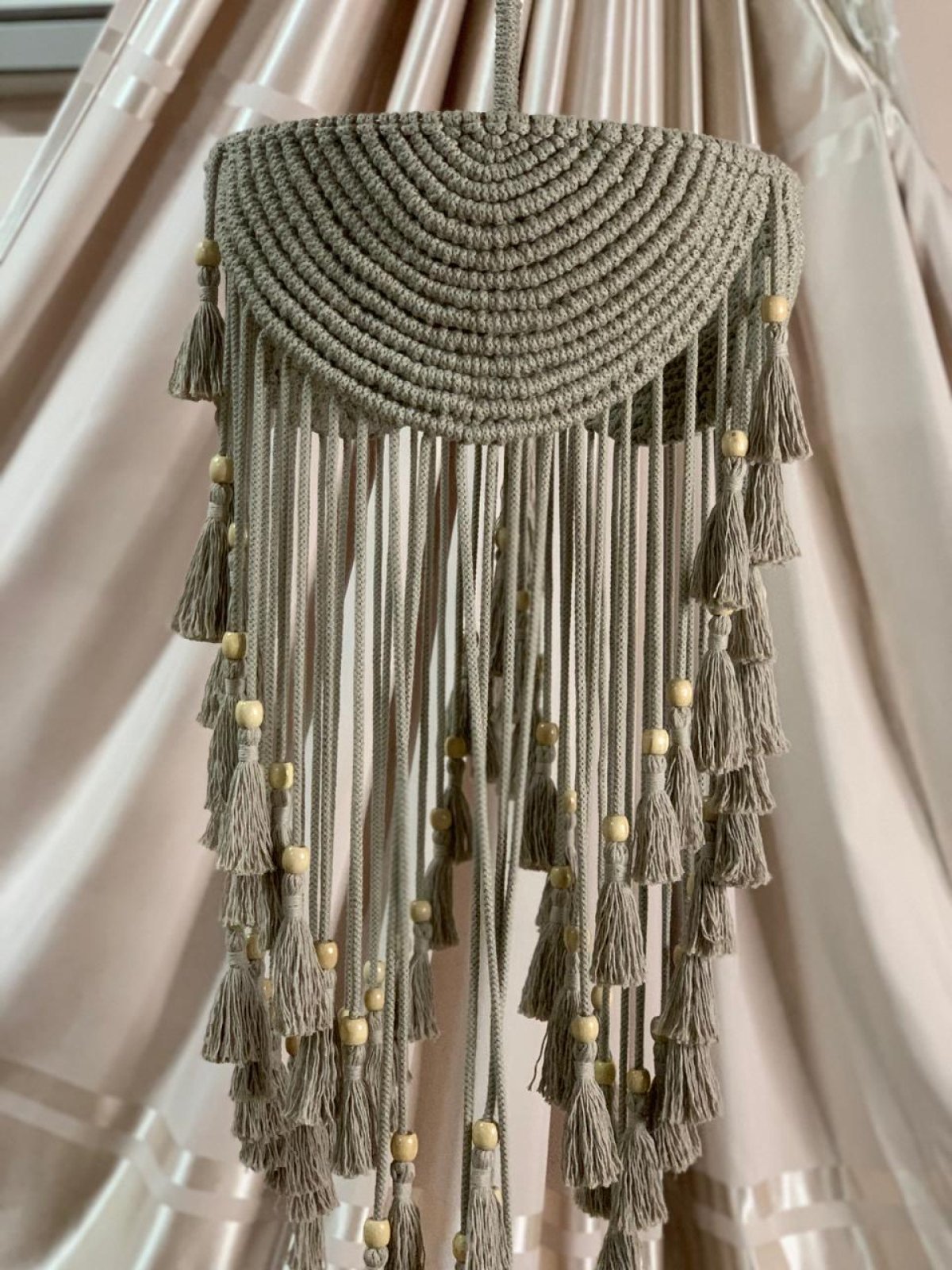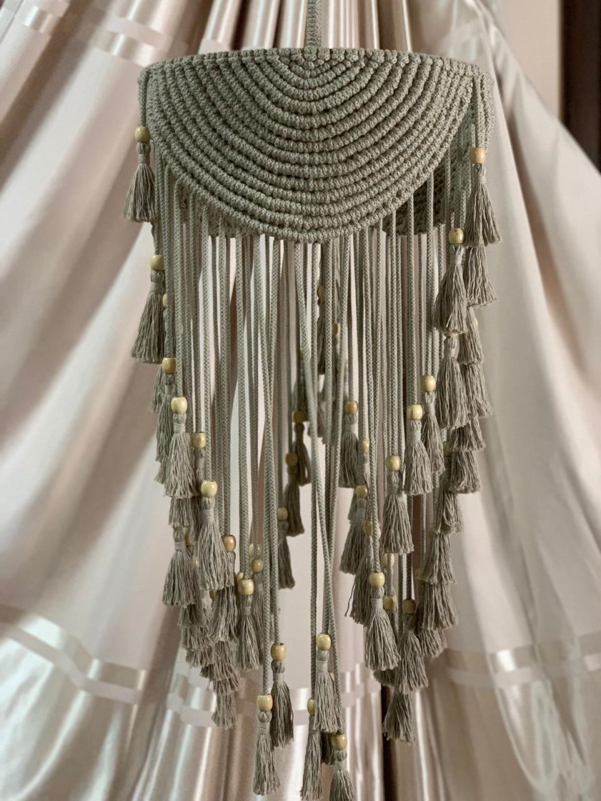 نجفه بوهو قطرها 40 سم.. ارتفاعها بالشراشيب 80 سم النجفه مصممة على شاسيه معدن ومجدوله بكوردون قطن مكرميه مضفر.. ومطعمه بحبات خرز باللون الاوفيت إستايل جديد وراقي من النجف البوهيمي