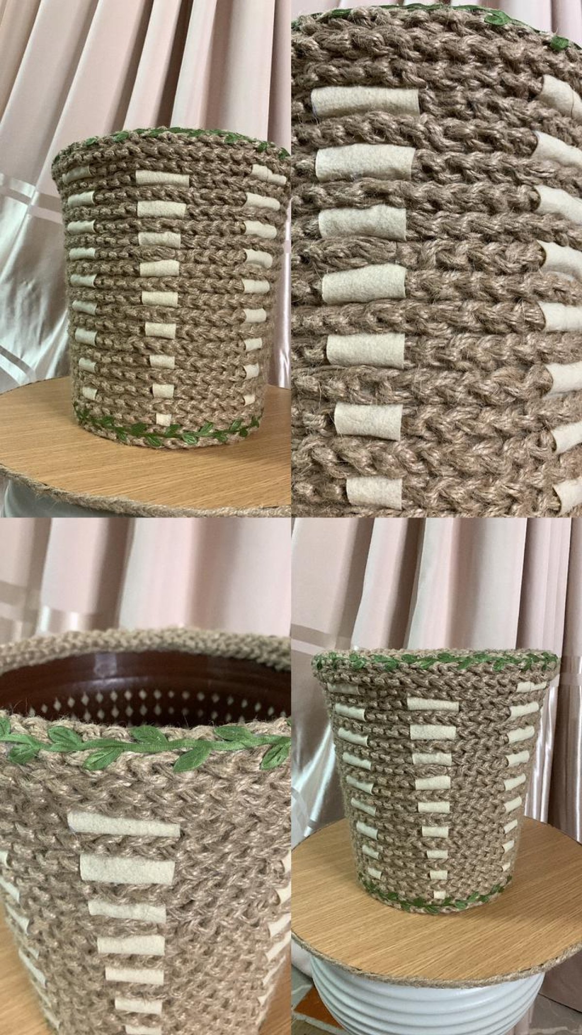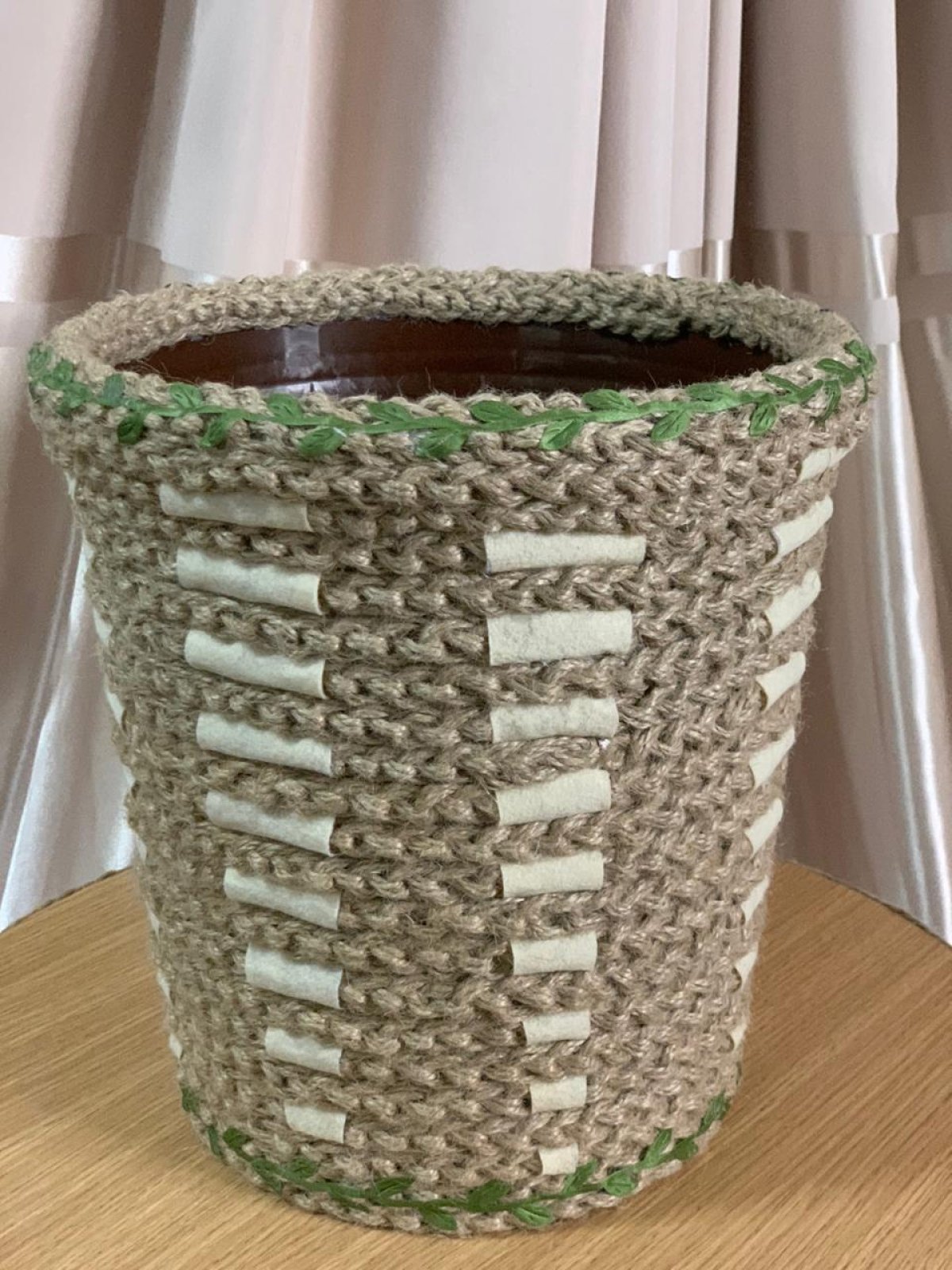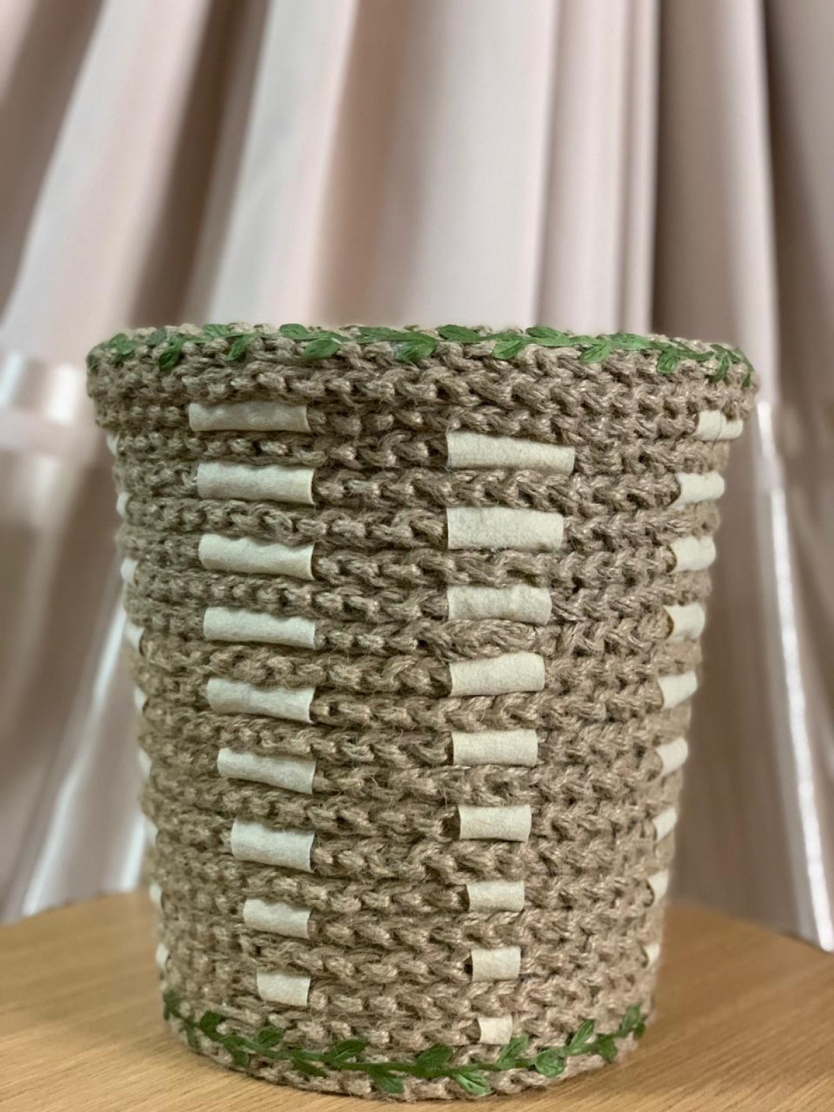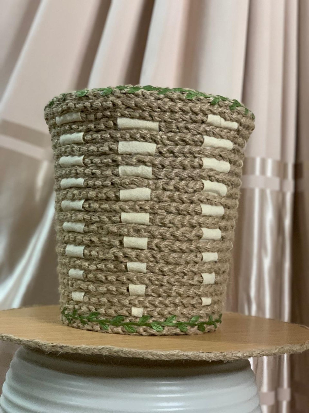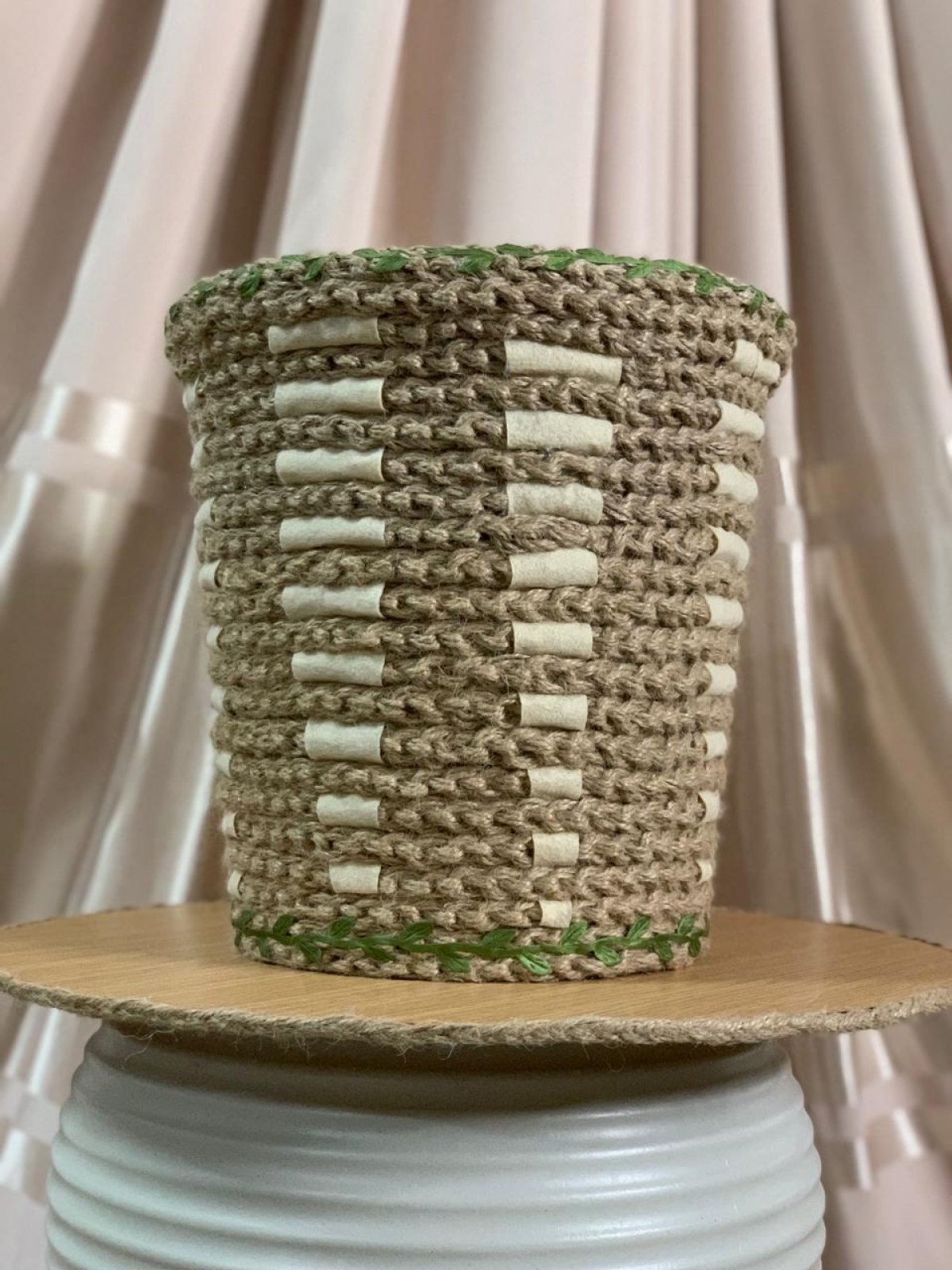 باسكيت بوهو قطره 23 سم وارتفاعه 25 سم مزين بخيوط خيش مجدوله بغرزه السلسلة.. مما يميز الباسكيت بشكل رائع.. ومزين بفرع ورق شجر أخضر