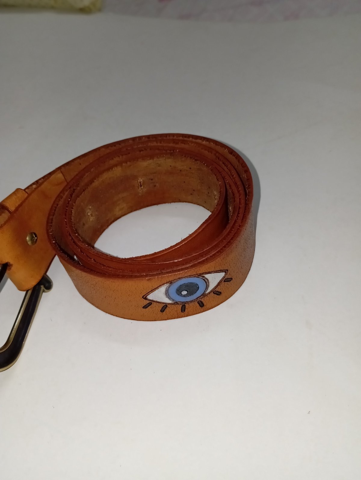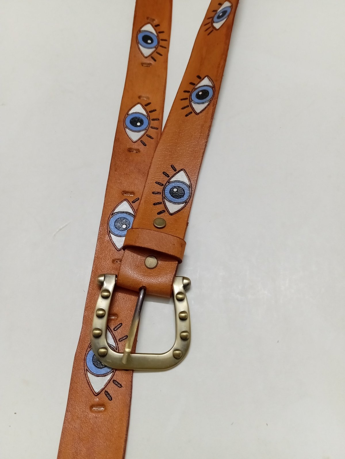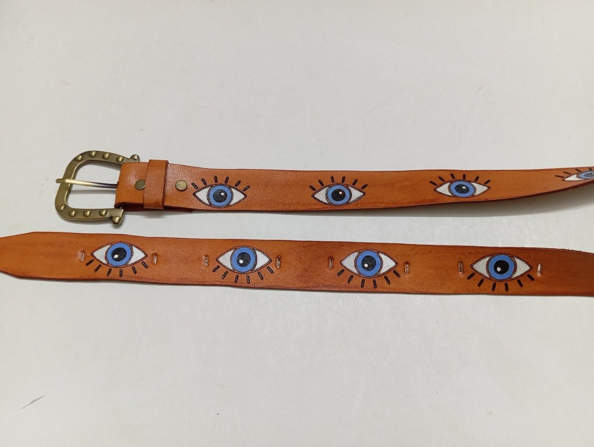 حزام جلد طبيعي اصلي هاند ميد رسمه عيون الوان ثابتة مقاسات سم3.2*110سم لون هفان توكه معدن لون نحاسي