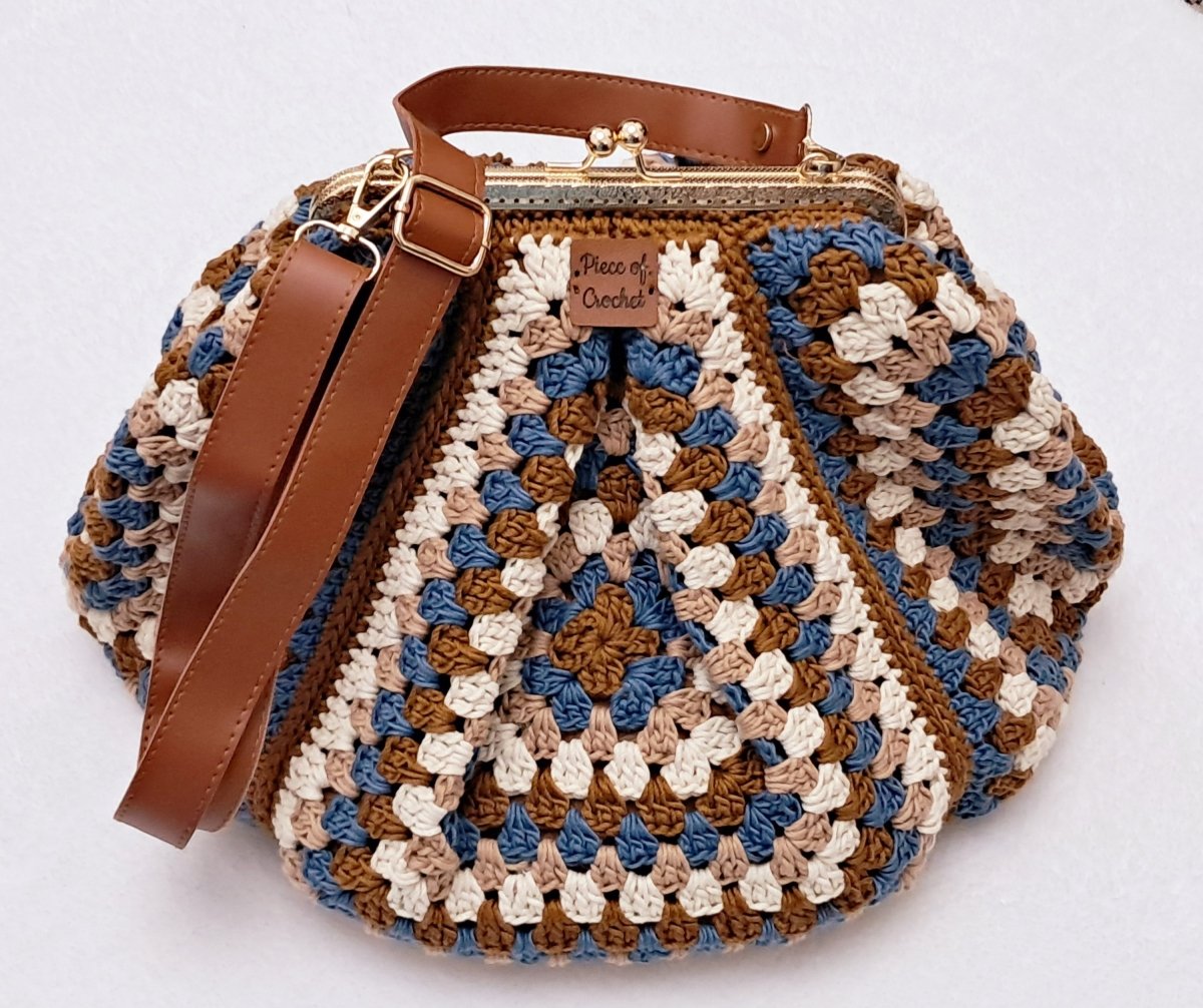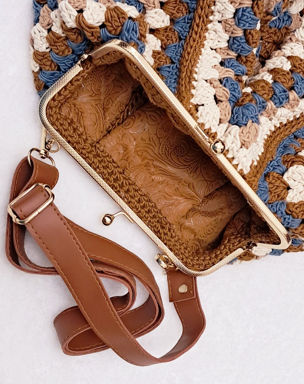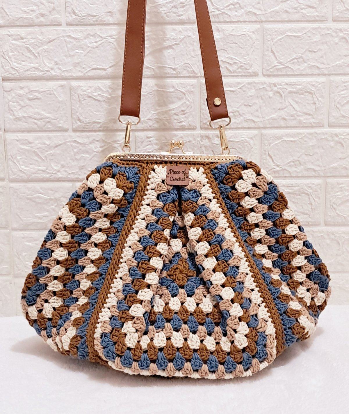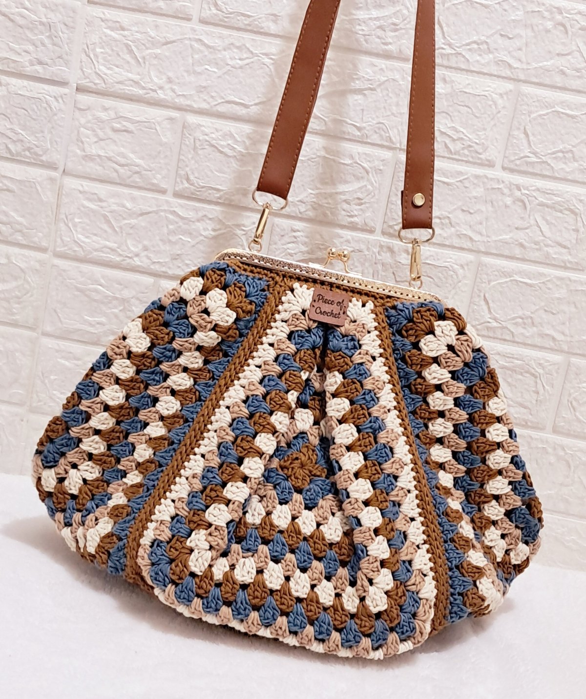 شنطة كروشية مشغولة بخيط قطن عالى الجودة . الشنطة لها فريم معدن خامة ممتازة وأيد جلد كروس طبقتين وخامة حلوة جدا لكنها مش جلد طبيعى . الشنطة لها بطانة داخلية . حجم الشنطة كبير ولها قاعدة مربعه ضلعها ٣٠ سم وارتفاع الشنطة ٣٠ سم عرض الشنطة ٥٠ سم والفريم المعدن عرضة ٢٠ سم . والايد الكروس قابلة لتغيير طولها . متاح تنفيذ نفس الالوان او الوان اخرى حسب الطلب . ومتاح تغيير لون اكسسوارت الشنطة من الدهبي للفضي او الفامية حسب الطلب .
