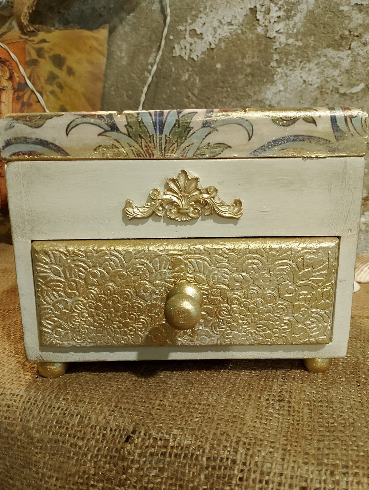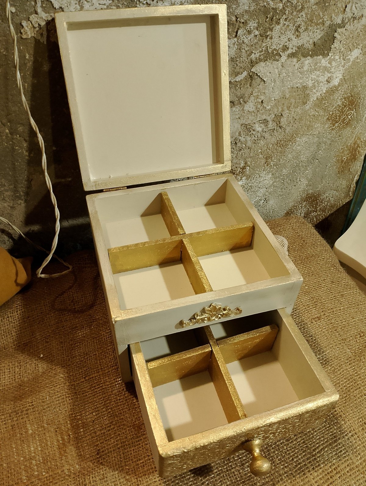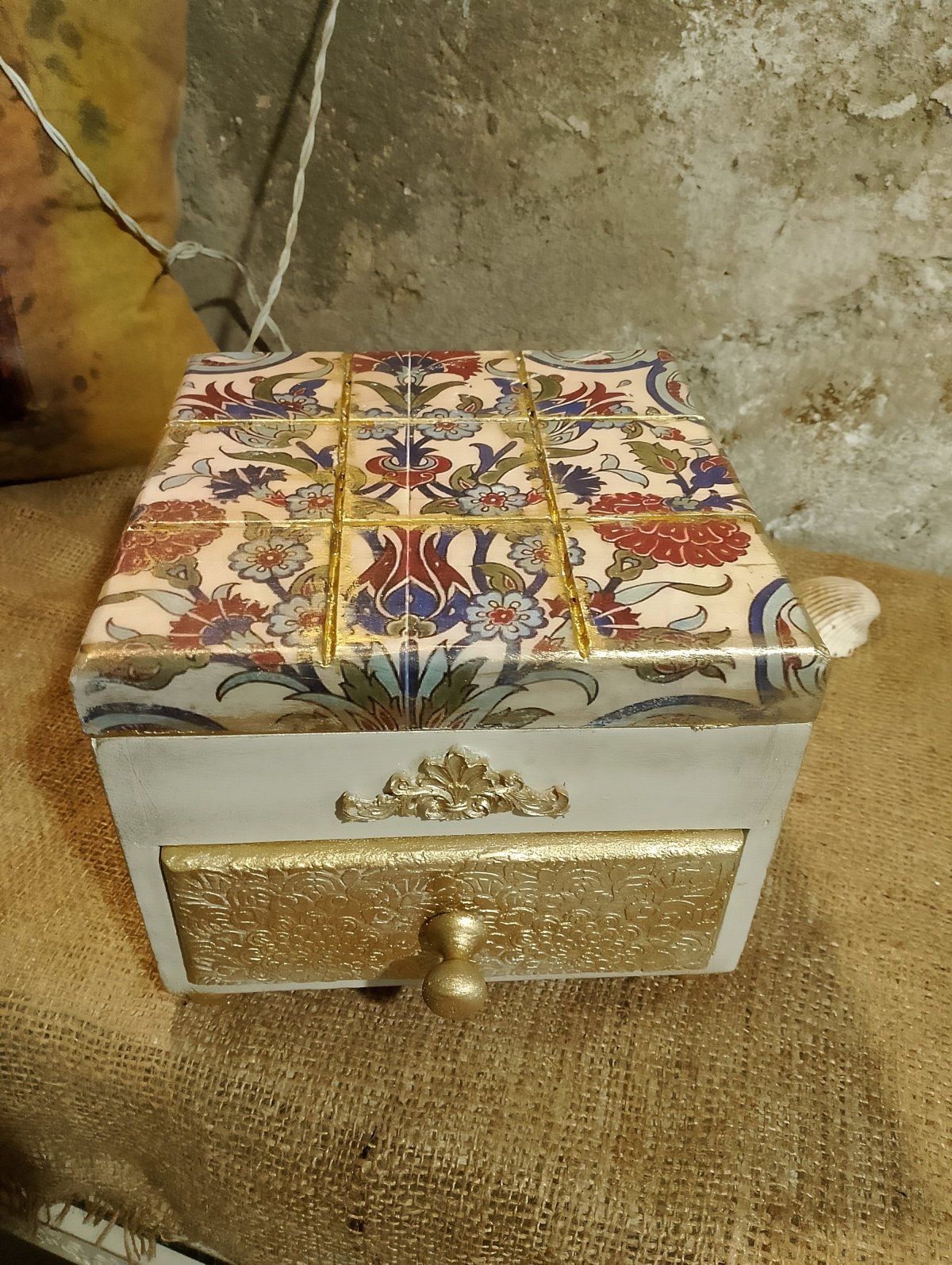 صندوق خشبي مقسم الى درج ومنظم بألوان اكريلك مع فن الديكوباج يستخدم الاكسسوارات والمجوهرات مقاس 20*20سم ارتفاع 22*سم