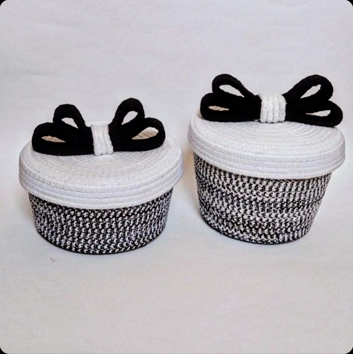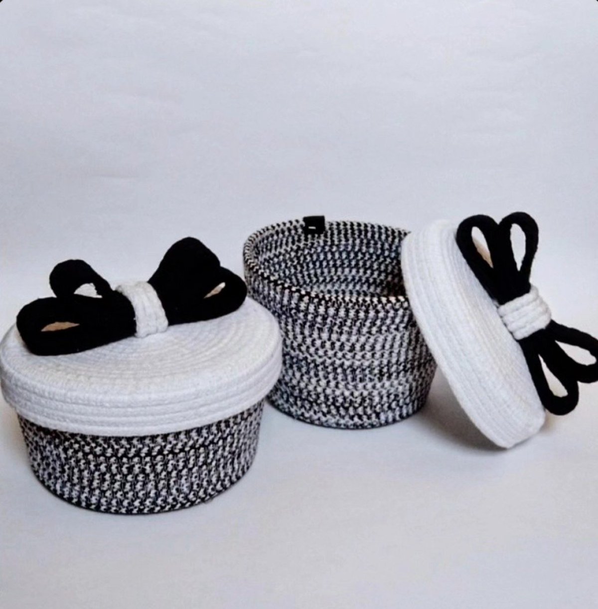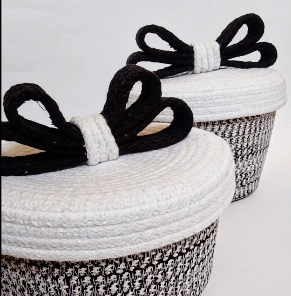 تتكون من سلتين . المقاس 20 سم * 10 سم 17 سم * 15 سم . مصنوعة من حبل القطن . الألوان المتوفرة: الخيش، الأصفر، الأخضر النعناعي، الأزرق، الأسود