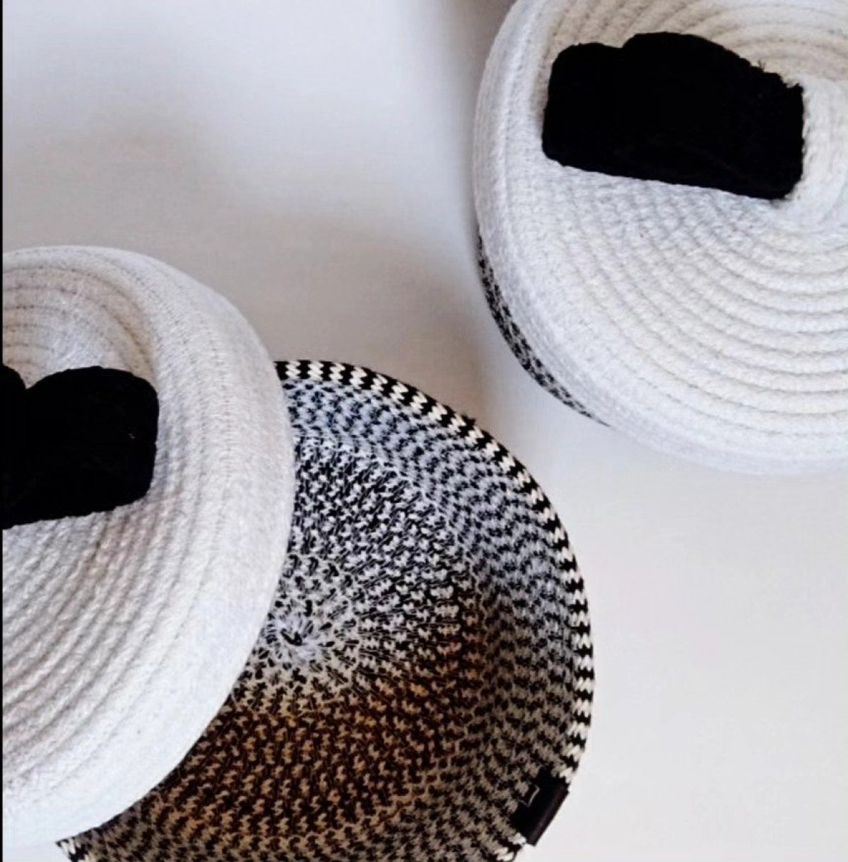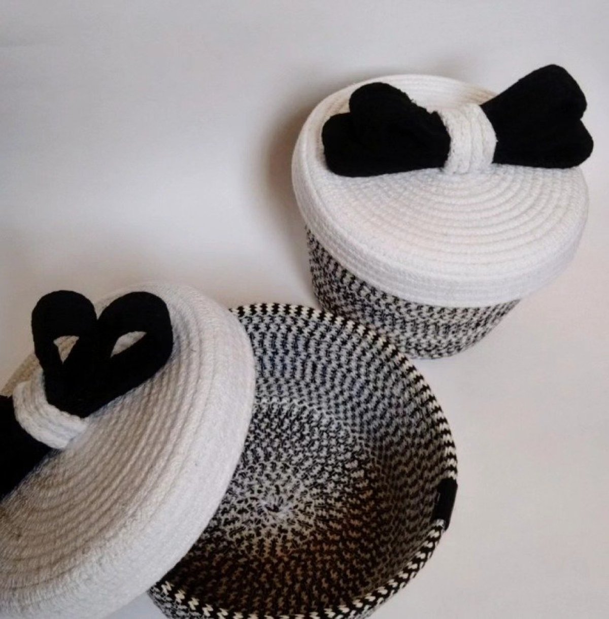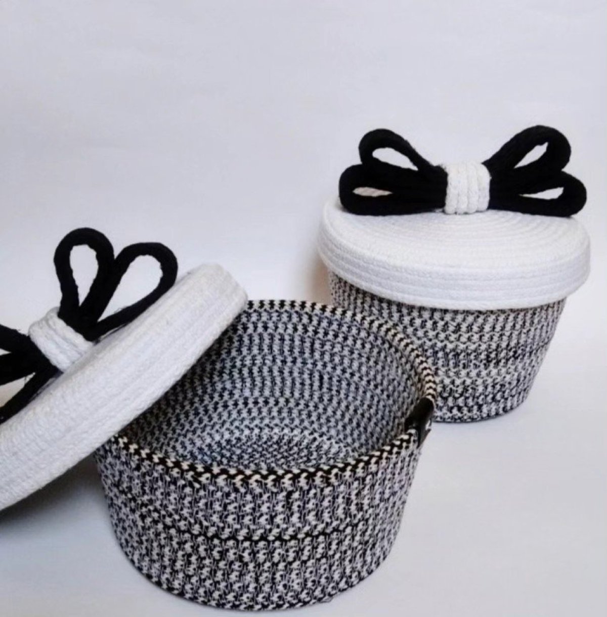 تتكون من سلتين . المقاس 20 سم * 10 سم 17 سم * 15 سم . مصنوعة من حبل القطن . الألوان المتوفرة: الخيش، الأصفر، الأخضر النعناعي، الأزرق، الأسود