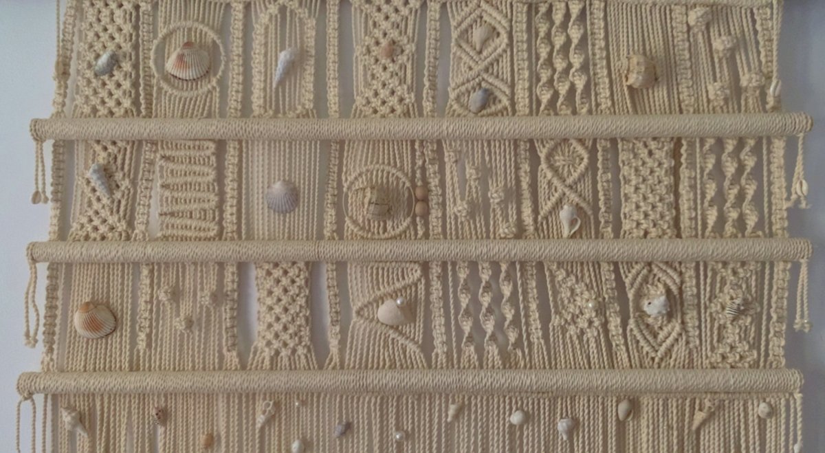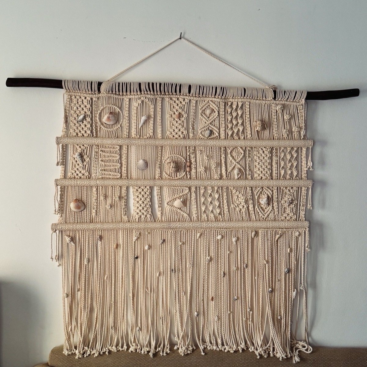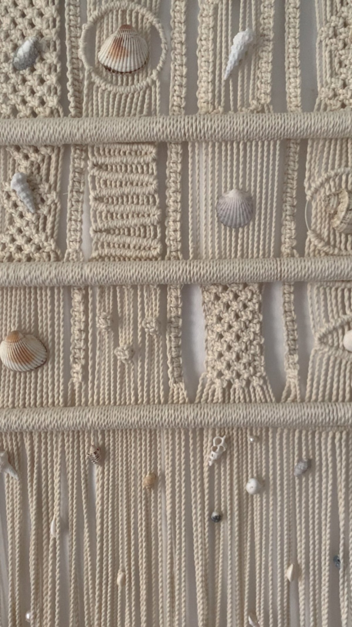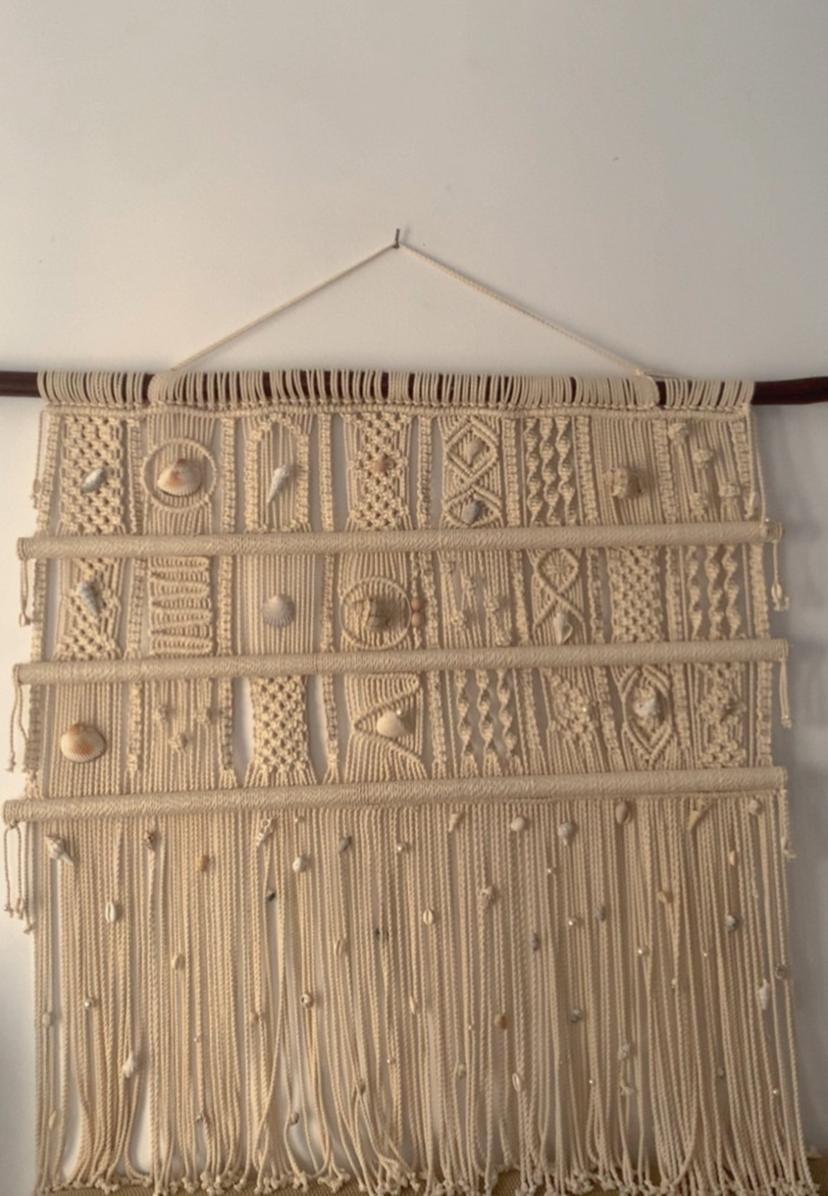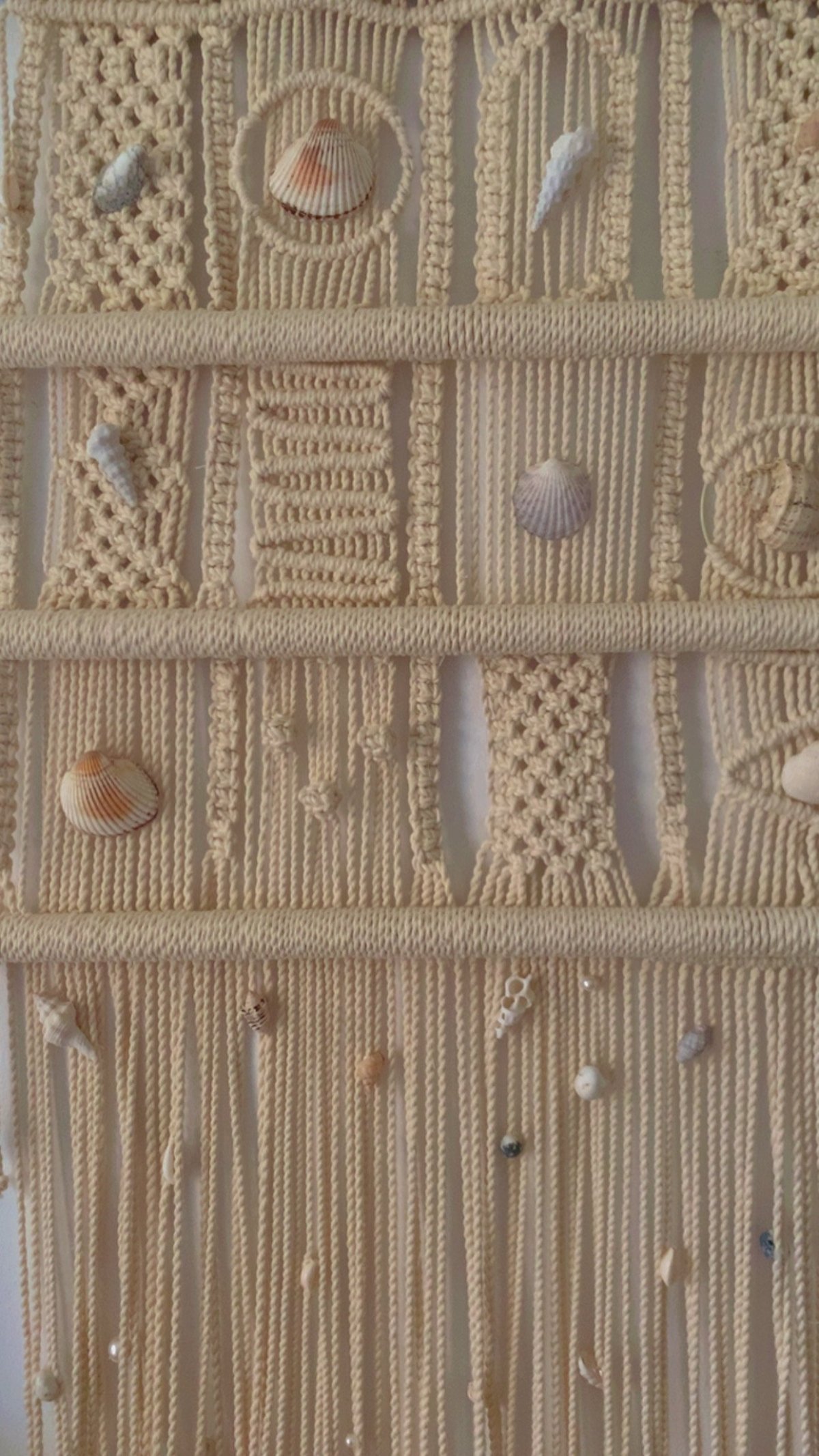 معلقه مكرميه علي الطريقه اليوهيميه 🐚🐚 - مقاس < ١٥٠ سم * ٢ متر - - خيط مكرميه قطن مجدول مستورد - - مطعمه بالصدف والاحجار البحريه الطبيعيه واللؤلؤ - - فواصل خشبيه - - تغيير شكل وذوق المكان بالكمال - 🌸🌸