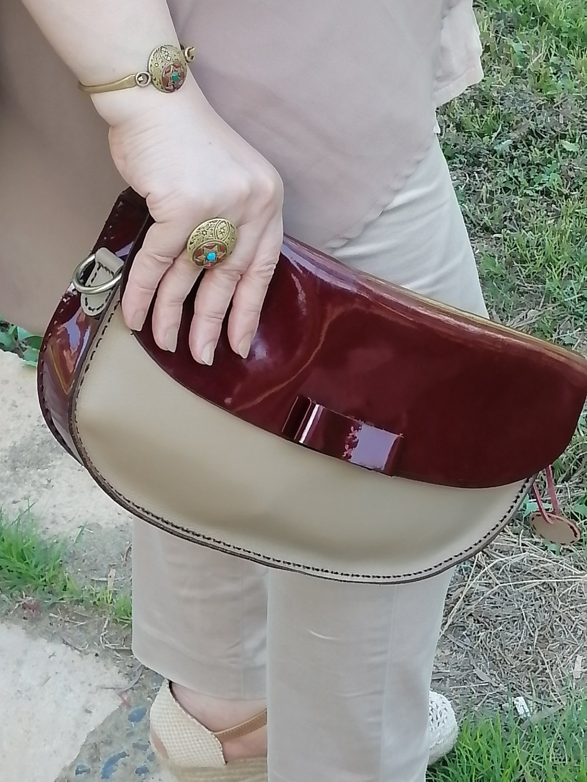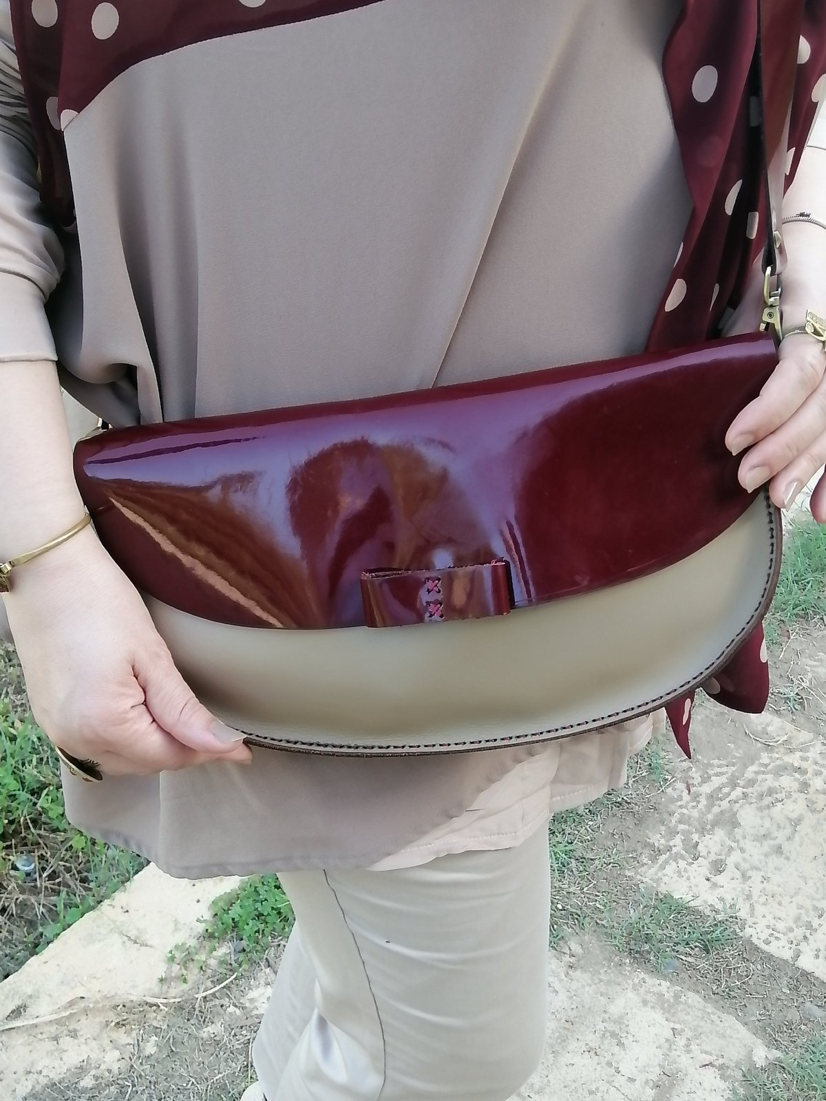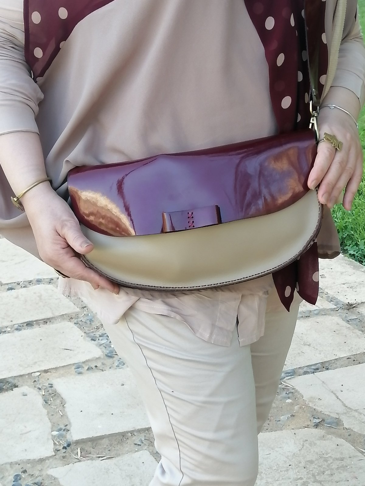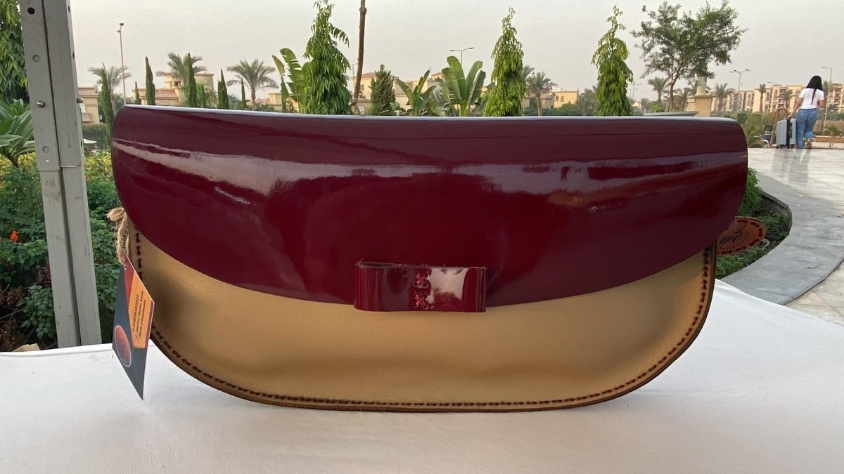 كلاتش حريمي باللون الاحمر الماروني الجذاب مكس مع البيج جلد بقري عالي الجودة.مقاس الكلاتش 35*18 مزودة بسعة كبيرة ويأتي مع حزام كروس.