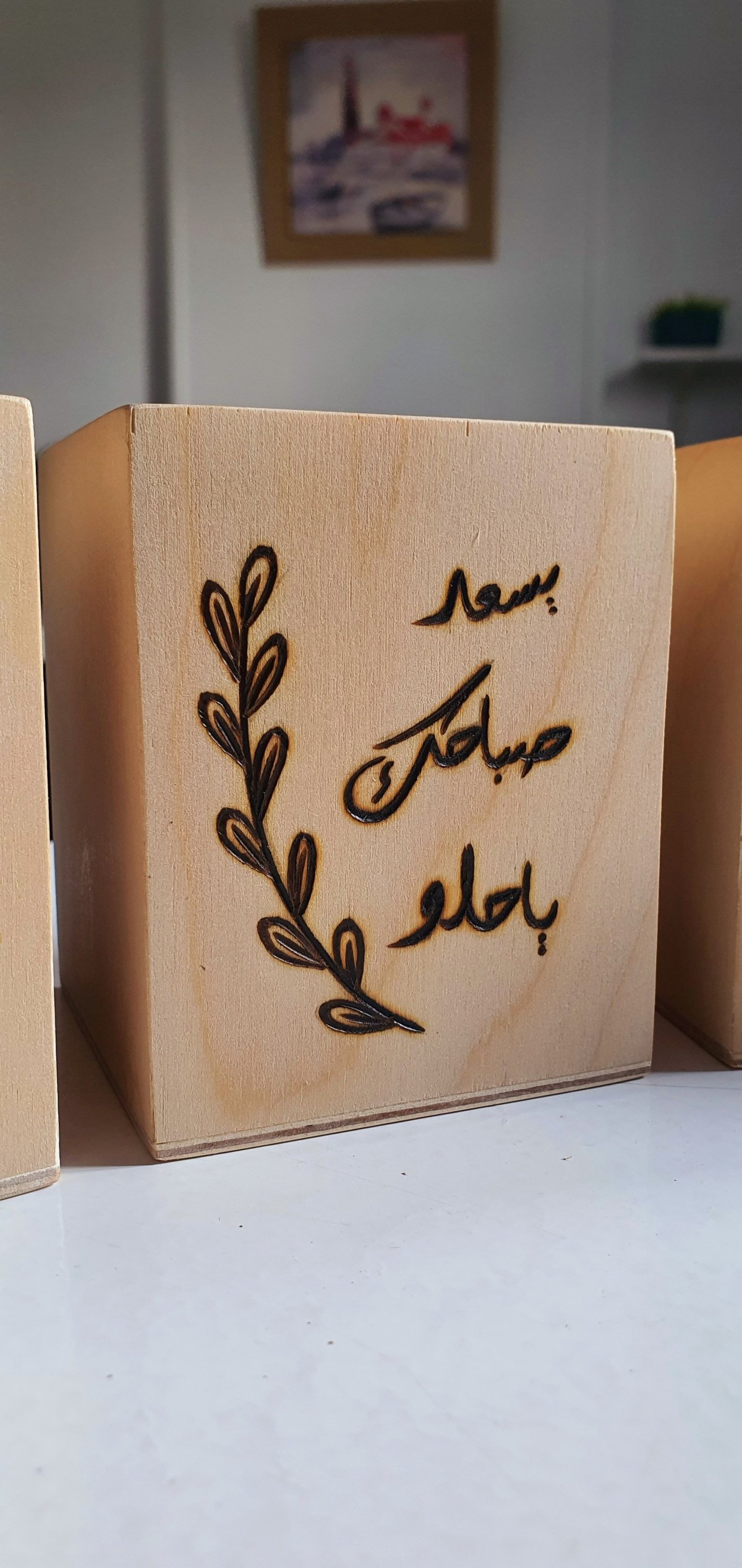 مقلمة مكتب خشب عالية الجودة، بتصميم فريد نفَّذناه بفن الحرق اليدوي على الخشب لإضافة لمسة فنية دافئة إلى غرفتك أو مكتبك. يسعد صباحك يا حلو الأبعاد: 7.5 × 7.5 × 9.5 سم