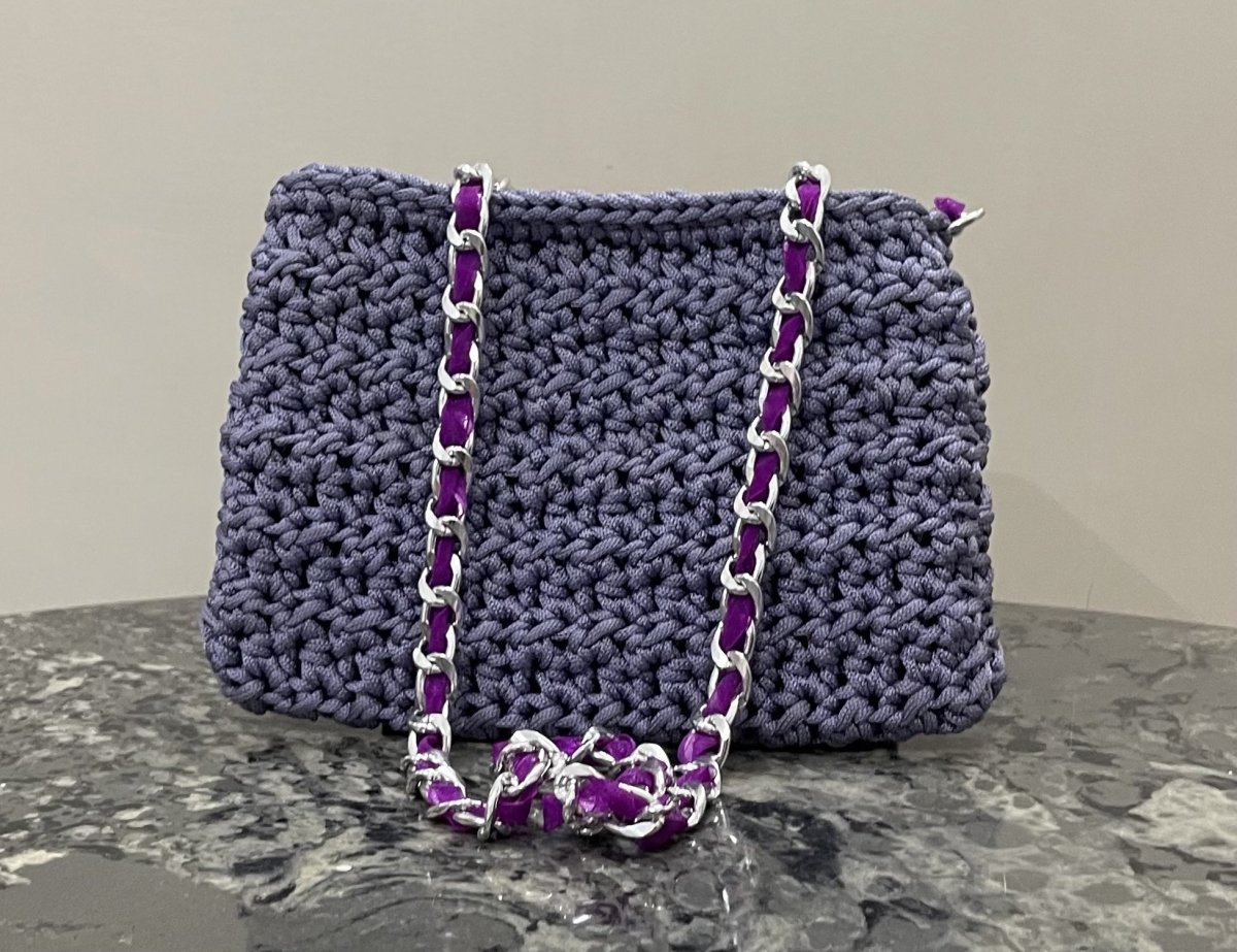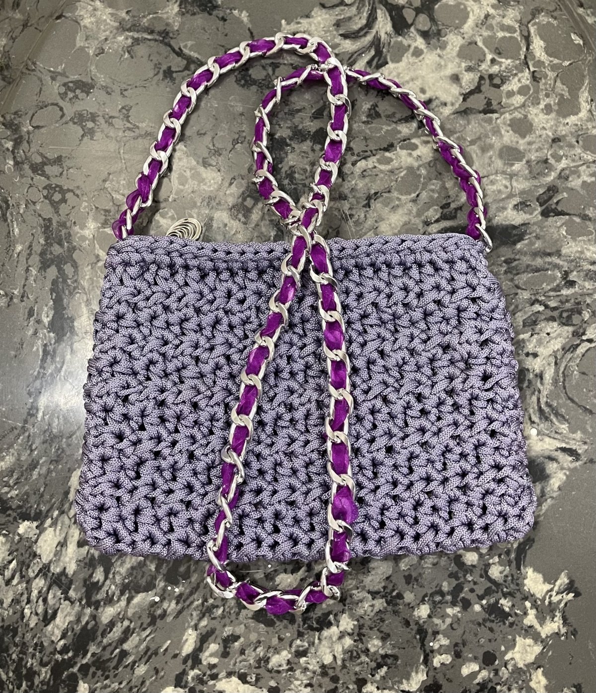 شنطة كروشيه بغرزة مميزه بخيط مكرمية سلسلة مزوده بسوسته للغلق وبطانه داخليه مع حزام فضى بخيط الأورجانزا