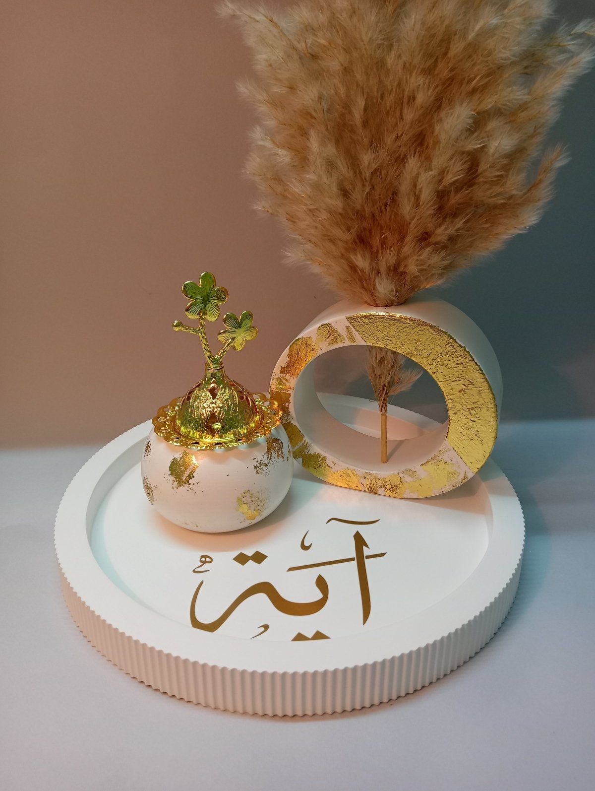 طقم ترندي مكون من صنيه مقاس 25 وفازه مفرغه ومبخره مطعم بورق الدهب بالاسم