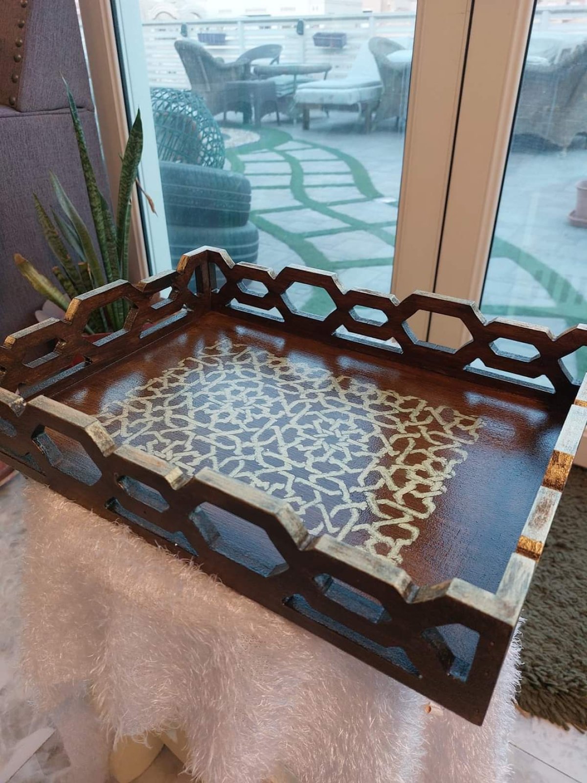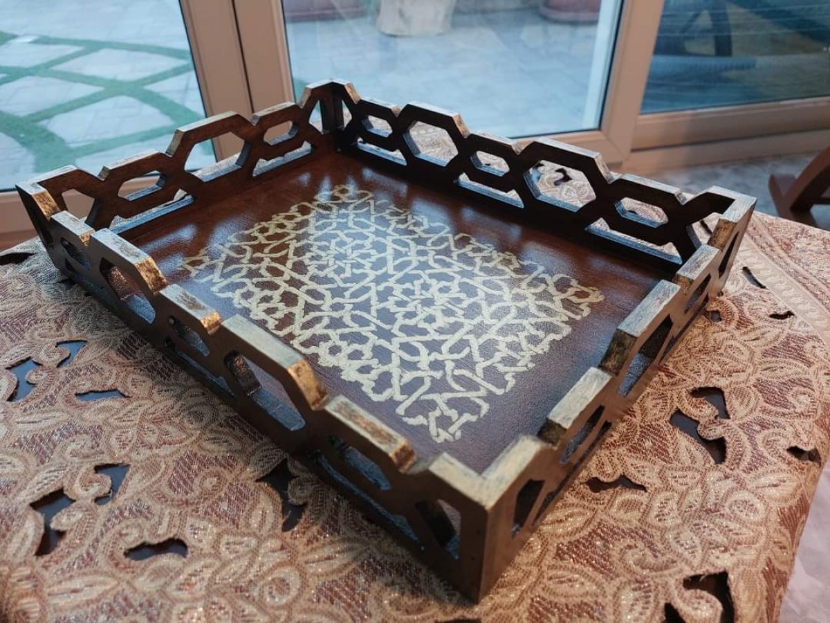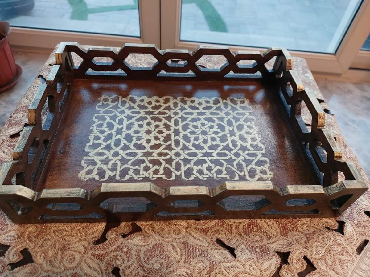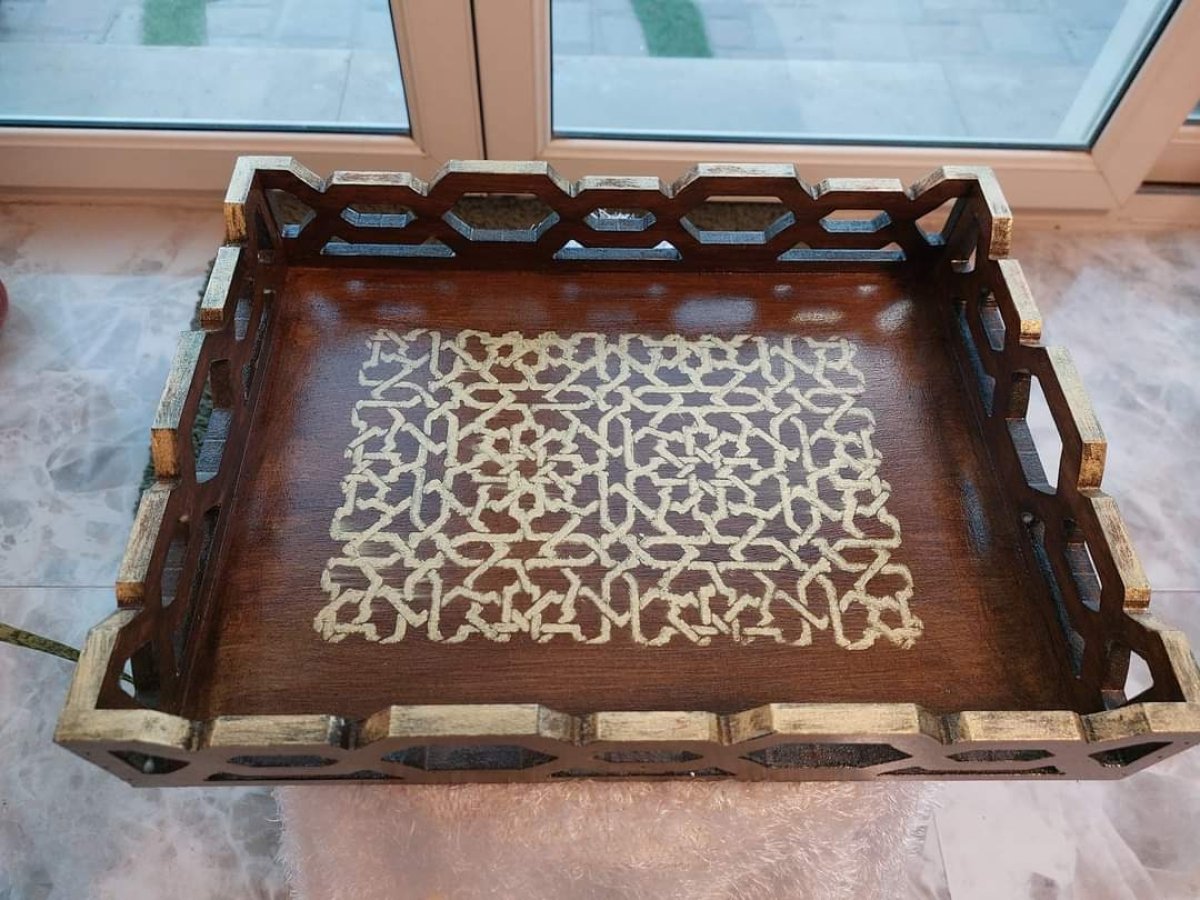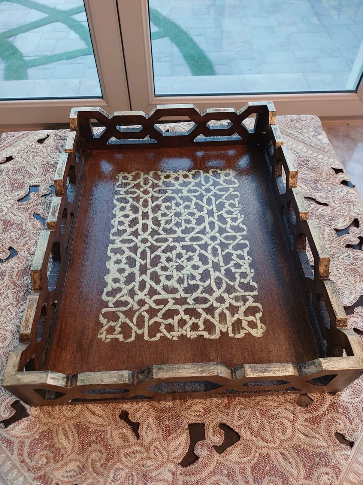 صنيه خشب تقديم هاند ميد بشكل ولون الخشب الطبيعى عليها زخارف اسلاميه باللون الذهبى 30×40