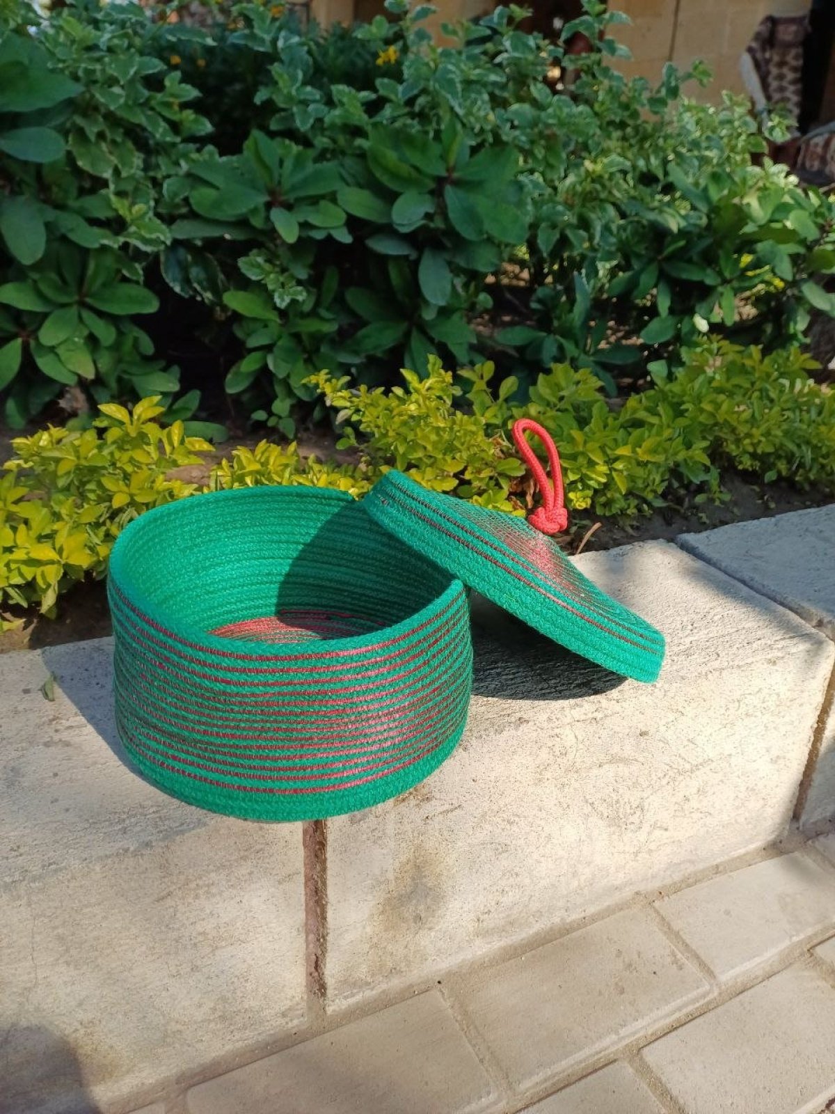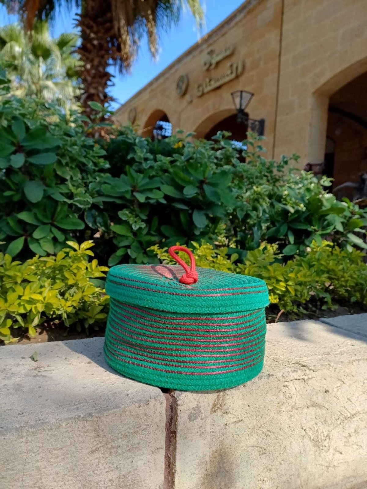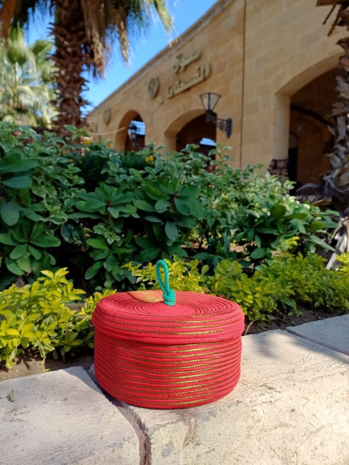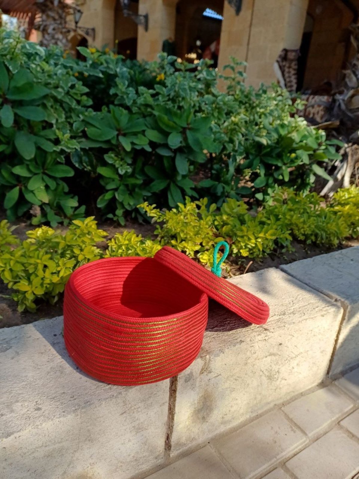 بوكس الكريسماس مصنوع من حبال القطن الطبيعي صديق البيئة خفيفة الوزن وكبيرة الحجم من الداخل مقاس ٢٥ سم وارتفاع ١٣ سم متاح باللونين الاحمر والاخضر