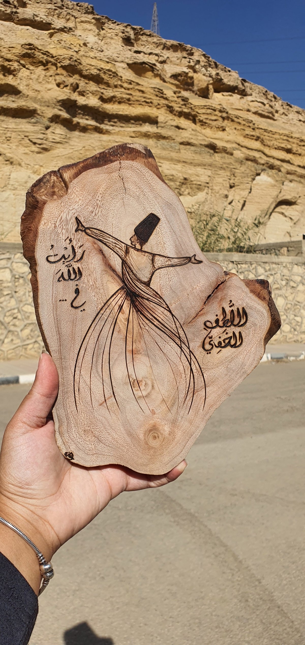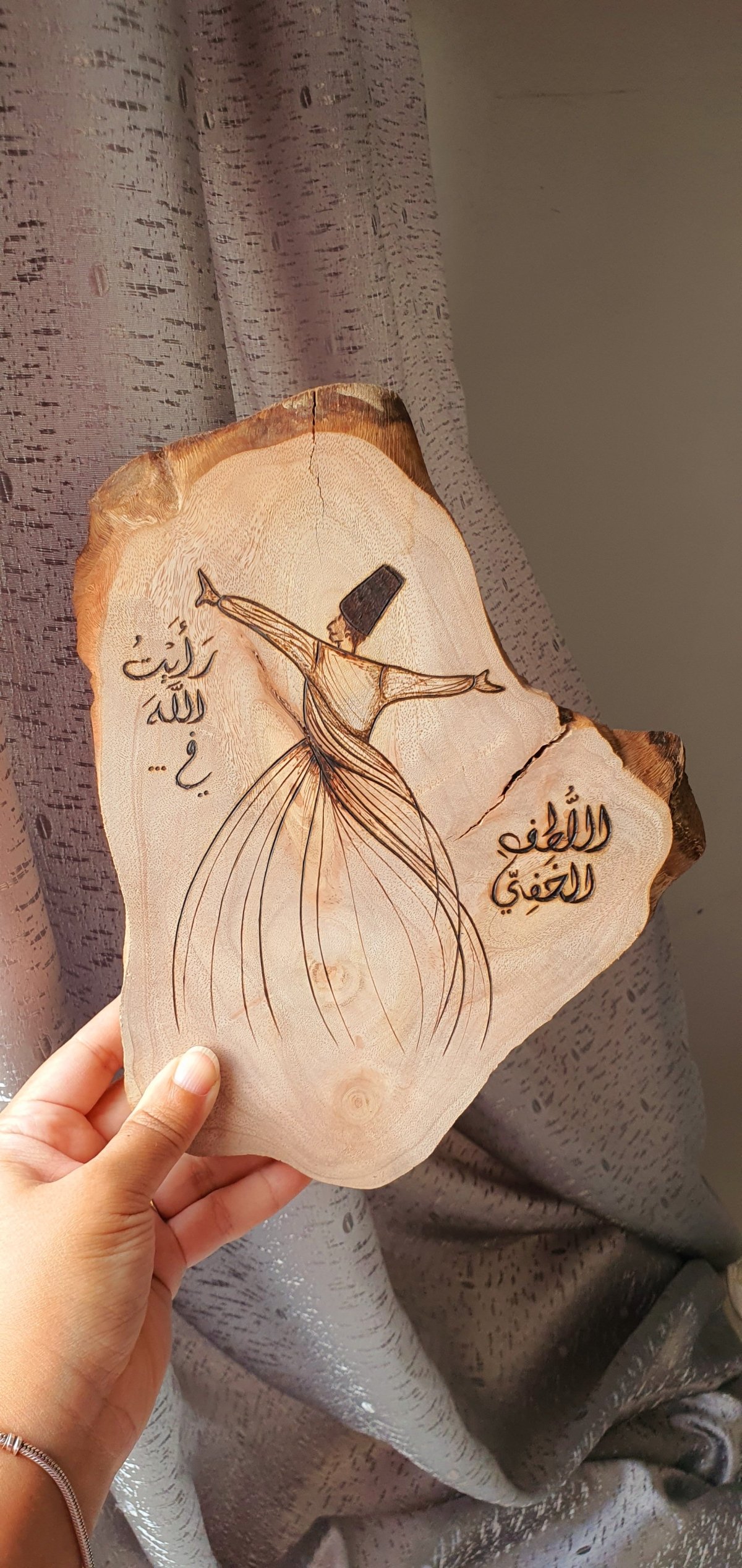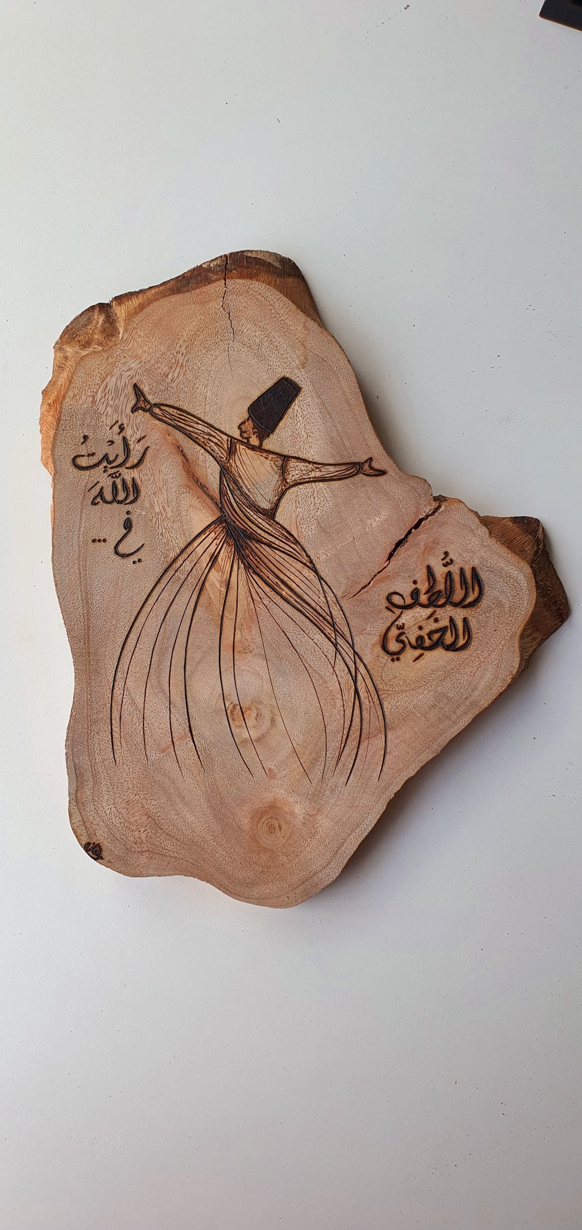 رأيت الله في اللطف الخفي جذع خشب من شجر الكايا، مزين بتصميم فريد، نفَّذناه بفن الحرق اليدوي على الخشب، يمكن تعليقه على الحائط لإضافة لمسة فنية دافئة إلى غرفتك أو منزلك. الأبعاد: ارتفاع حوالي ١٨ سم، عرض حوالي ١٢ سم، سمك ٢ سم