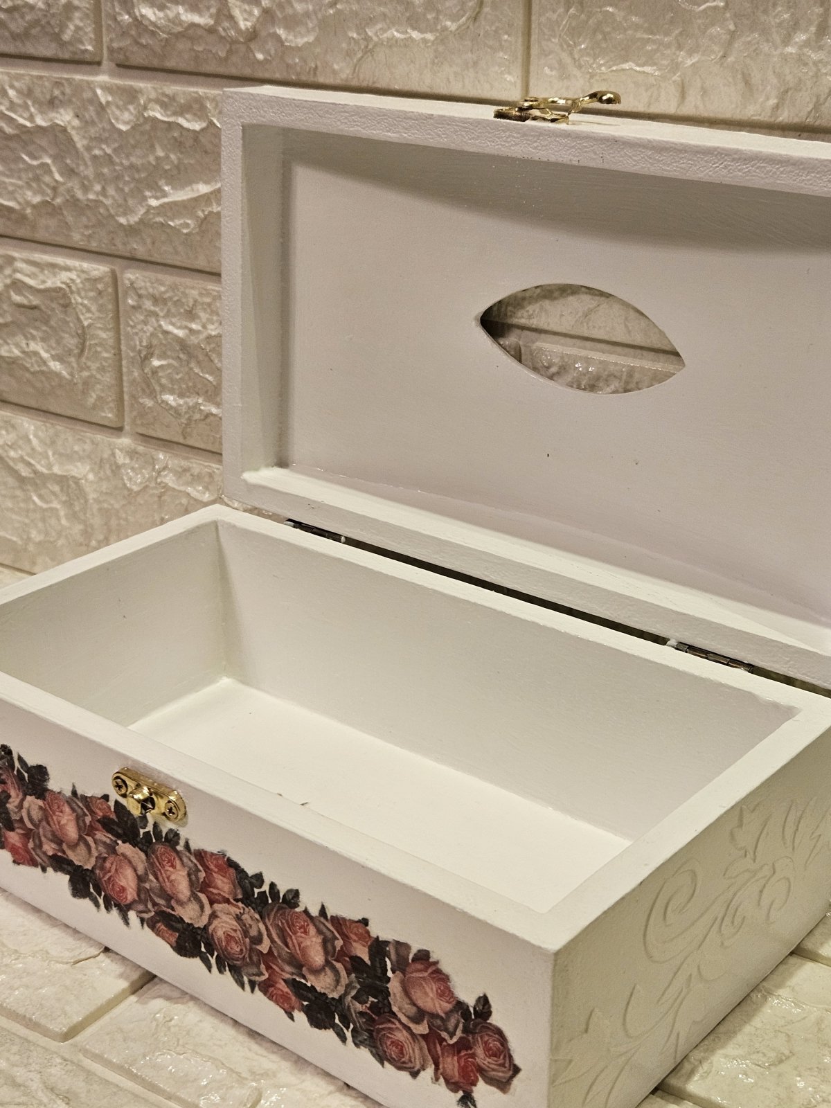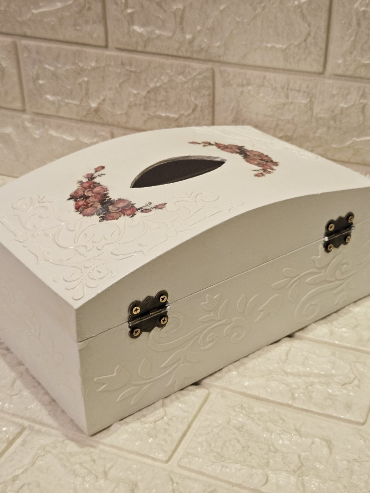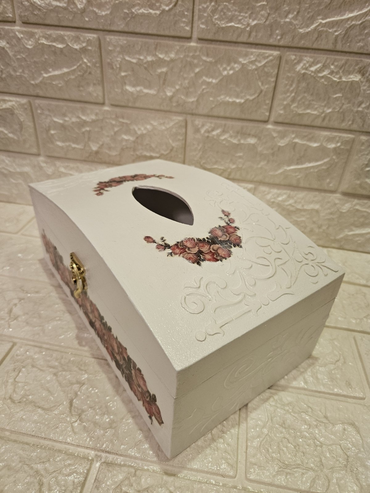 علبه مناديل خشب هاند ميد بشغل بارز ٢٦ ×١٥ بقفل