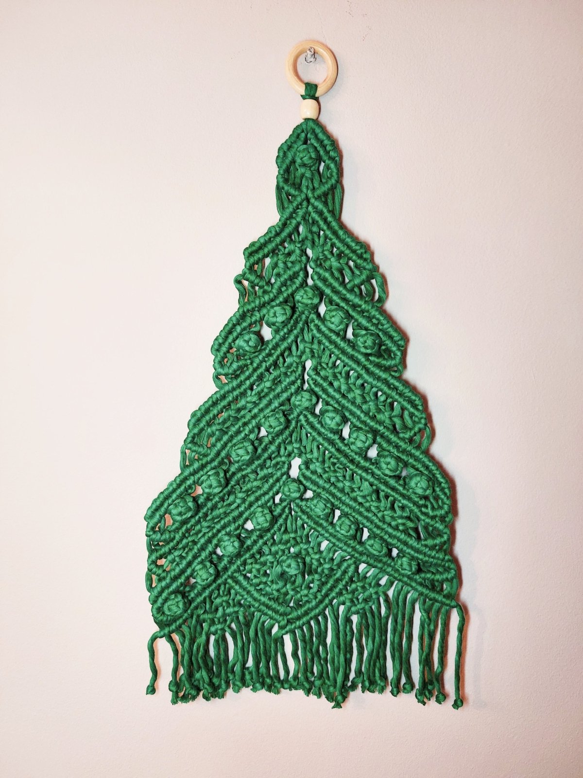 شجرة الكريسماس مكرميه اللون .في الاعلي حلقه ٤سم ، مصنوعه من خيط مكرميه اخضر ، وخرزه. طول المعلقه ٦٠ سم × عرض ٣٠سم