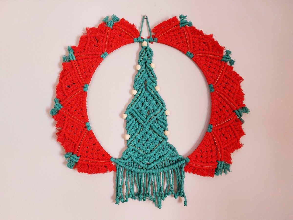 تاره شجرة كريسماس مكرميه. مصنوعه من خيط محلول احمر و أخضر، ٩ خرزات، طول ٥٧ × عرض ٥٥