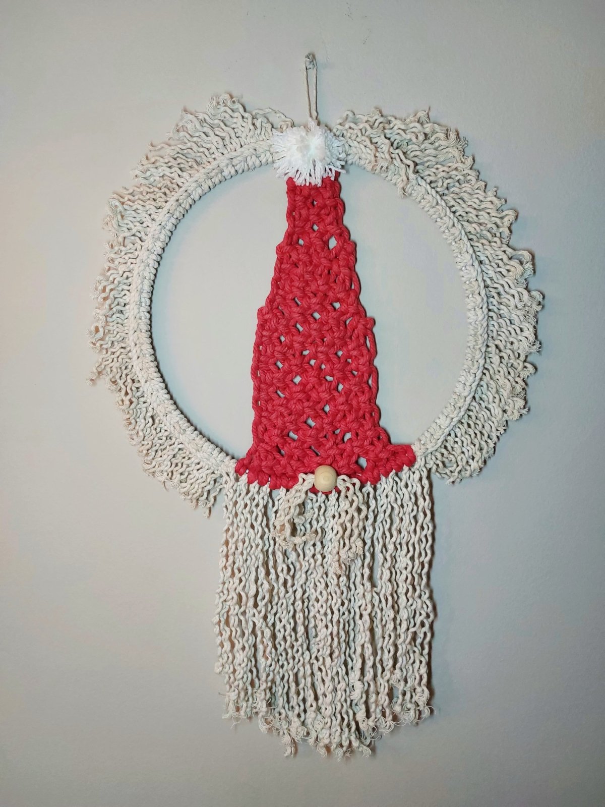 طاقيه بابا نويل , مستخدم خيط مجدول ابيض و محلول احمر، تاره ٤٠ سم ، خرزه . العرض ٥٠ × ٦٥ سم بعد الشغل