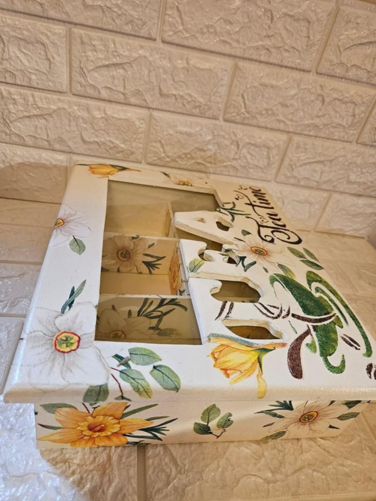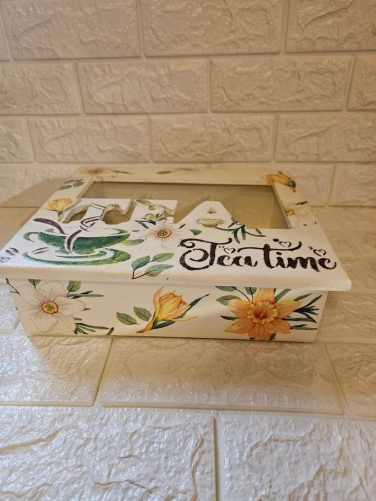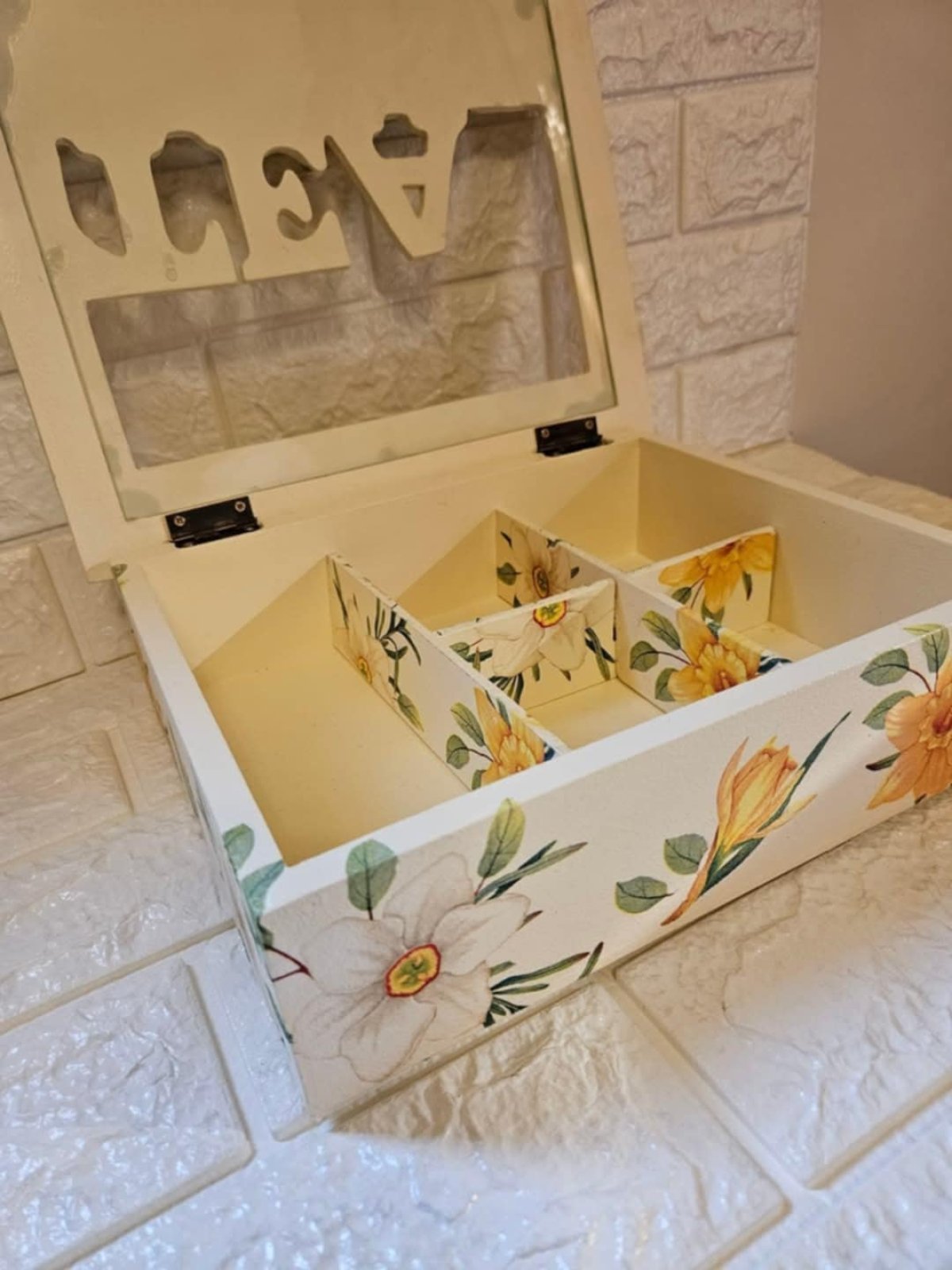علبه تى باج ٥ عيون هاند ميد خشب هاند ميد بشغل بارز ٢٥ ×٣٠ والارتفاع ١٥ سم والغطاء بزجاج شفاف