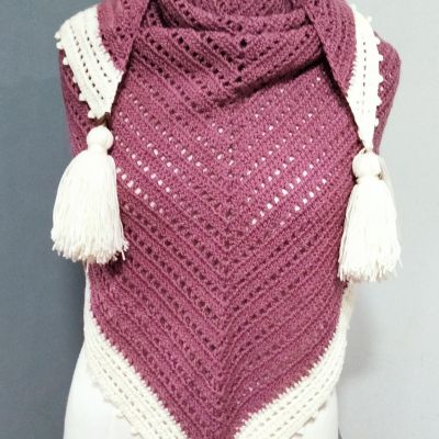 شال صوف مثلث هاند ميد كروشيه. الالوان : كشمير مع حواف اوف وايت شال أنيق ومتميز سمك الشال رقيق جدا ومريح في الاستخدام . الخامة : صوف اليزا بيبي المقاس : ١٤٠*٩٠