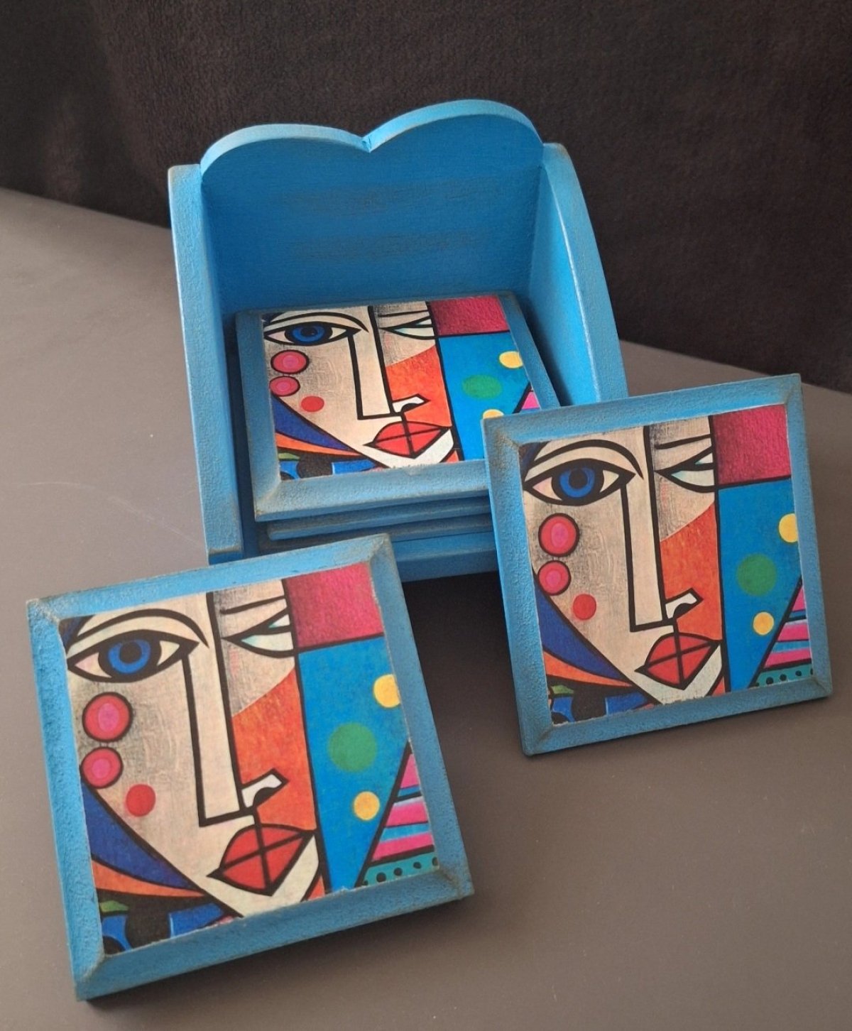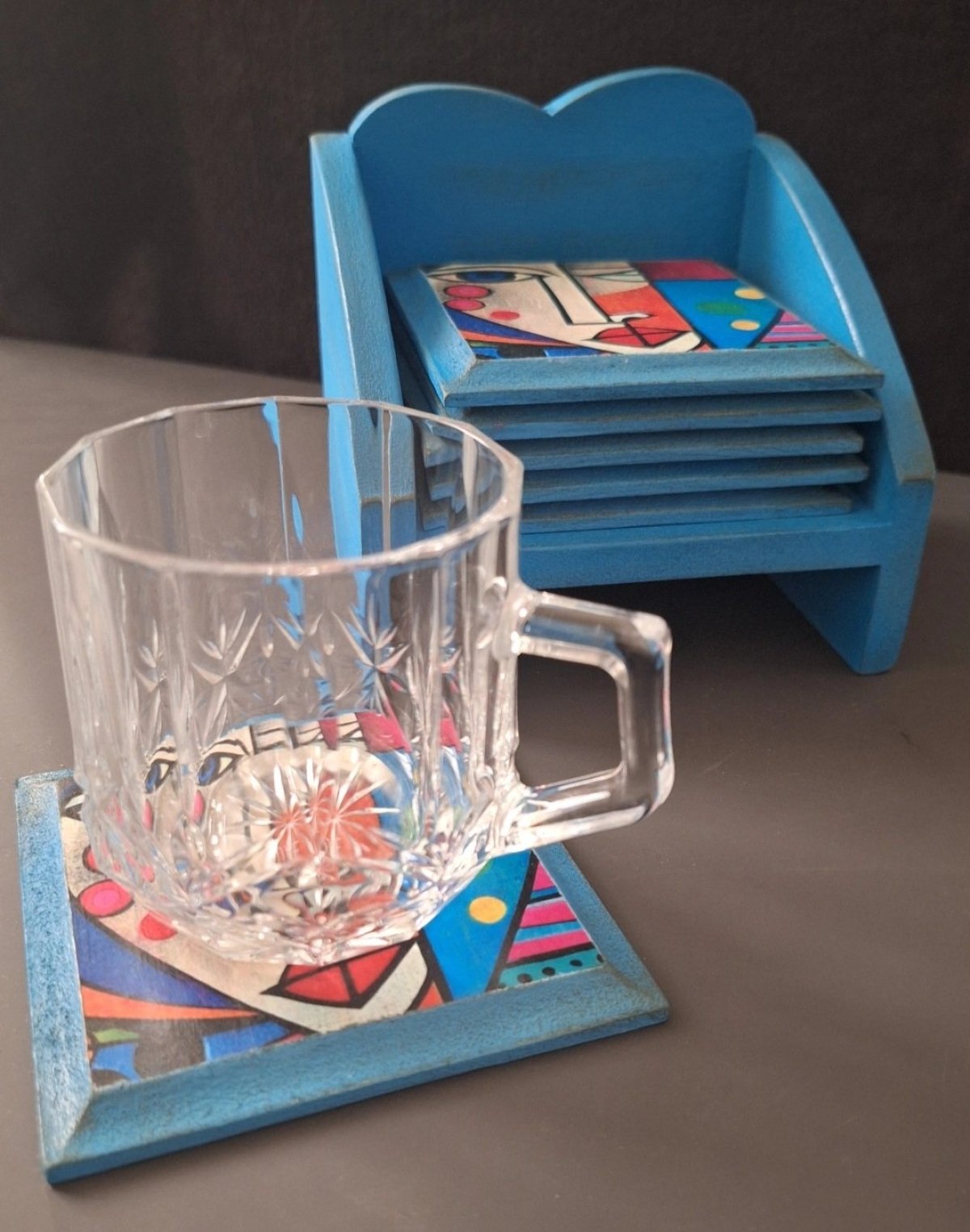 طقم كوسترز مودرن من الخشب مربع الشكل مكون من ٦ كوستر مقاس ١٠ فى ١٠ والحامل على شكل كرسى