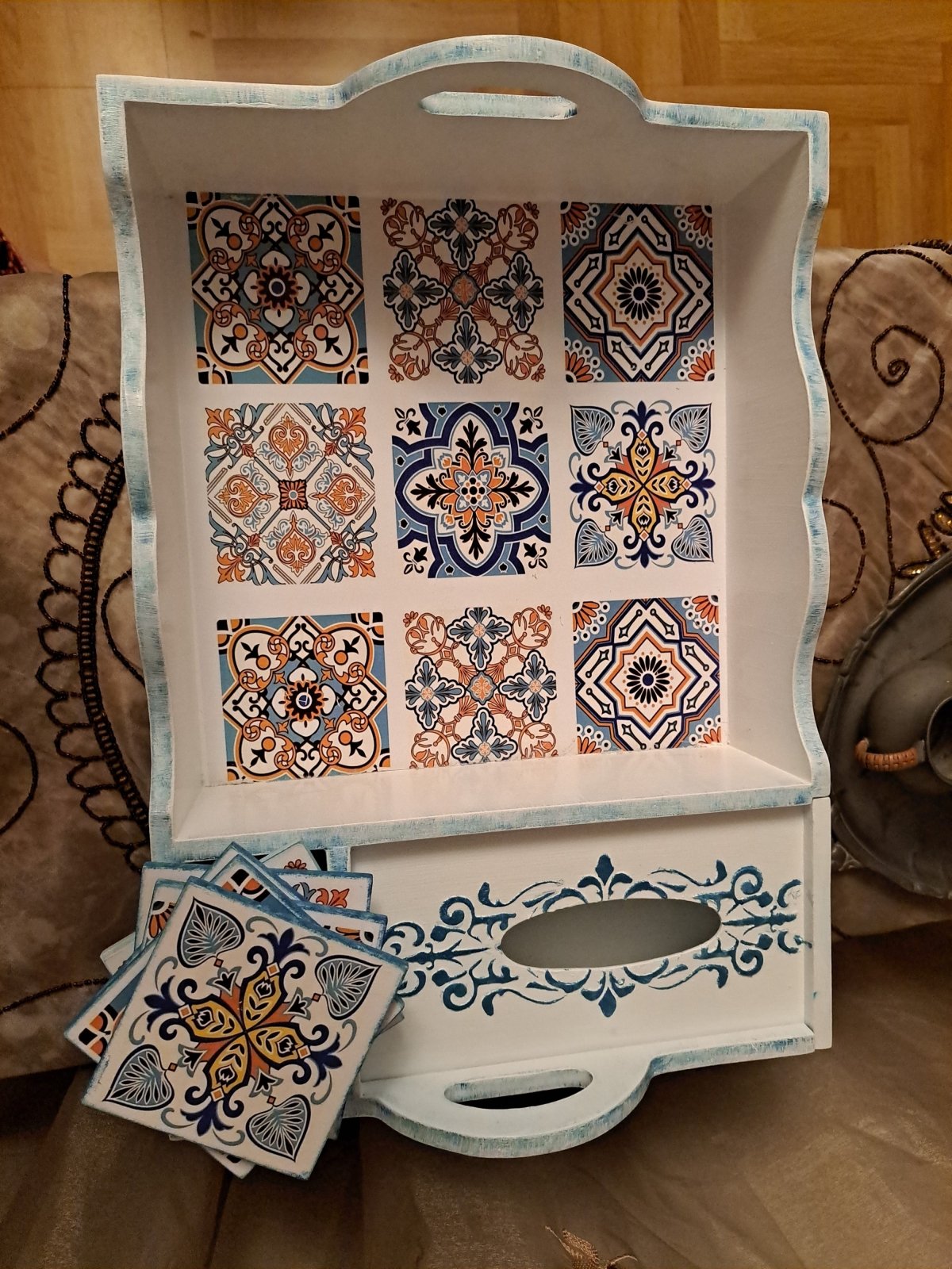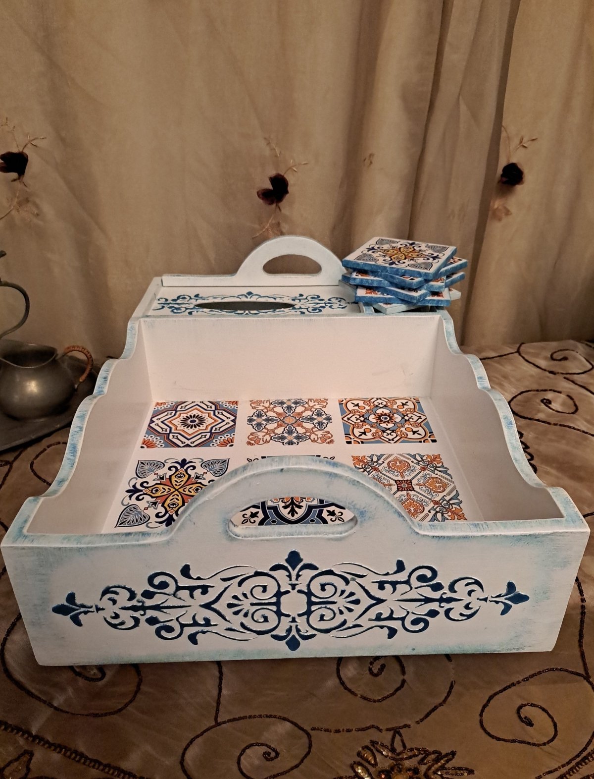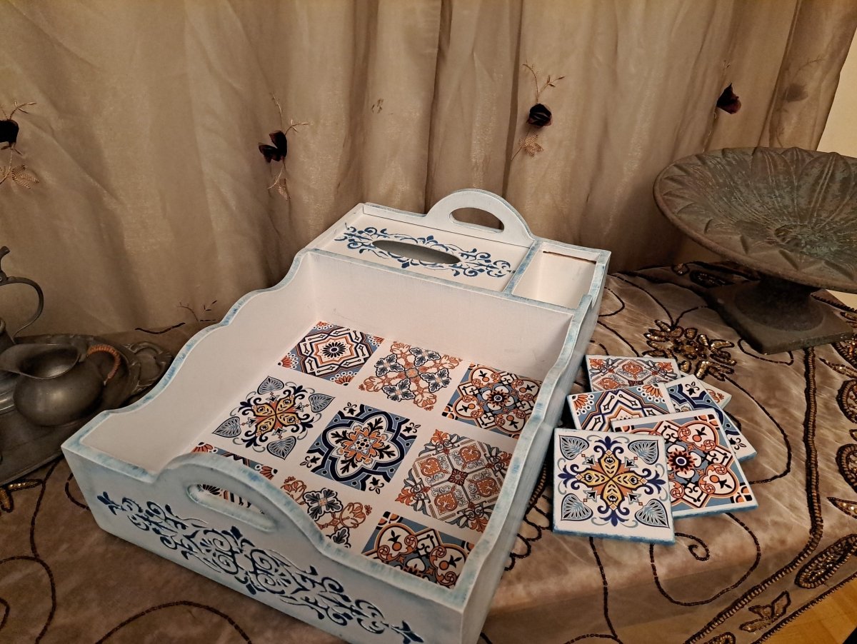 صينية مركزية خشبية مقاس 35×45 مكان لعلبة المناديل مع 6 كوستر تصميم اندلسى بدرجات اللون الأزرق تم تزيين الصينية من الخارج بالوان اللاكية المائى المميز بعامل حماية واشكال اندلسية بارزة مع تعتيق بسيط وتداخل بين الازرق والابيض وتم تزيين غطاء علبة المناديل برسم بارز وتعتيق باللون الازرق