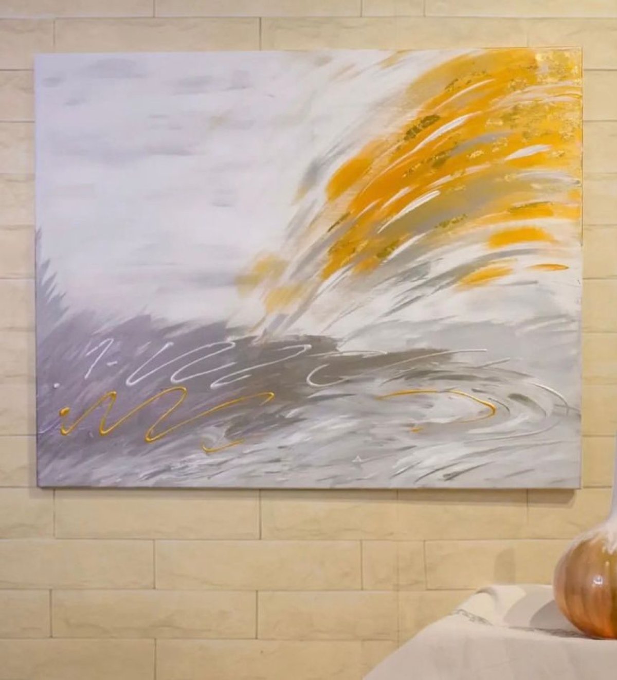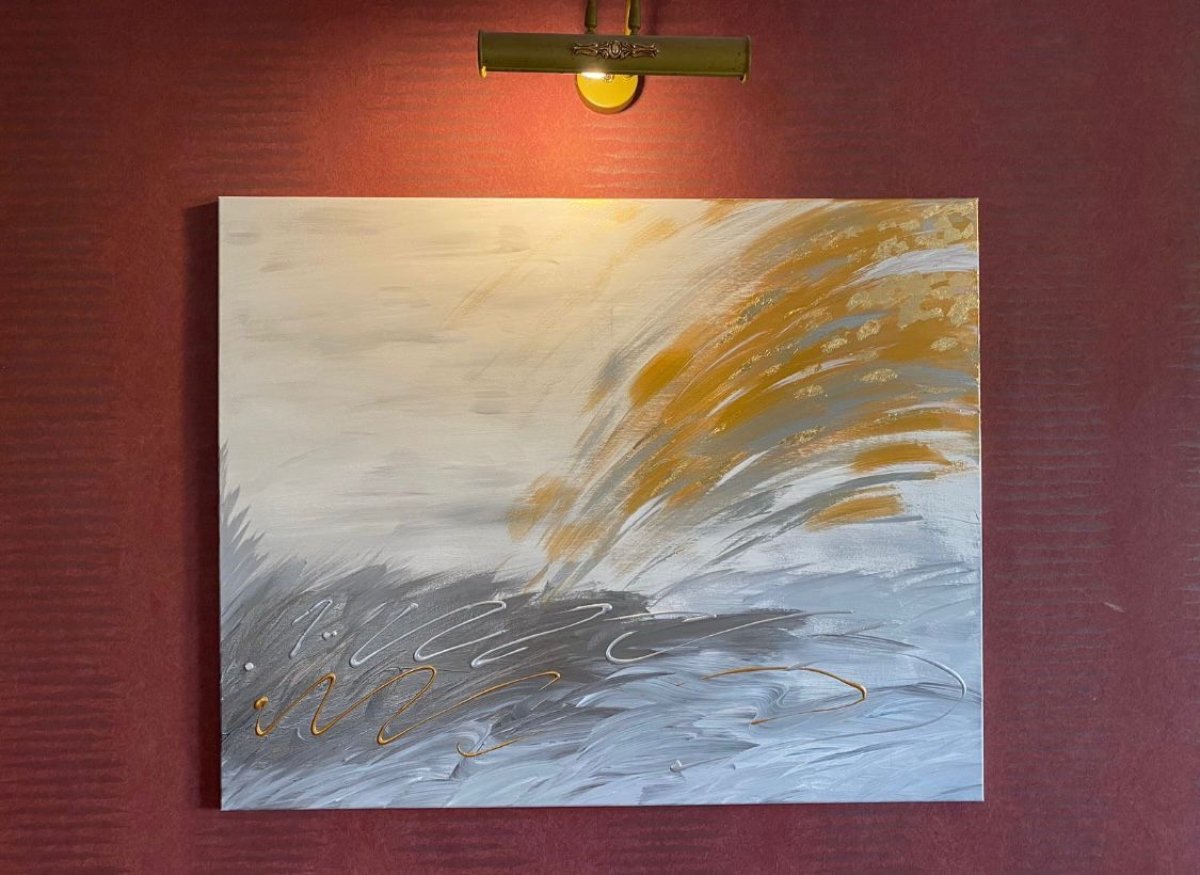 *"Lines of Silver and gold" 100*80 تتميز هذه اللوحة بريشة زرقاء زاهية مزينة بخطوط لامعة من الفضي والذهبي. تبرز تركيبة الريشة على خلفية فاتحة ومحايدة، مما يخلق نقطة تركيز أنيقة ولافتة.
