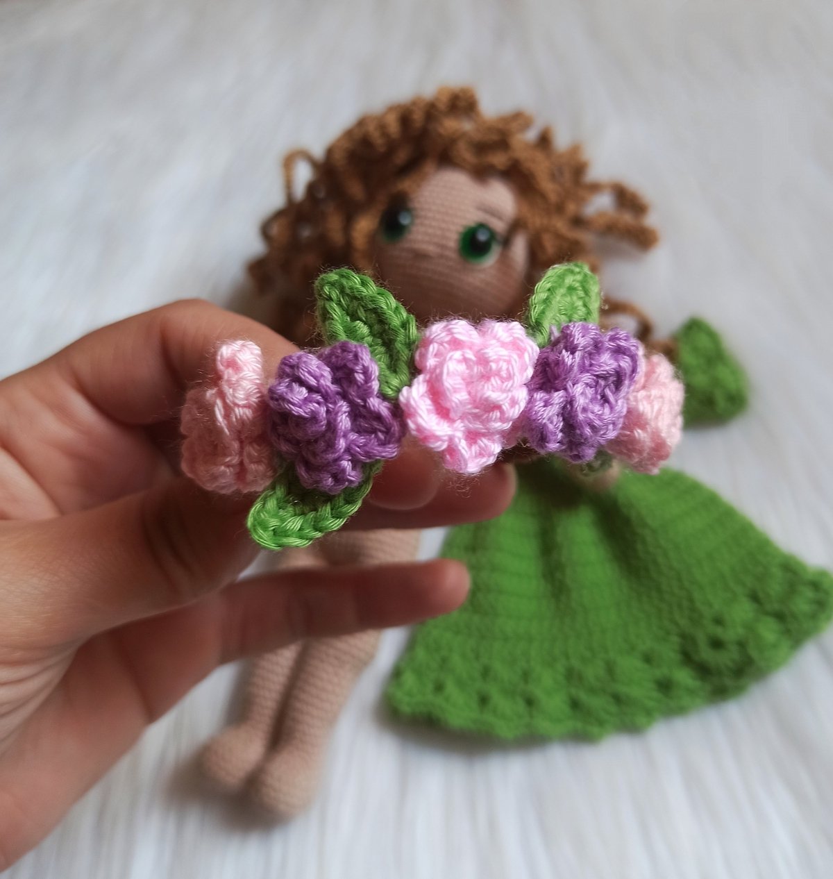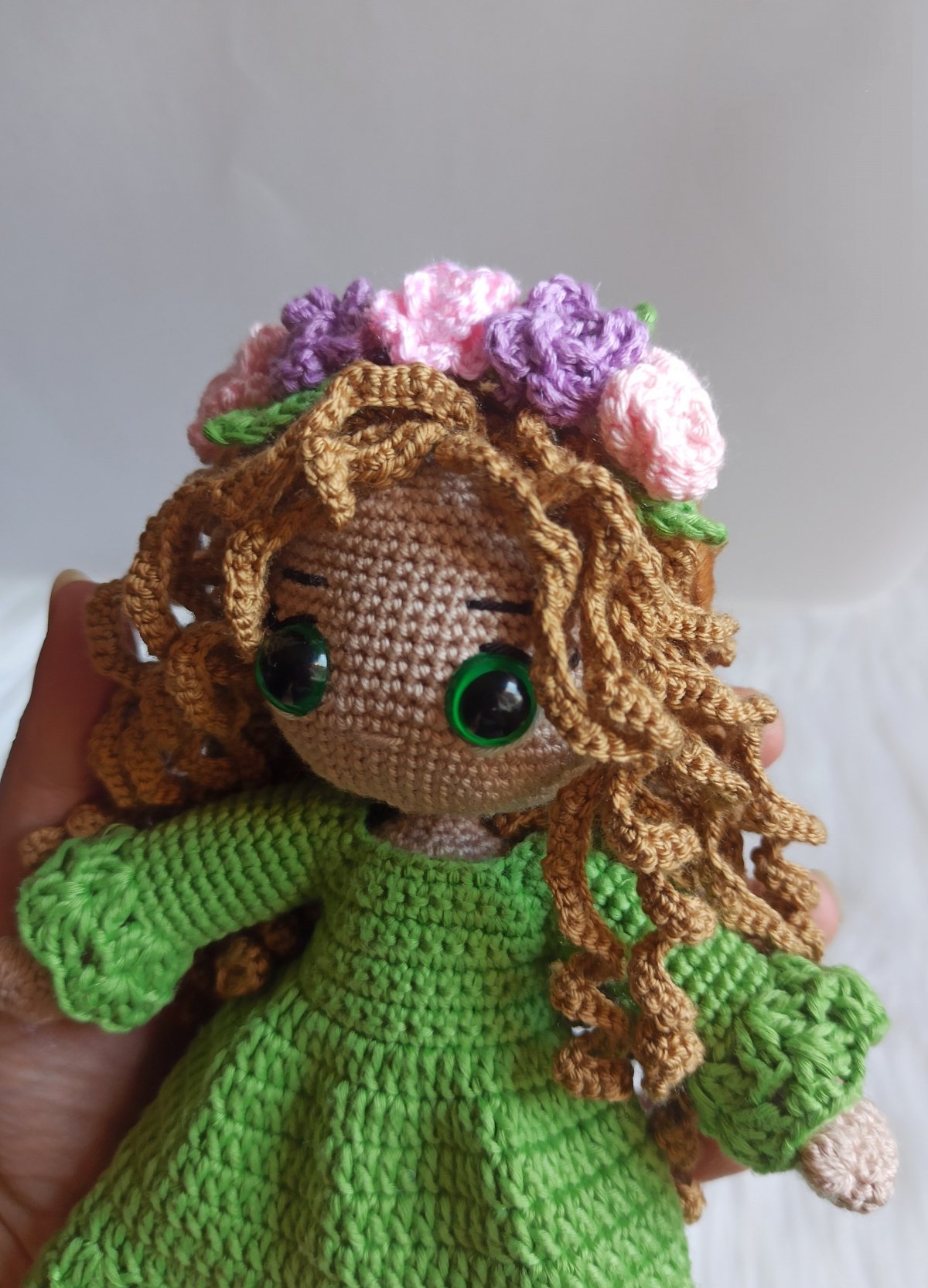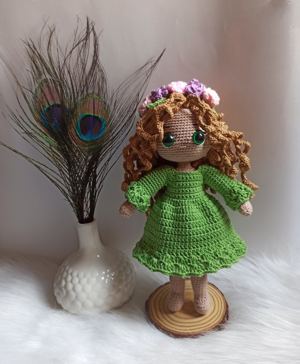 Crochet doll. Woven with the finest yarn. With curly hair and a delicate green dress. Separate flower wreath. Length 20 cm