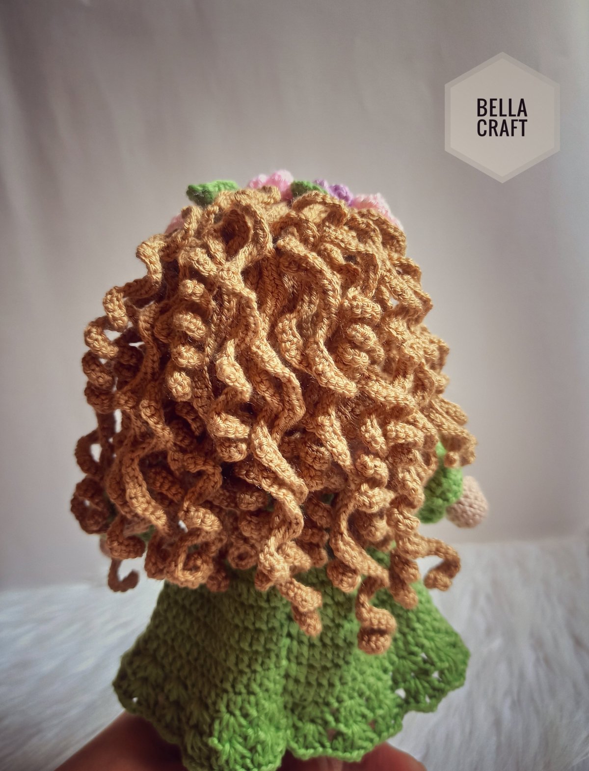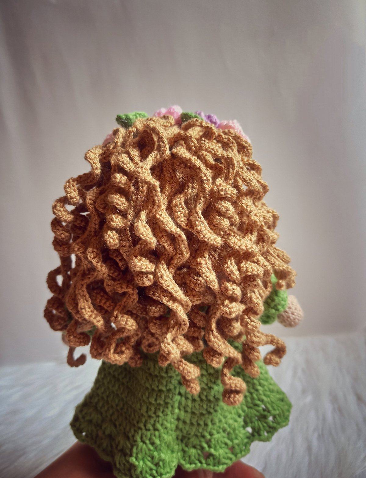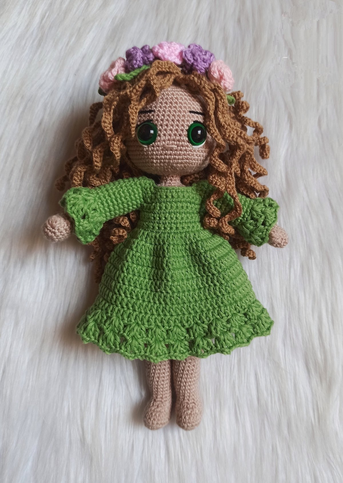 Crochet doll. Woven with the finest yarn. With curly hair and a delicate green dress. Separate flower wreath. Length 20 cm