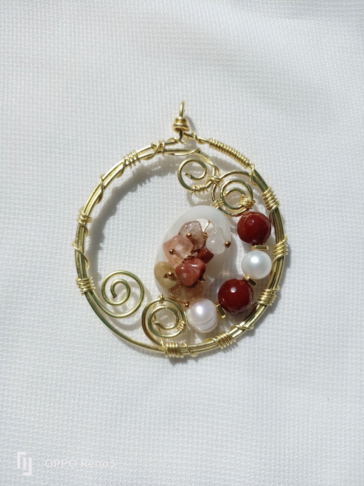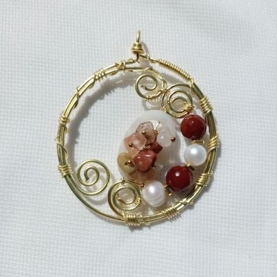 Copper wire handmade pandant with agate stone , Sadaf and natural pearls . circle shape it's diameter is 6 cm .