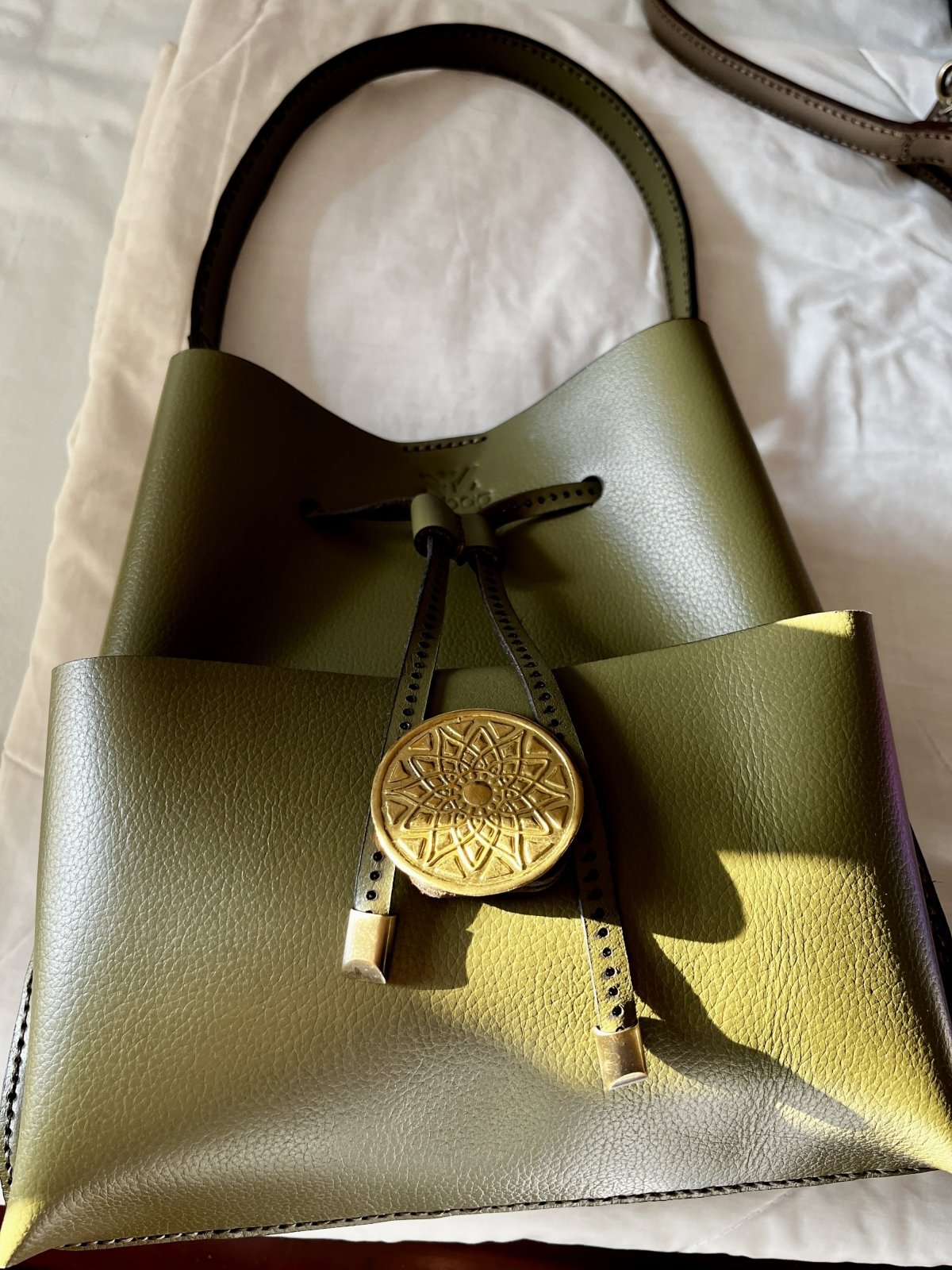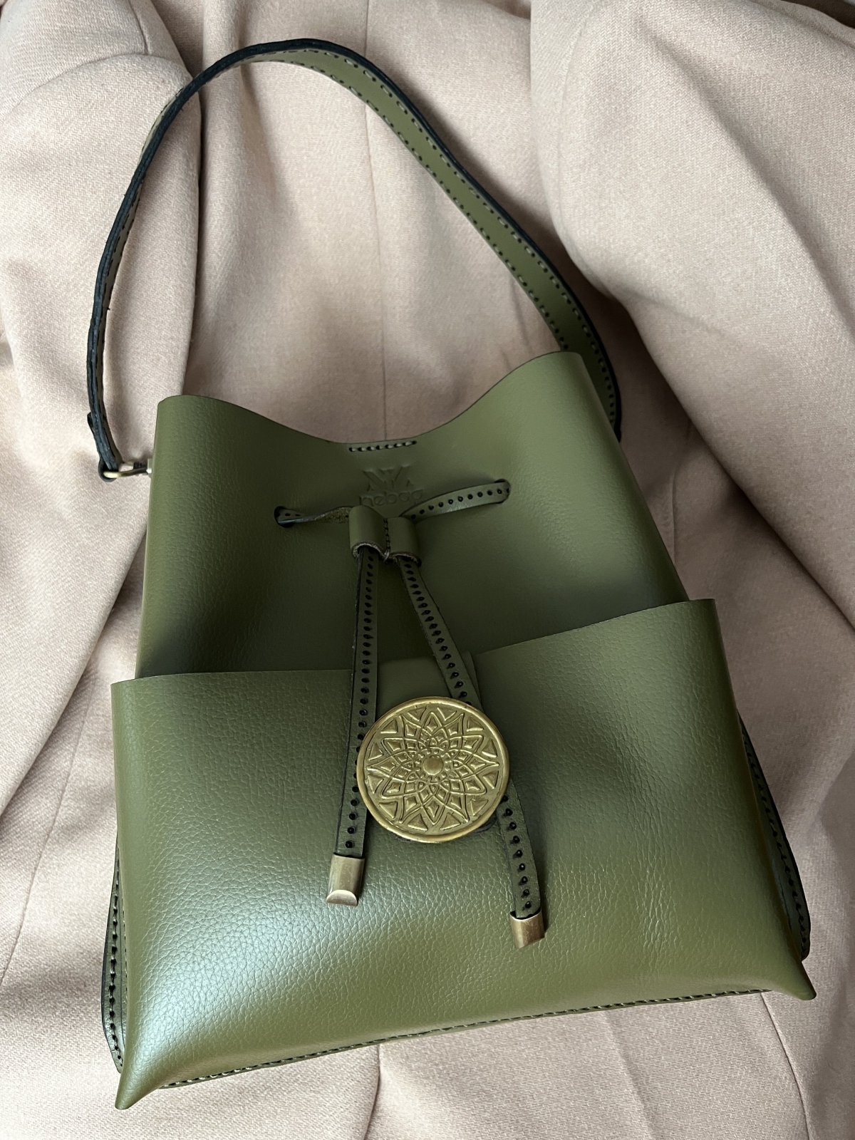 Genuine leather bag in a sophisticated and distinctive color, handmade. Size 27*28*10. Contains an internal pocket with a zipper.