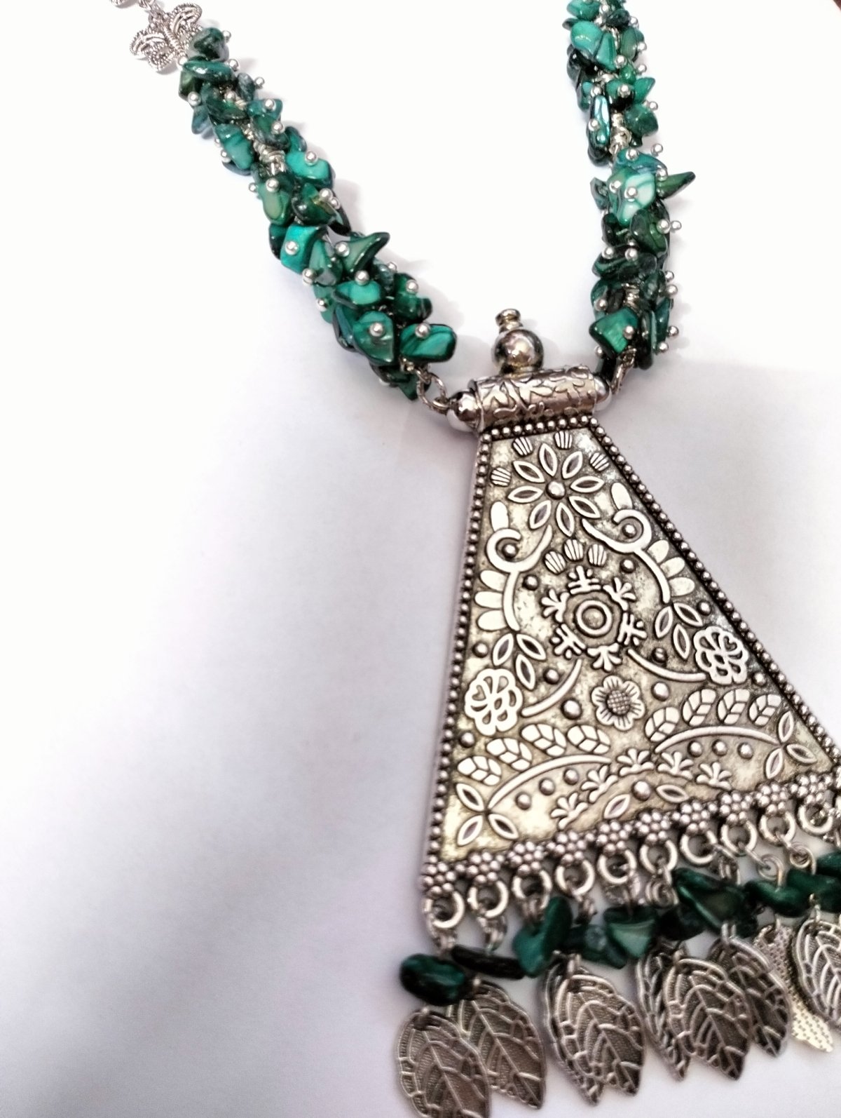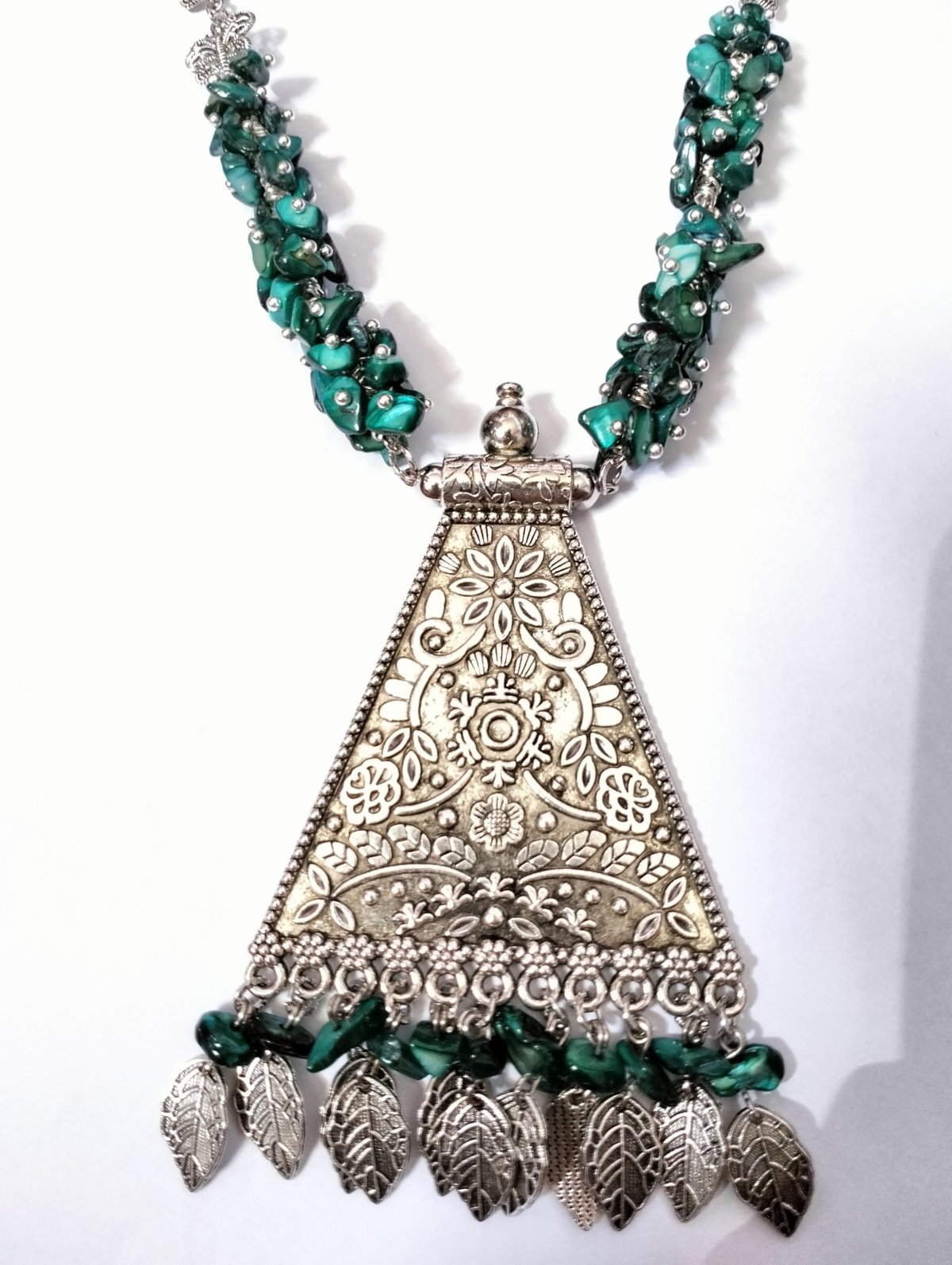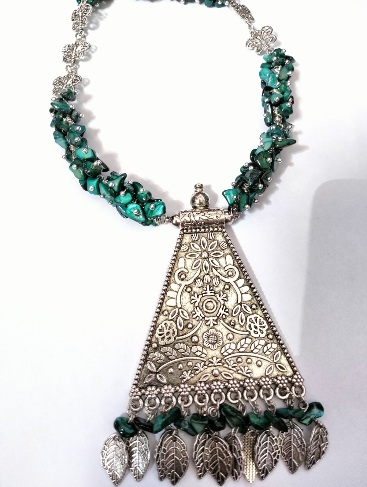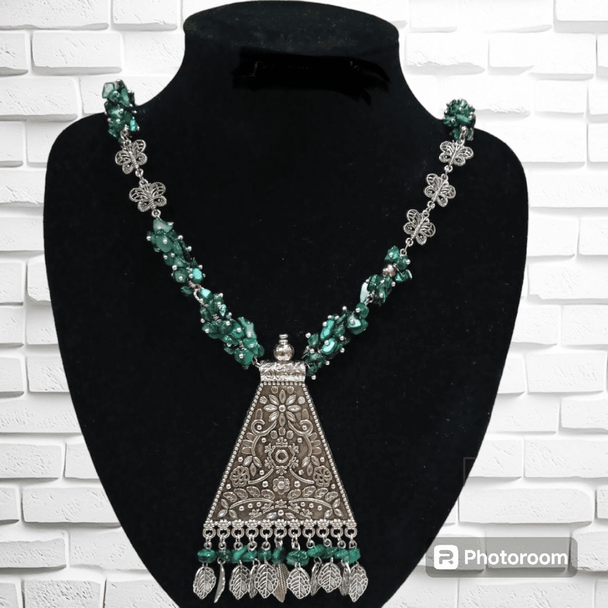 قلادة مصنوعة من حجر العقيق الأخضر، مرصعة بالفراشات مصنوعة من معدن فضي اللون، ومعنى المعدن فضي اللون هو غصن شجرة. طول 43سم