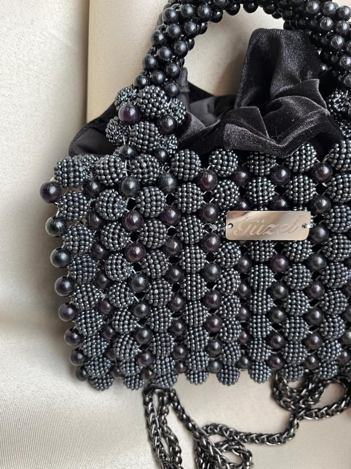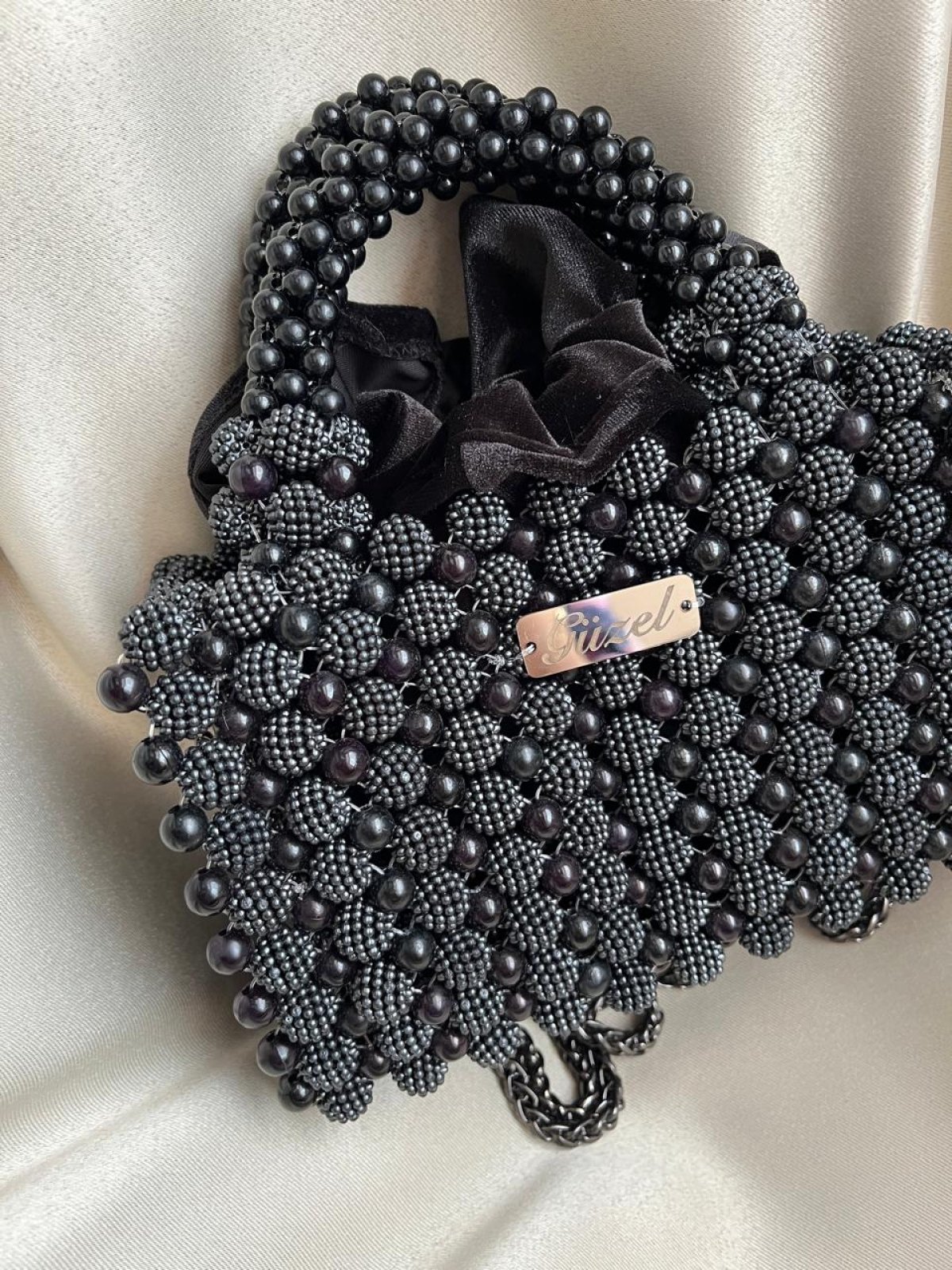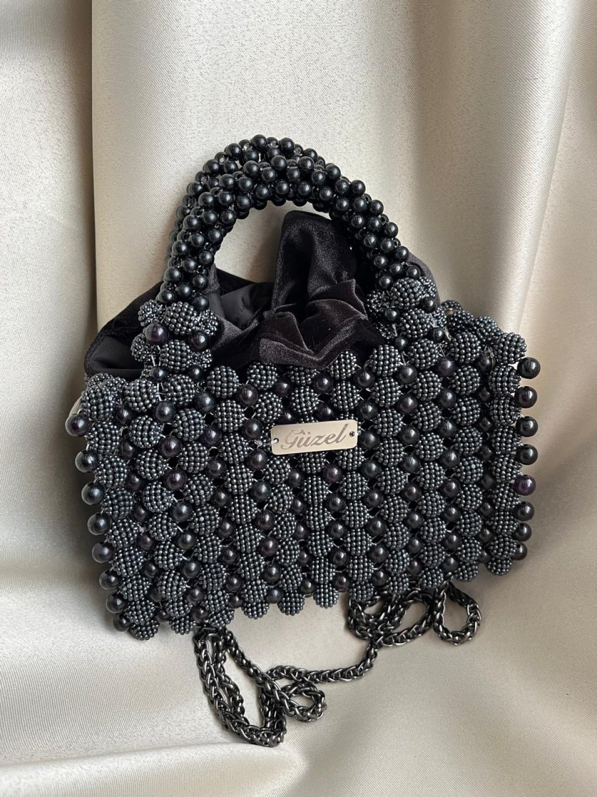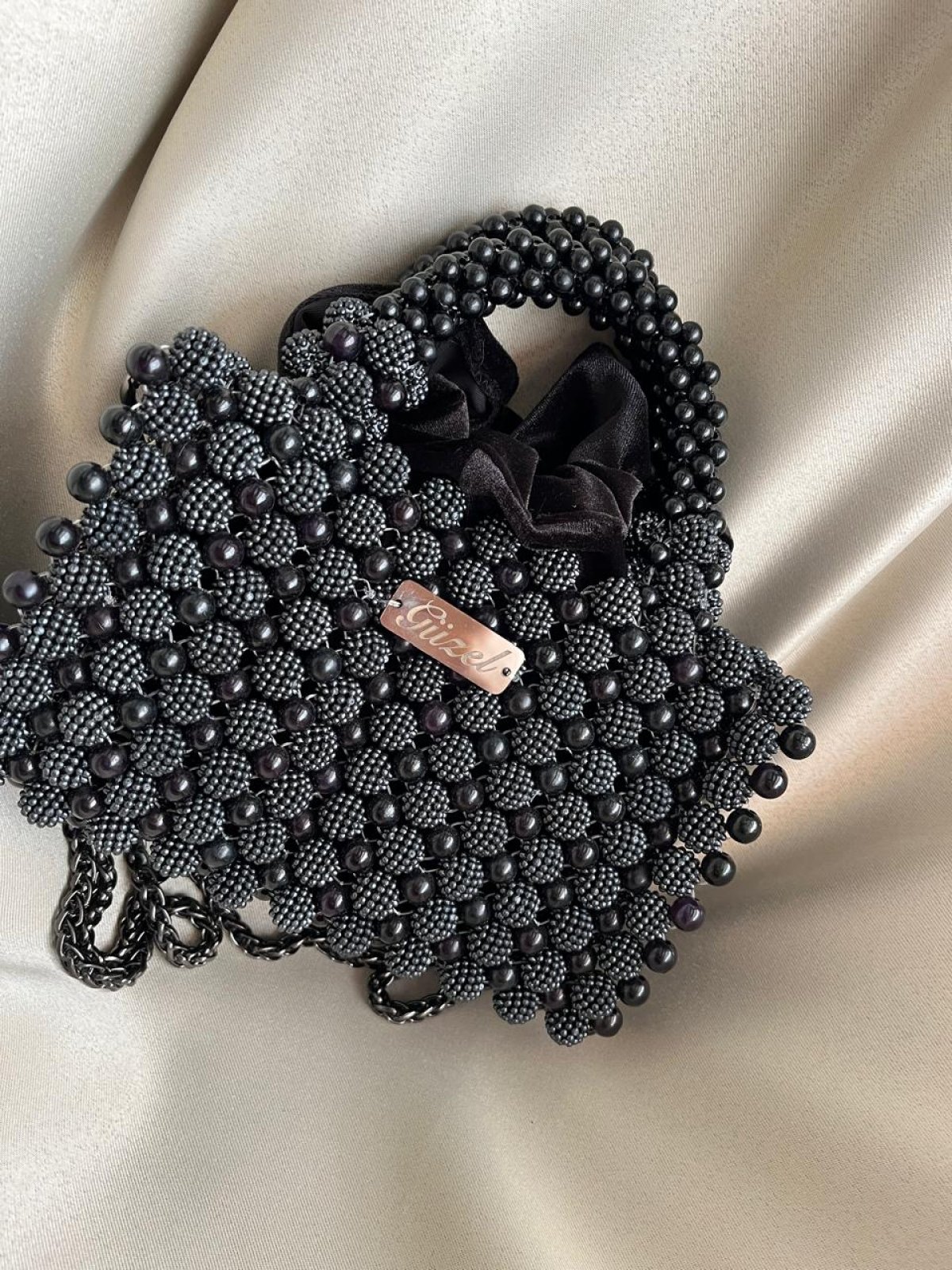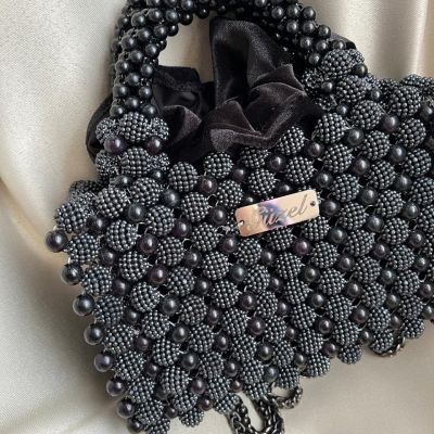 A bag of blackberries decorated with black pearls and has a metal chain measuring 20 cm by 14 cm high.