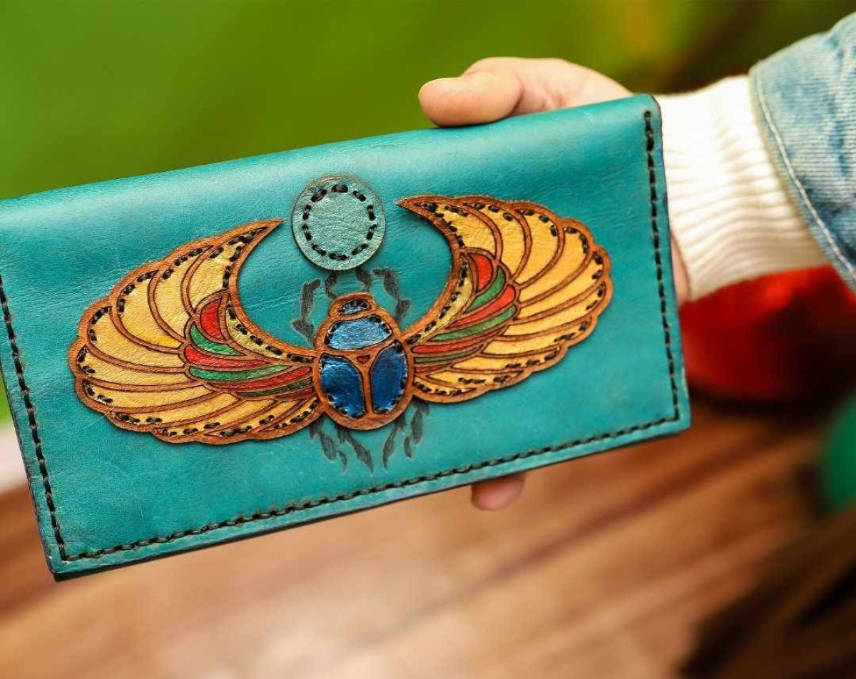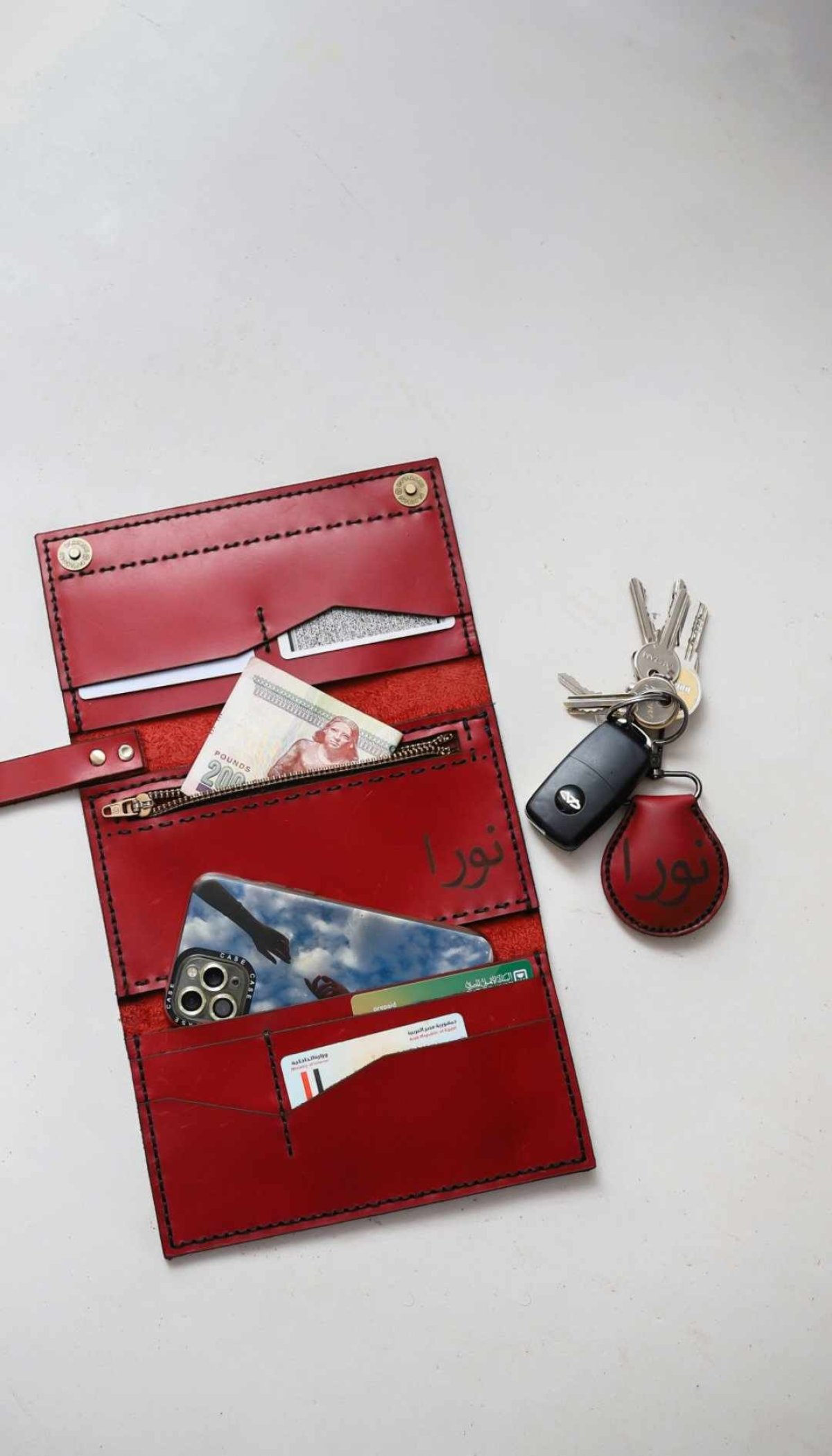 Genuine leather wallet with pockets for cards and money, as well as a zipper pocket Size 22" x 12" and is closed, available in several colors