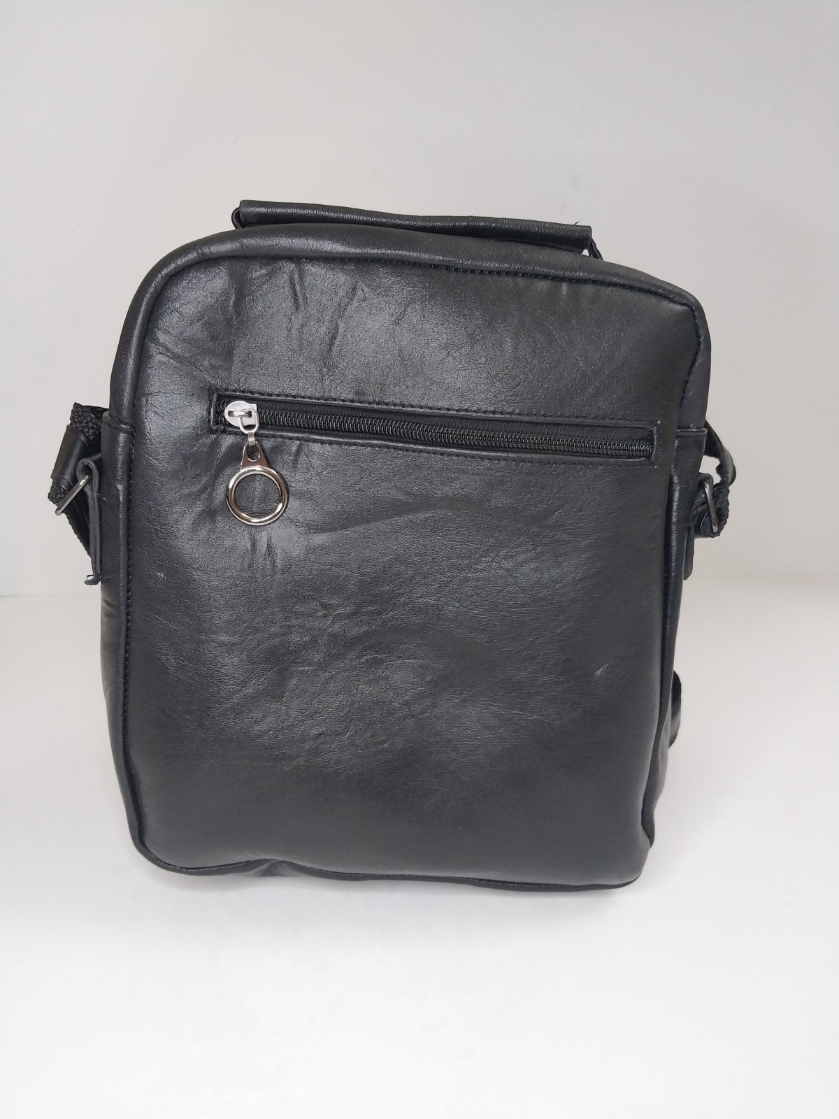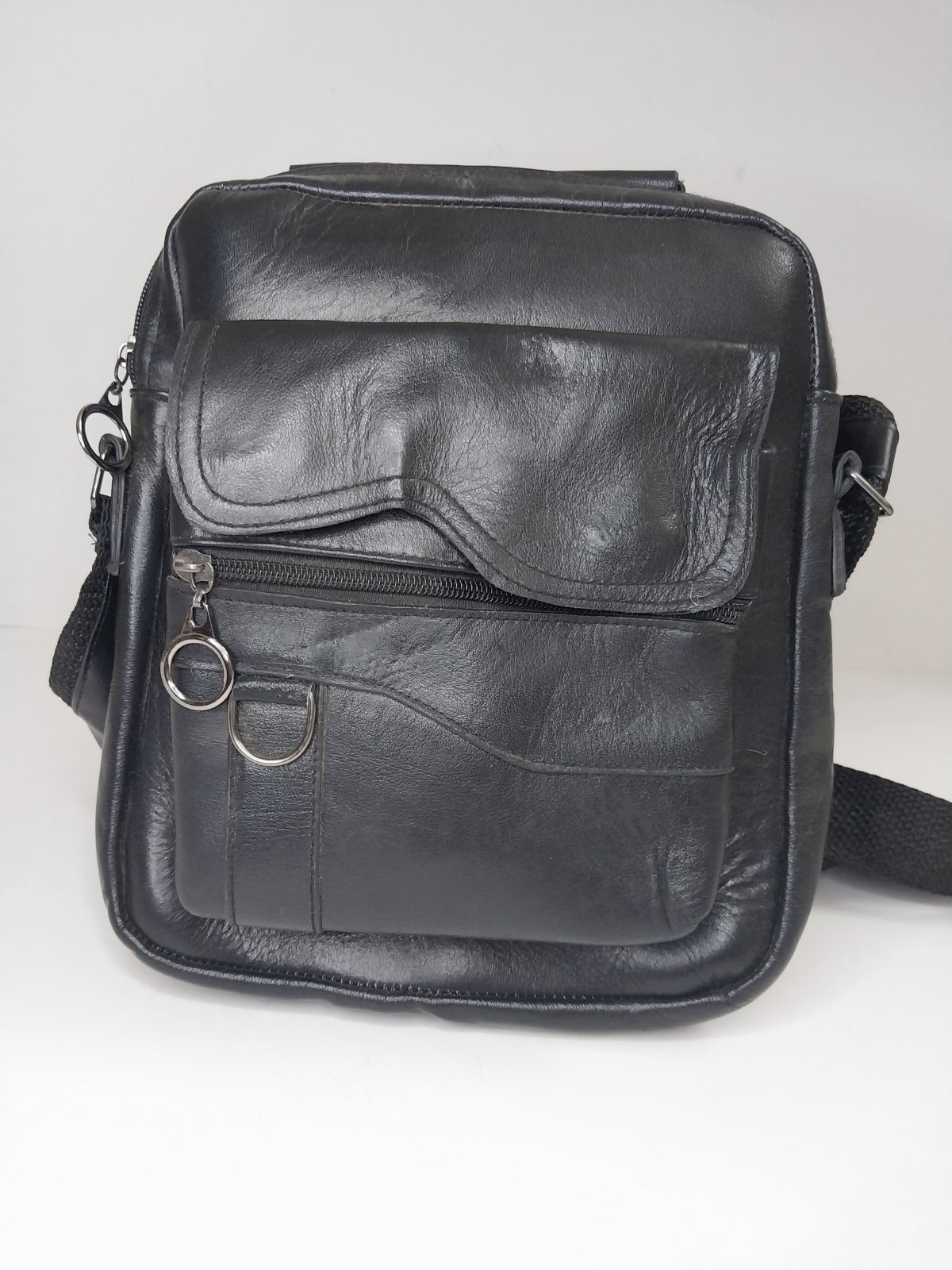 Genuine leather bag... 4 pockets... 2 separate front pockets... 1 zippered pocket... back pocket... leather and fabric handle... black color