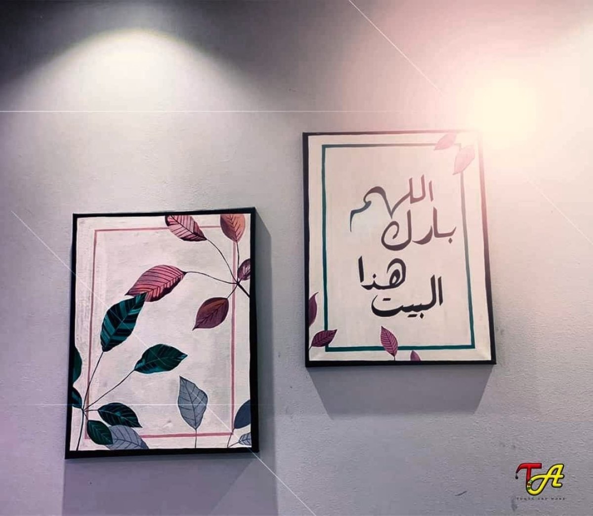 اللهم بارك هذا البيت set two pieces Painting on canvas Decor for your home that will make it stand out with handmade art pieces that you will not find anyone else like them even if they were executed like them Size 30*40 Different sizes are available according to different prices Acrylic colors coated with a layer of varnish to protect the colors