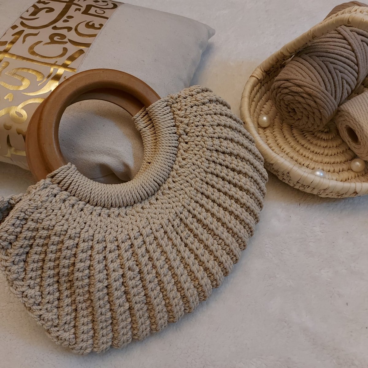 Beige handmade bag made of cotton macrame thread, unlined, with a wooden handle and a long handle made of the same thread.