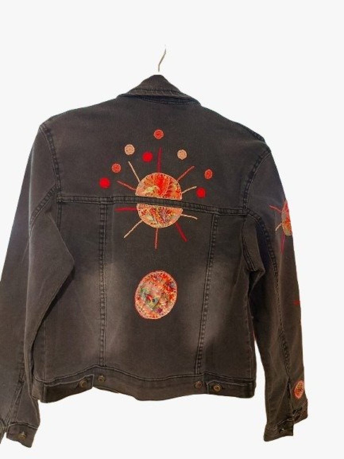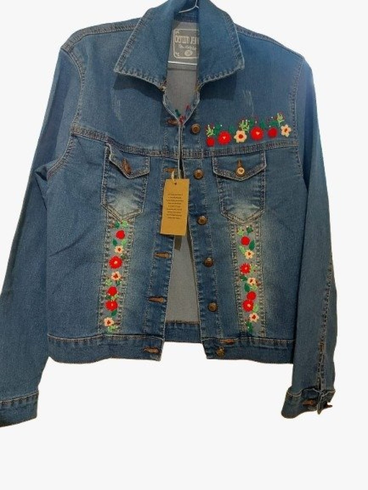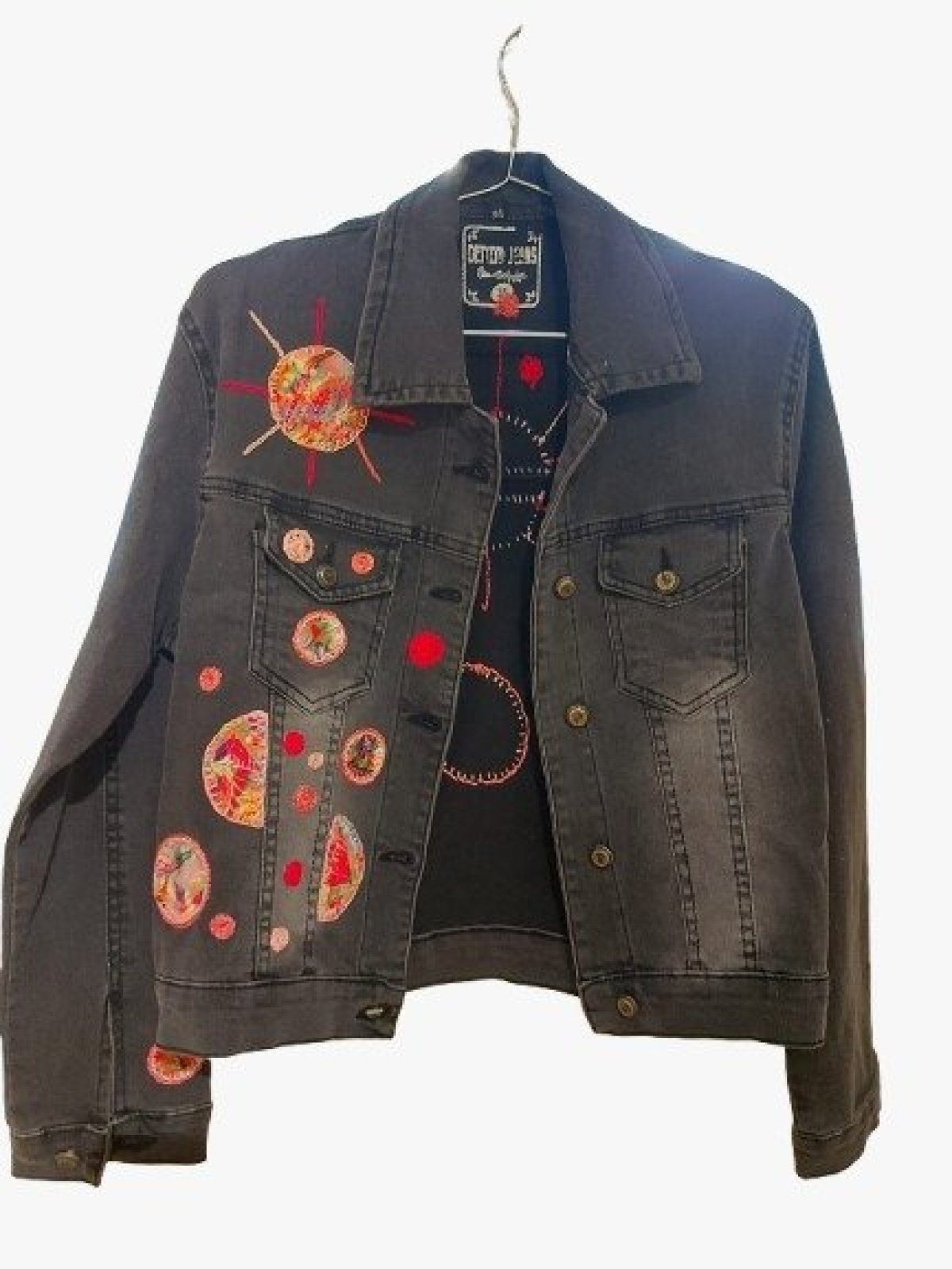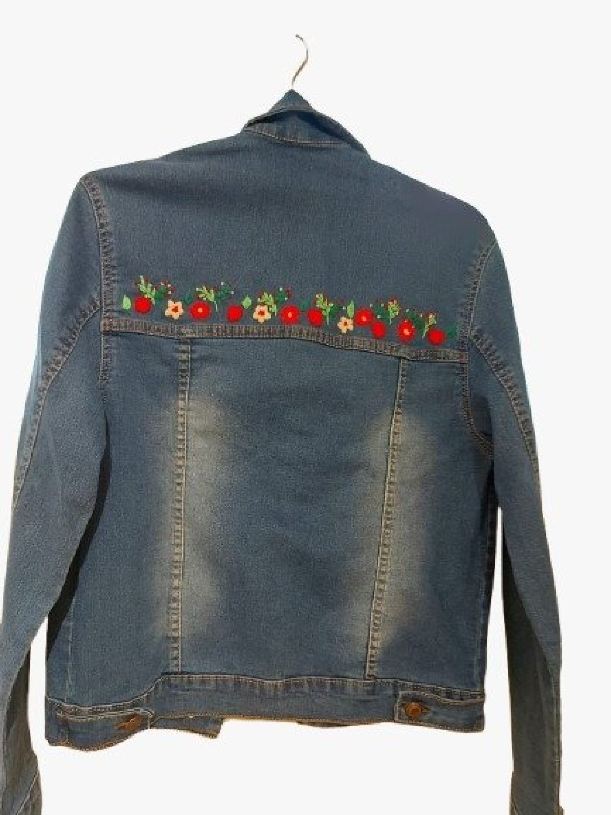 Embroidered jeans jacket - handmade with front and back embroidery - dark and light - size 36- 38