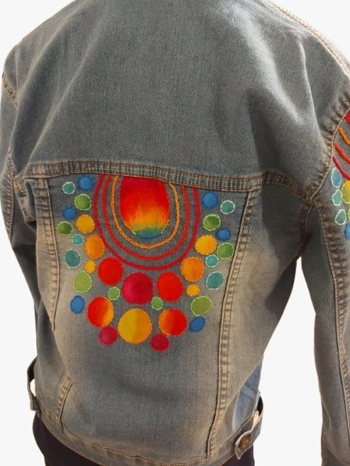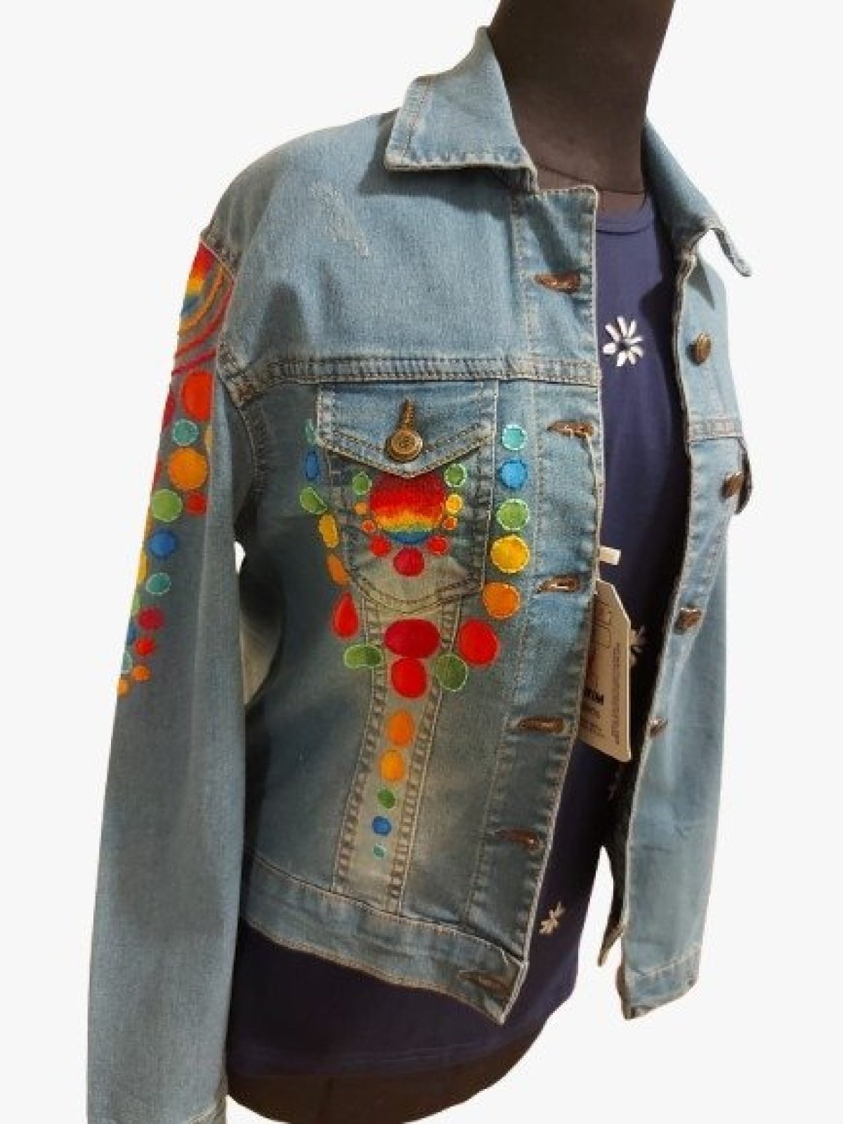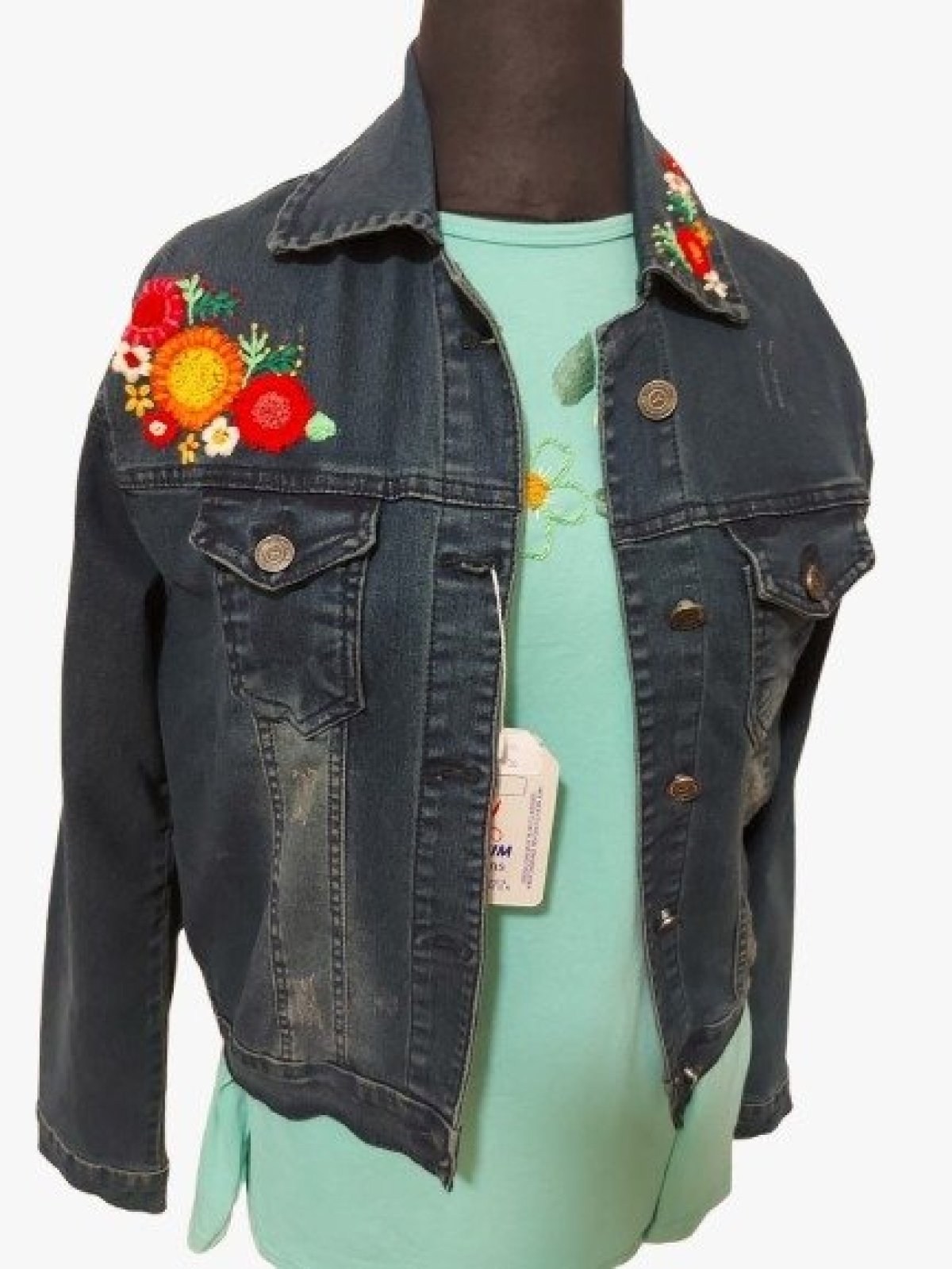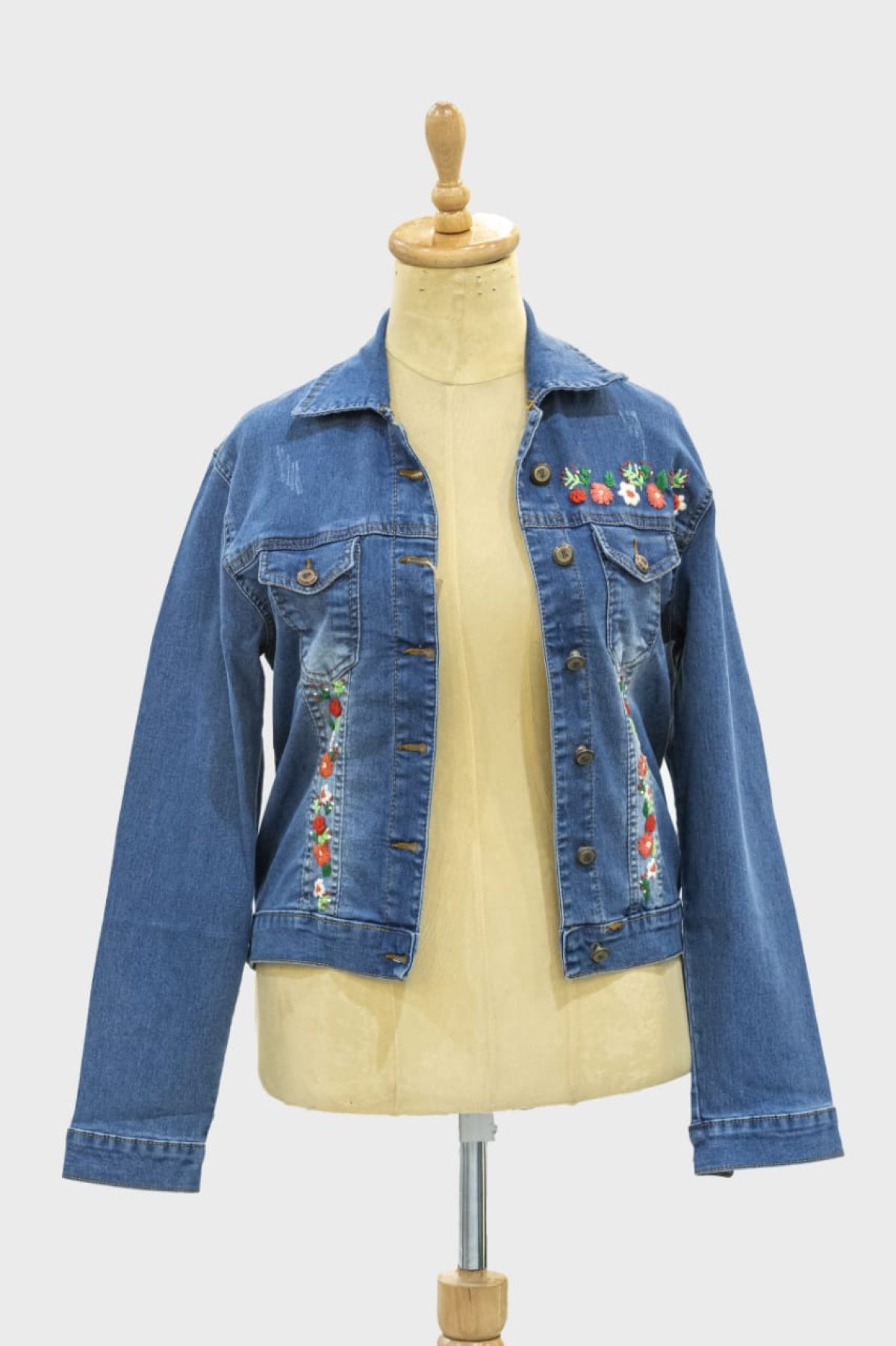 Embroidered jeans jacket - handmade with front and back embroidery - dark and light - size 36- 38