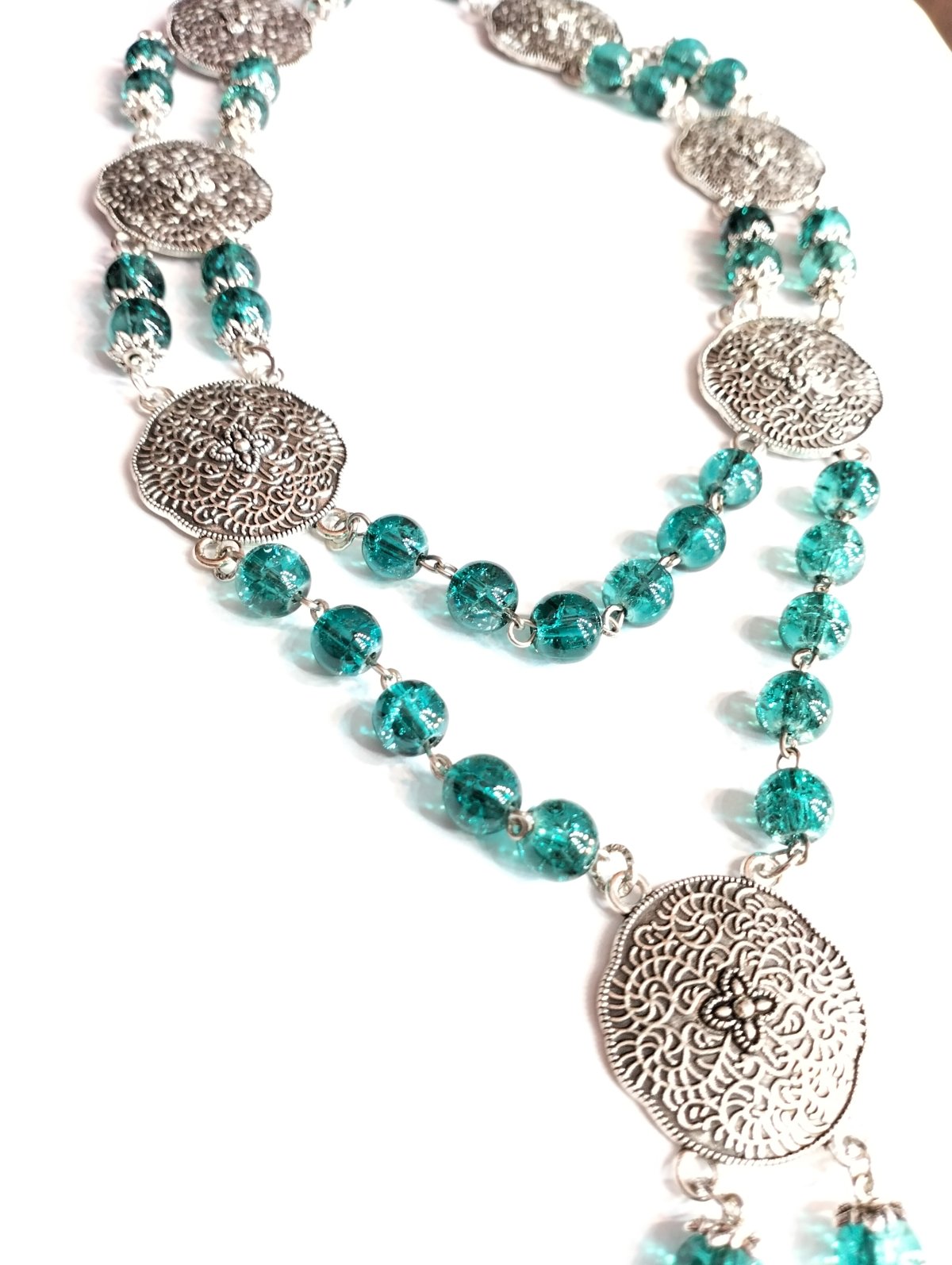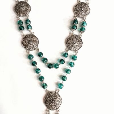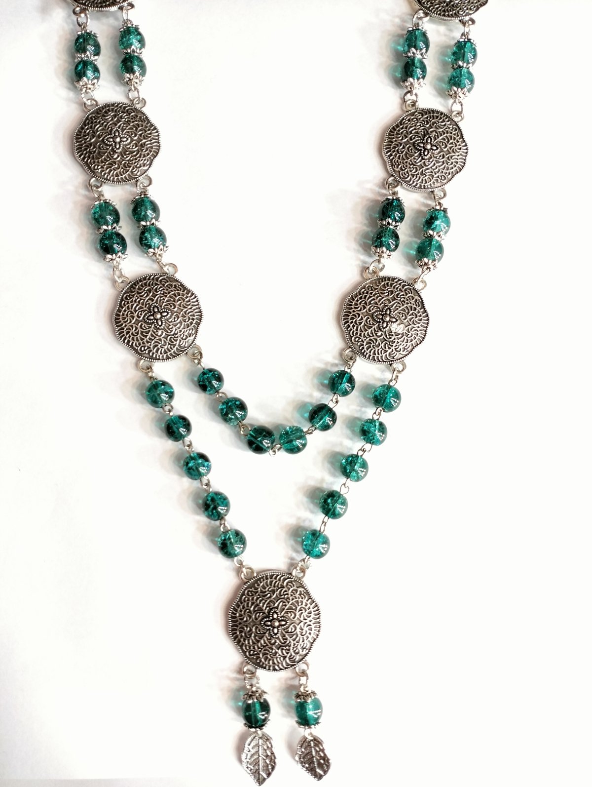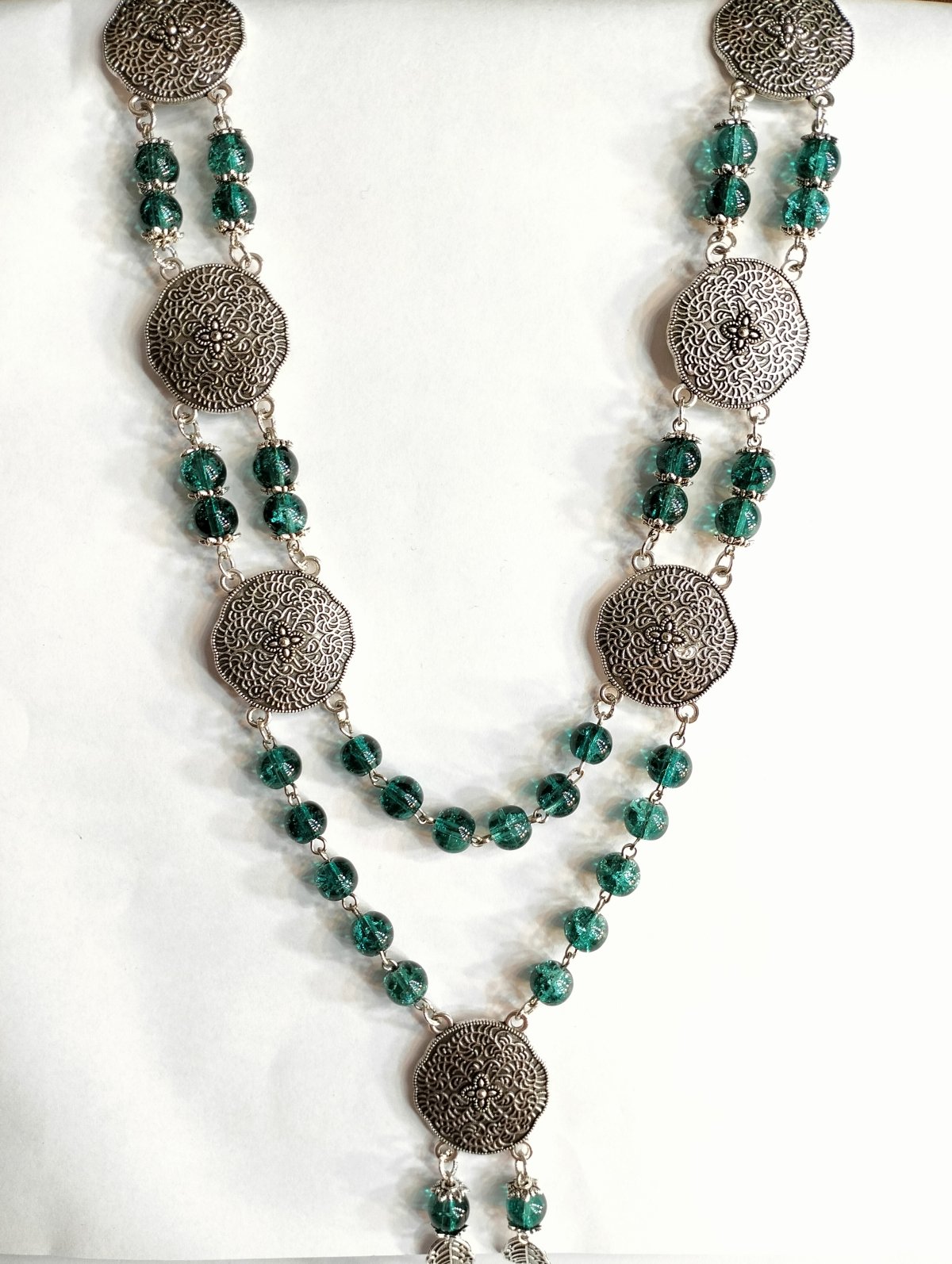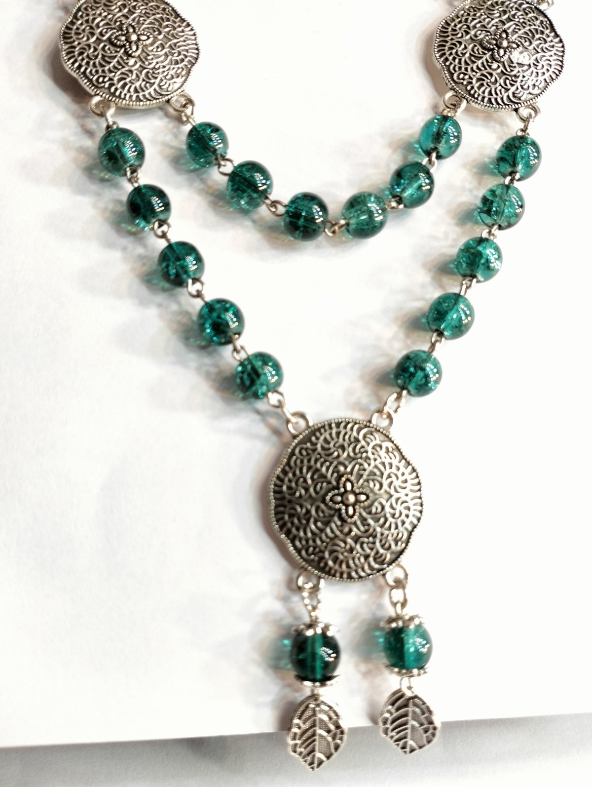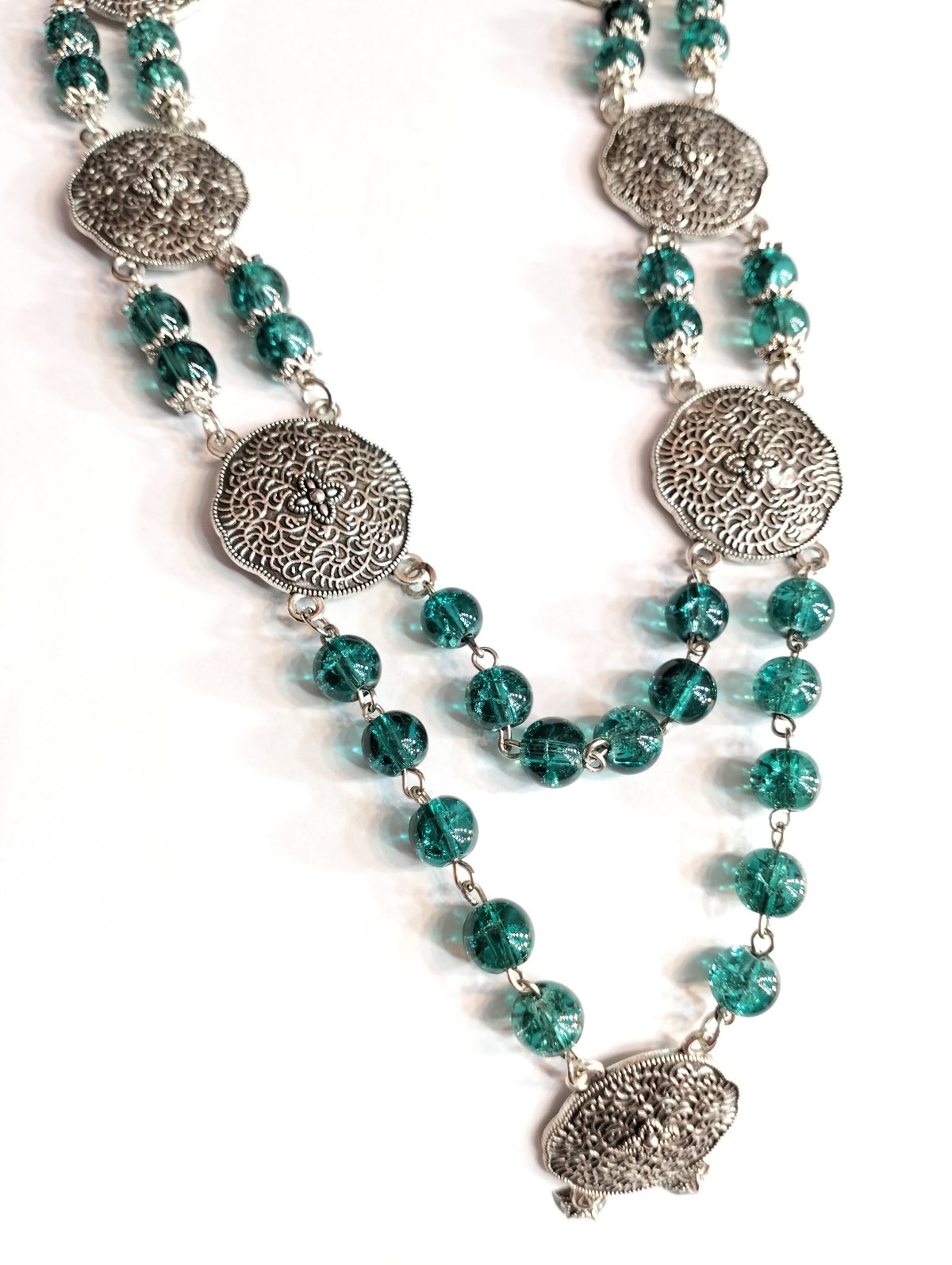 Green alabaster stone necklace inlaid with silver-colored metal, 47 cm long