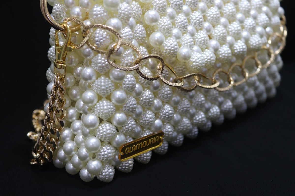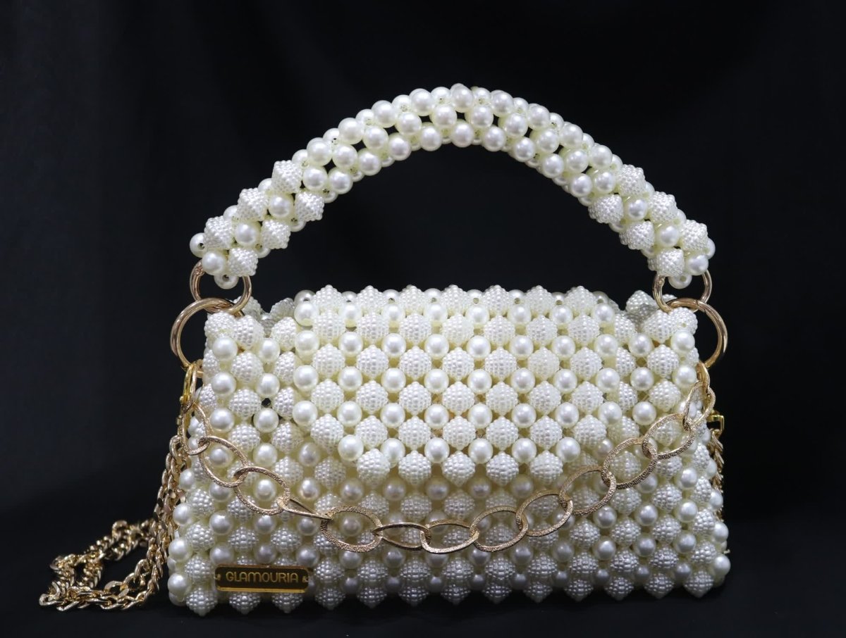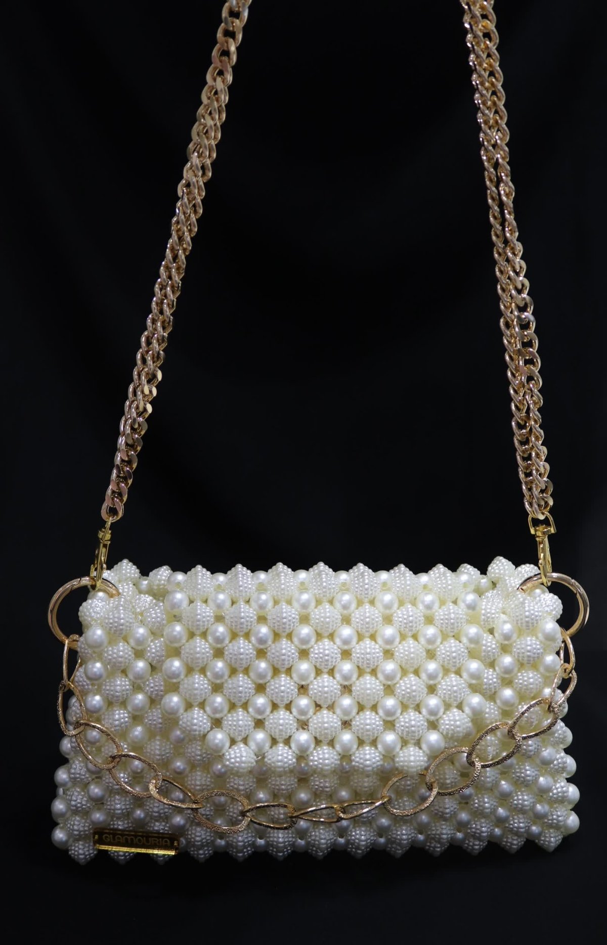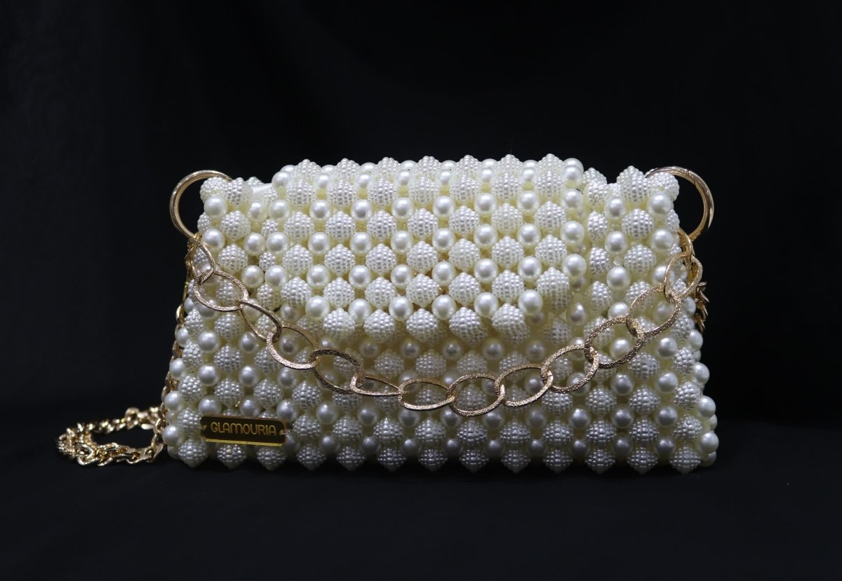Off-white pearl and pearl beads bag Size: 20cm x 12cm Movable lining with two satin straps Movable handle and metal cross handle