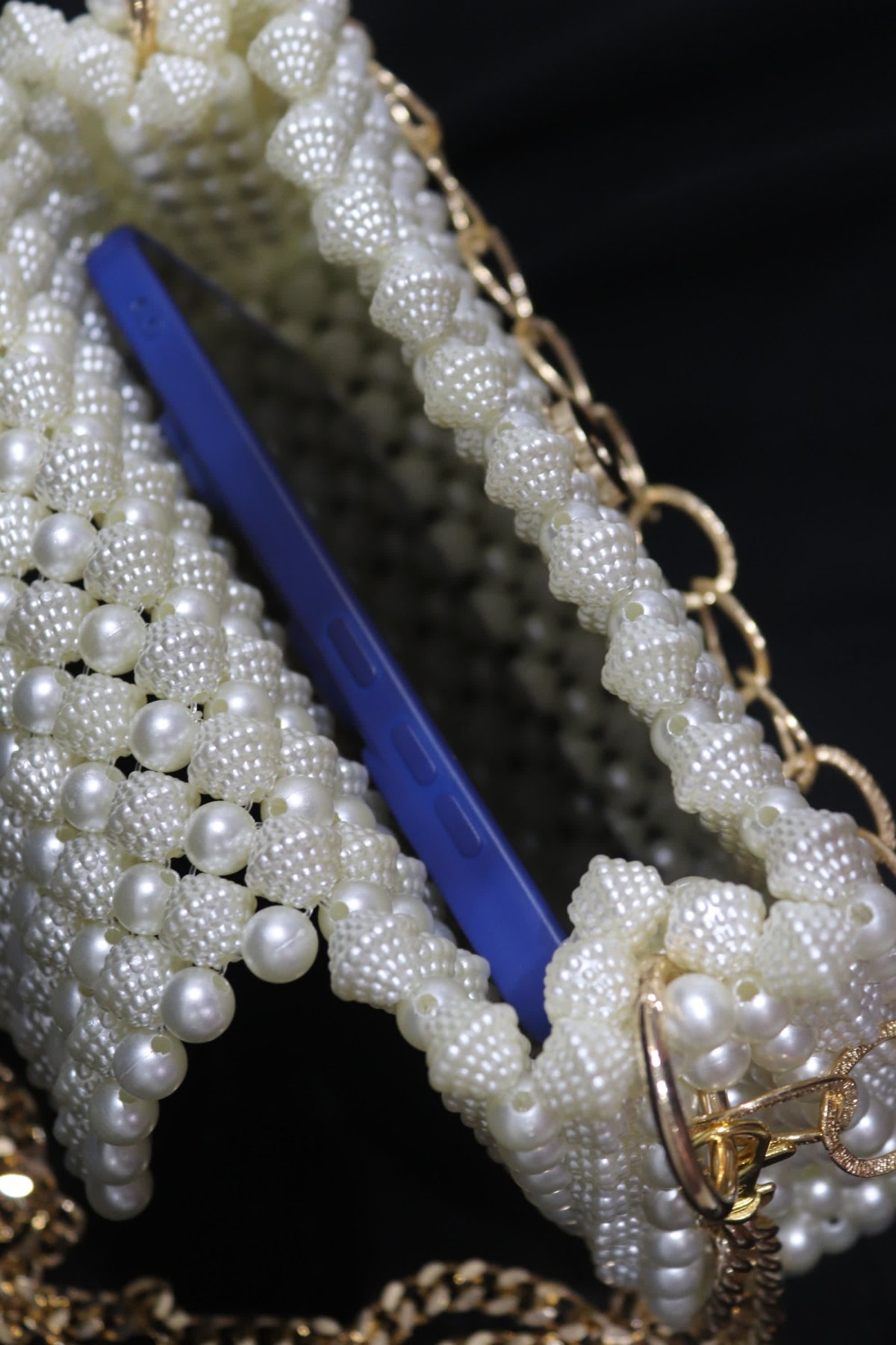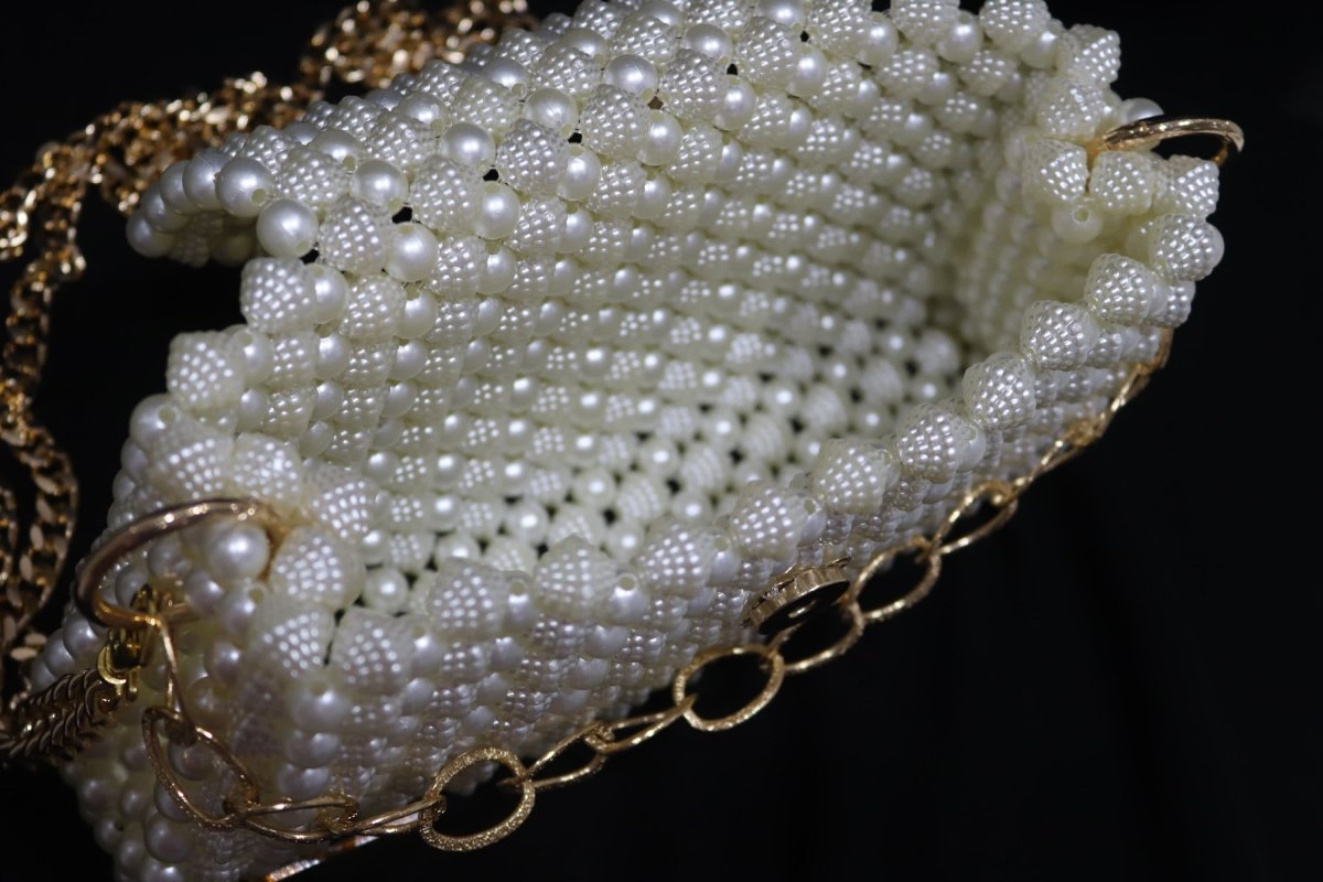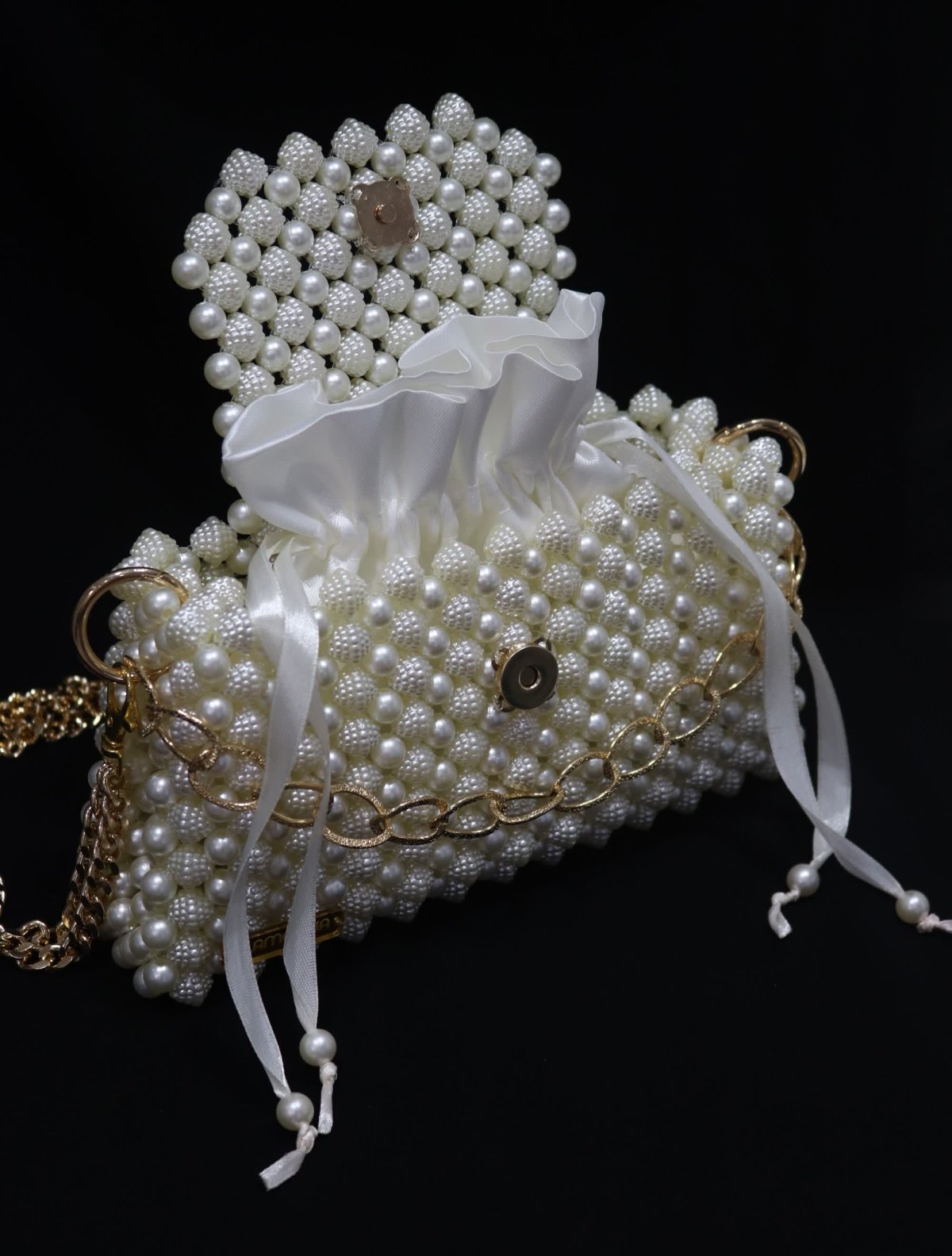 Off-white pearl and pearl beads bag Size: 20cm x 12cm Movable lining with two satin straps Movable handle and metal cross handle