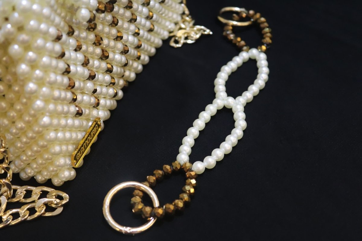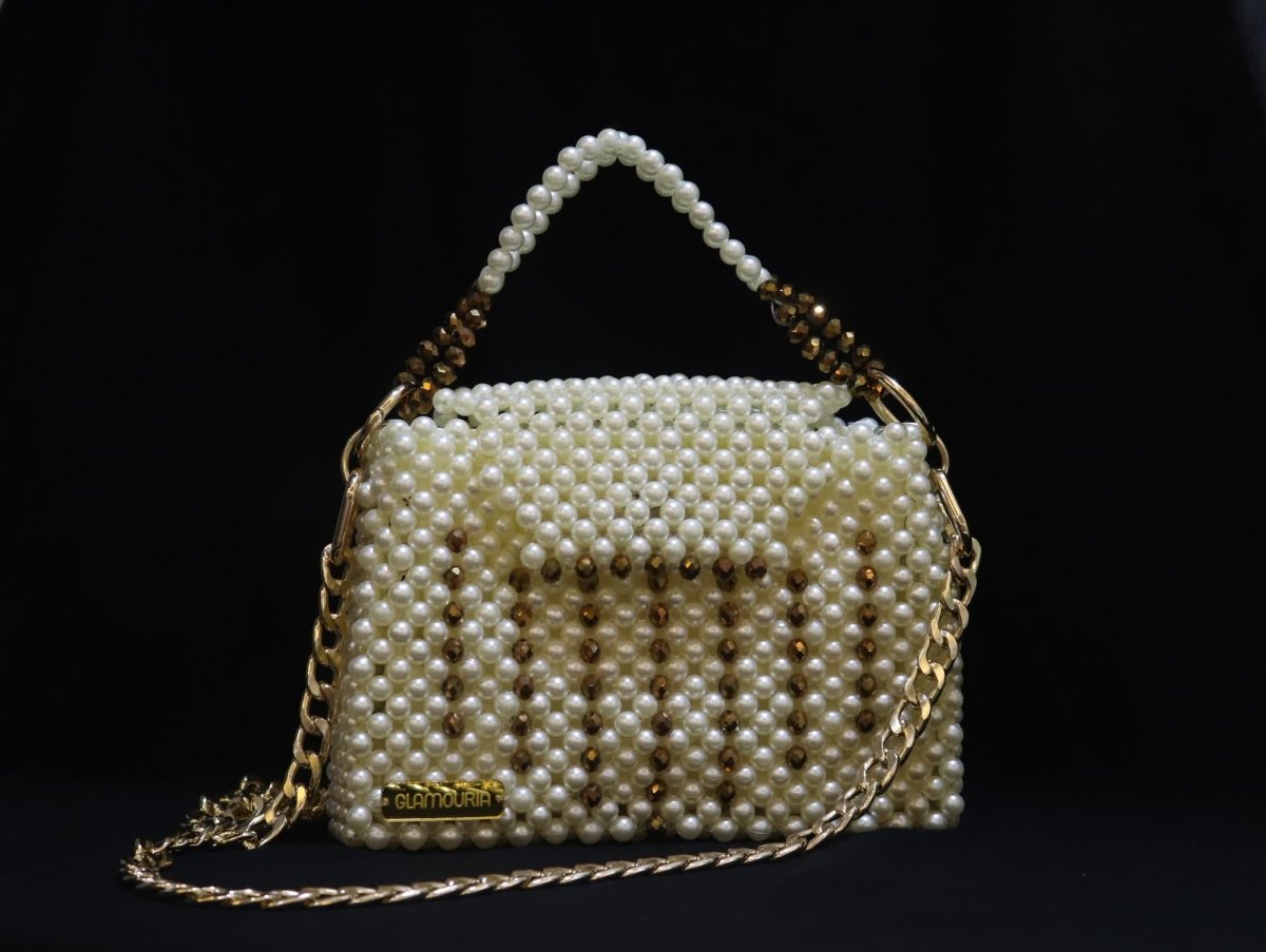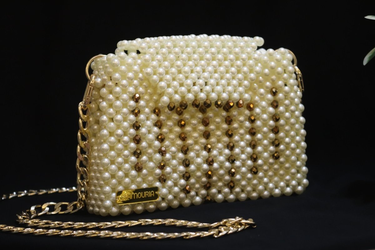Luxury bag made of off-white pearls and bronze glass crystal. Medium size can hold shorter phones. Attached with a moving beaded handle and a long gold metal handle that can be worn as a crossbody. Size: 20cm x 13cm