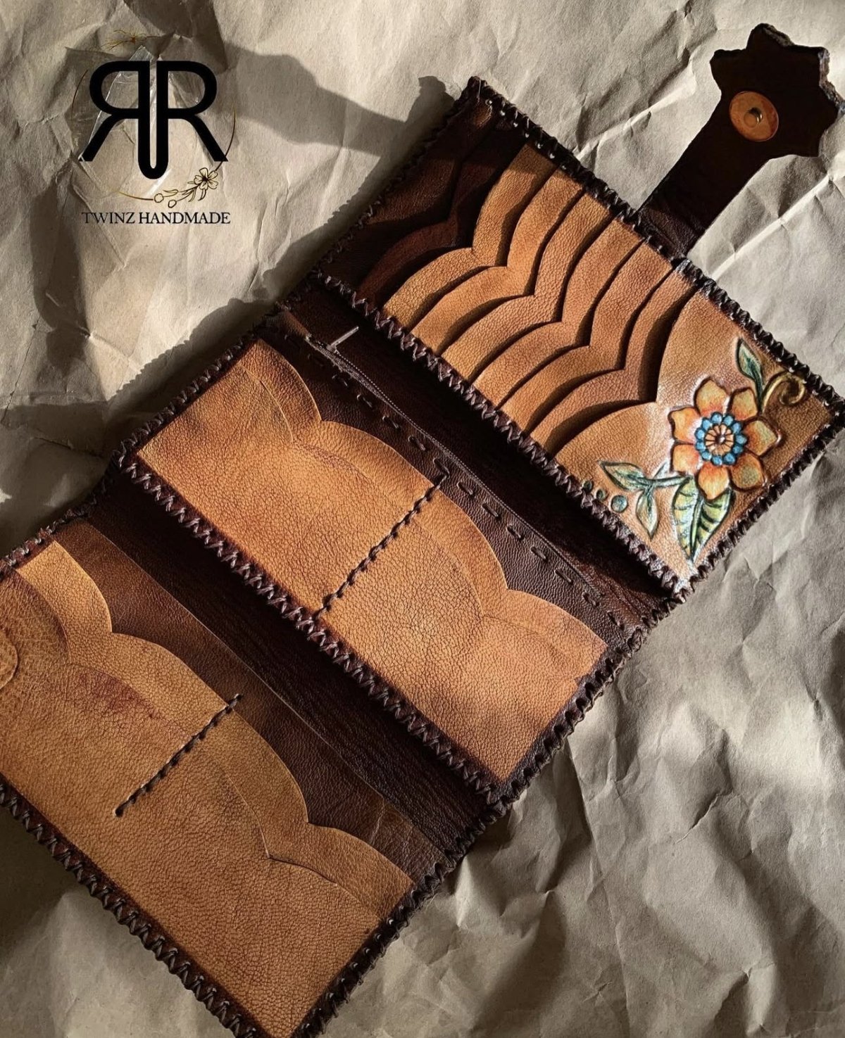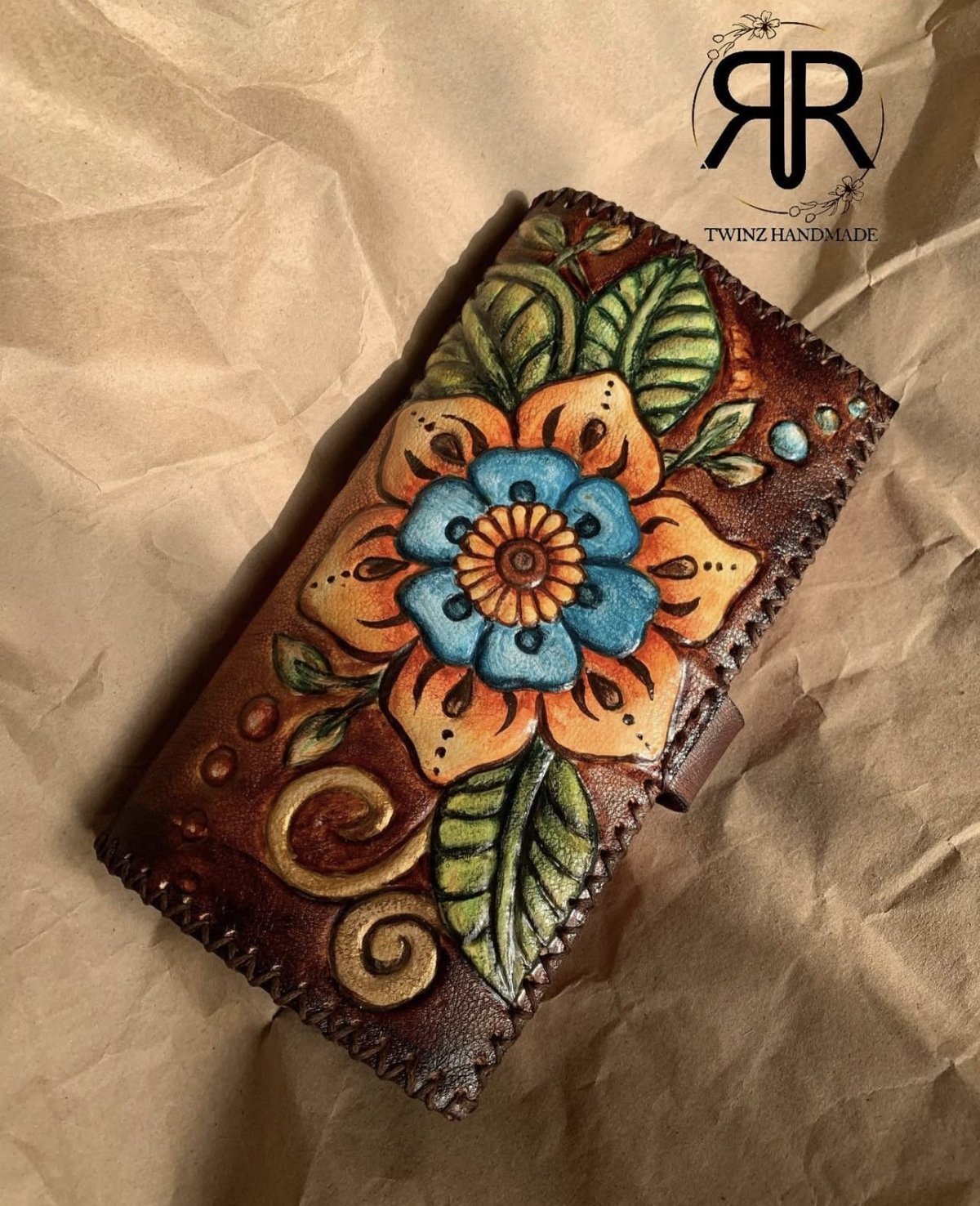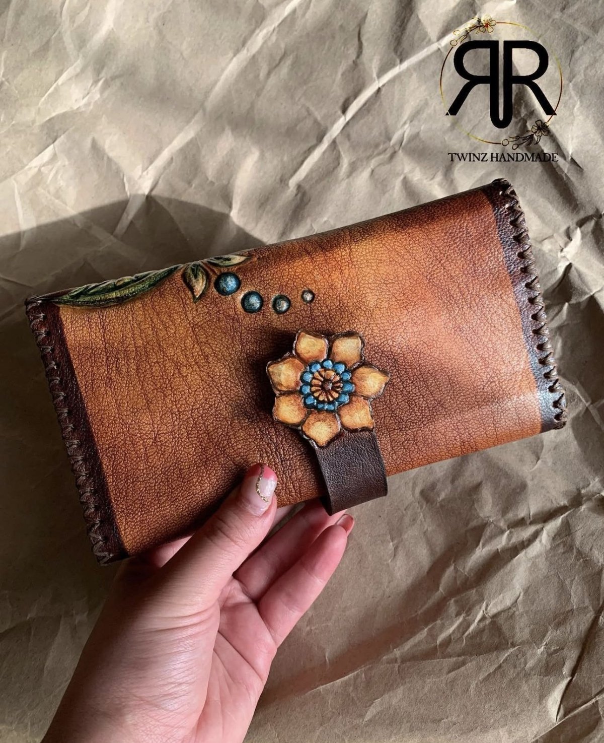 Women's wallet made of natural leather, handcrafted using carving and painting