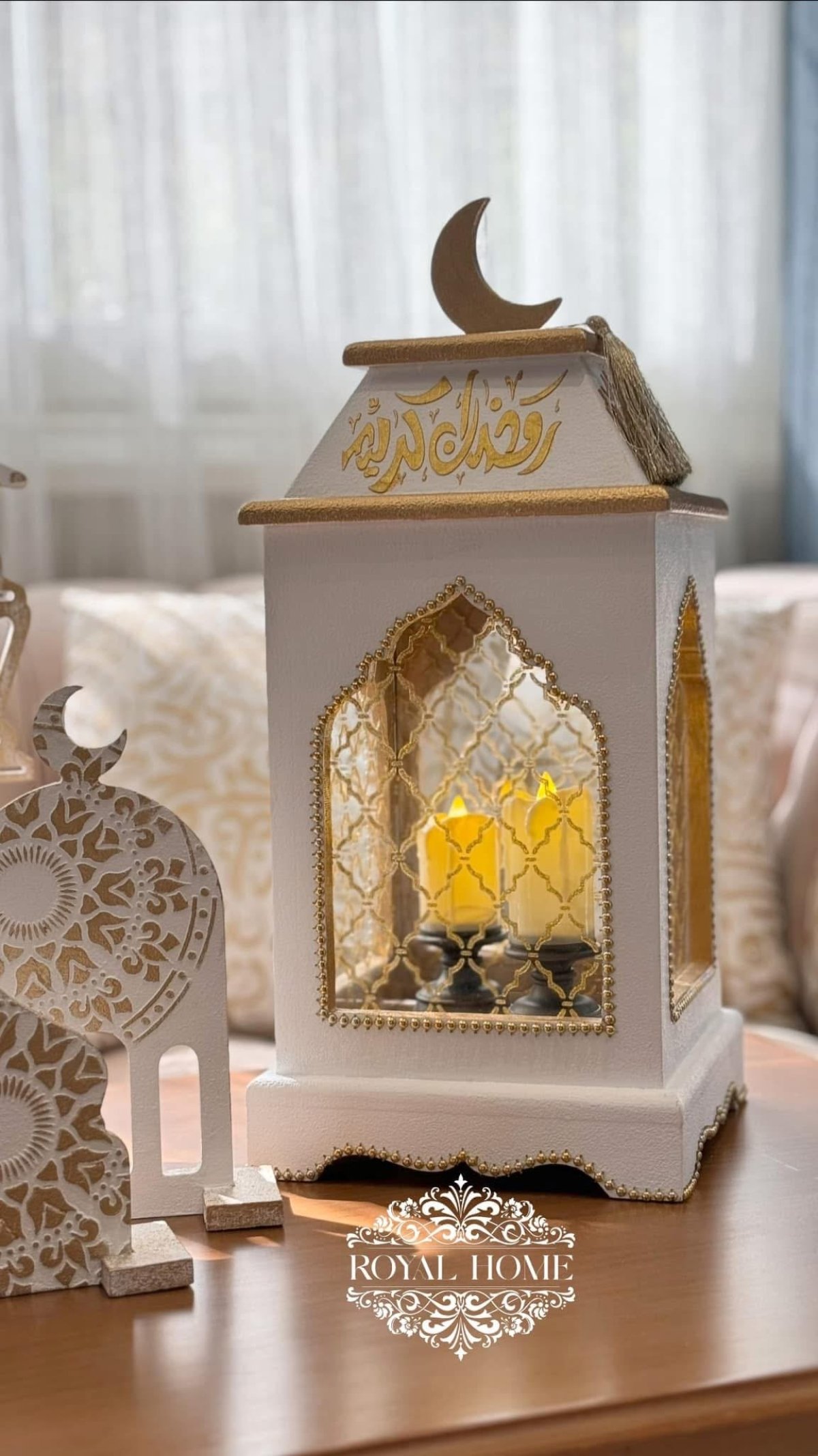 Wooden lantern with painted glass Height 40cm The price including the electric candles