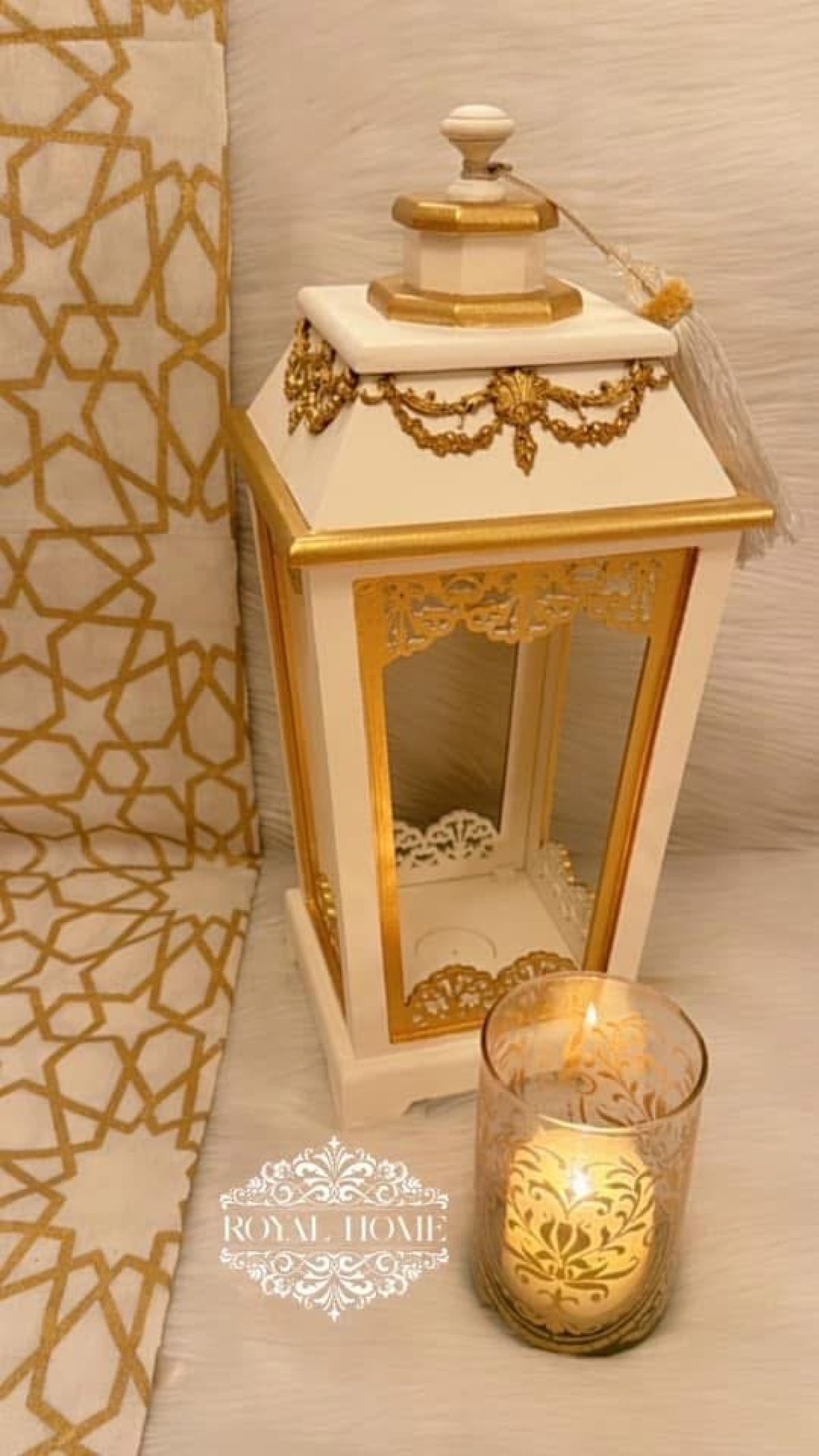 Wooden lantern height 55cm With golden decoration With jar and candle