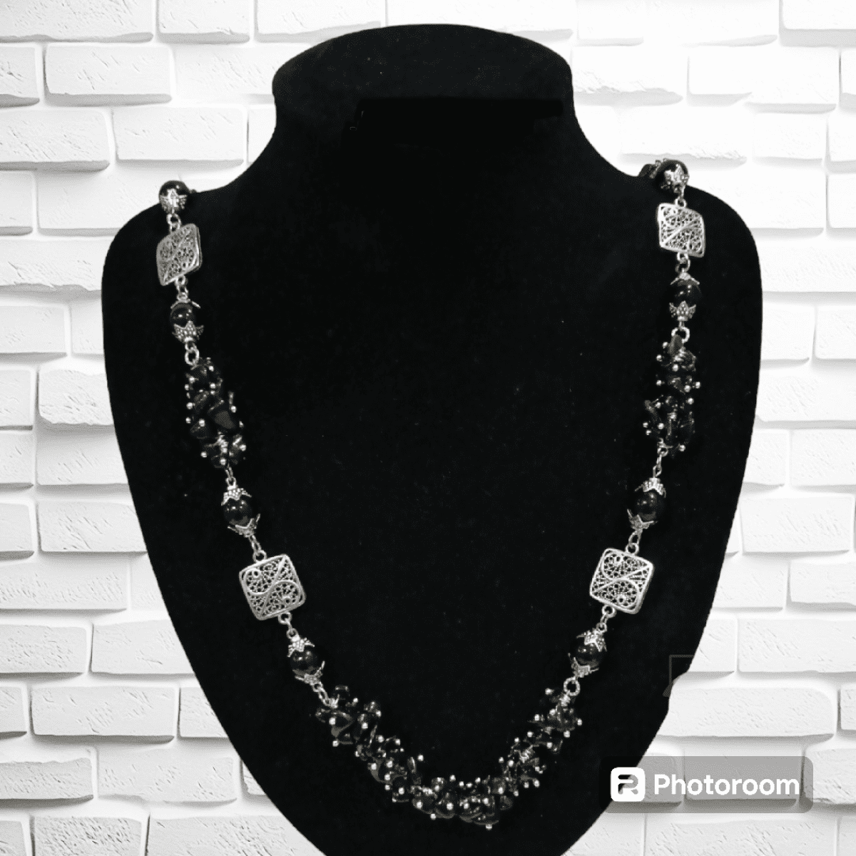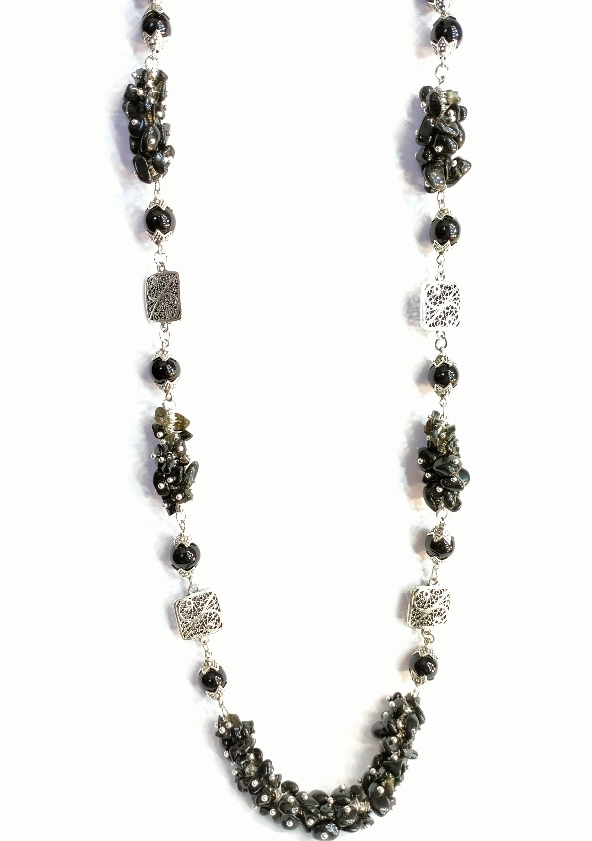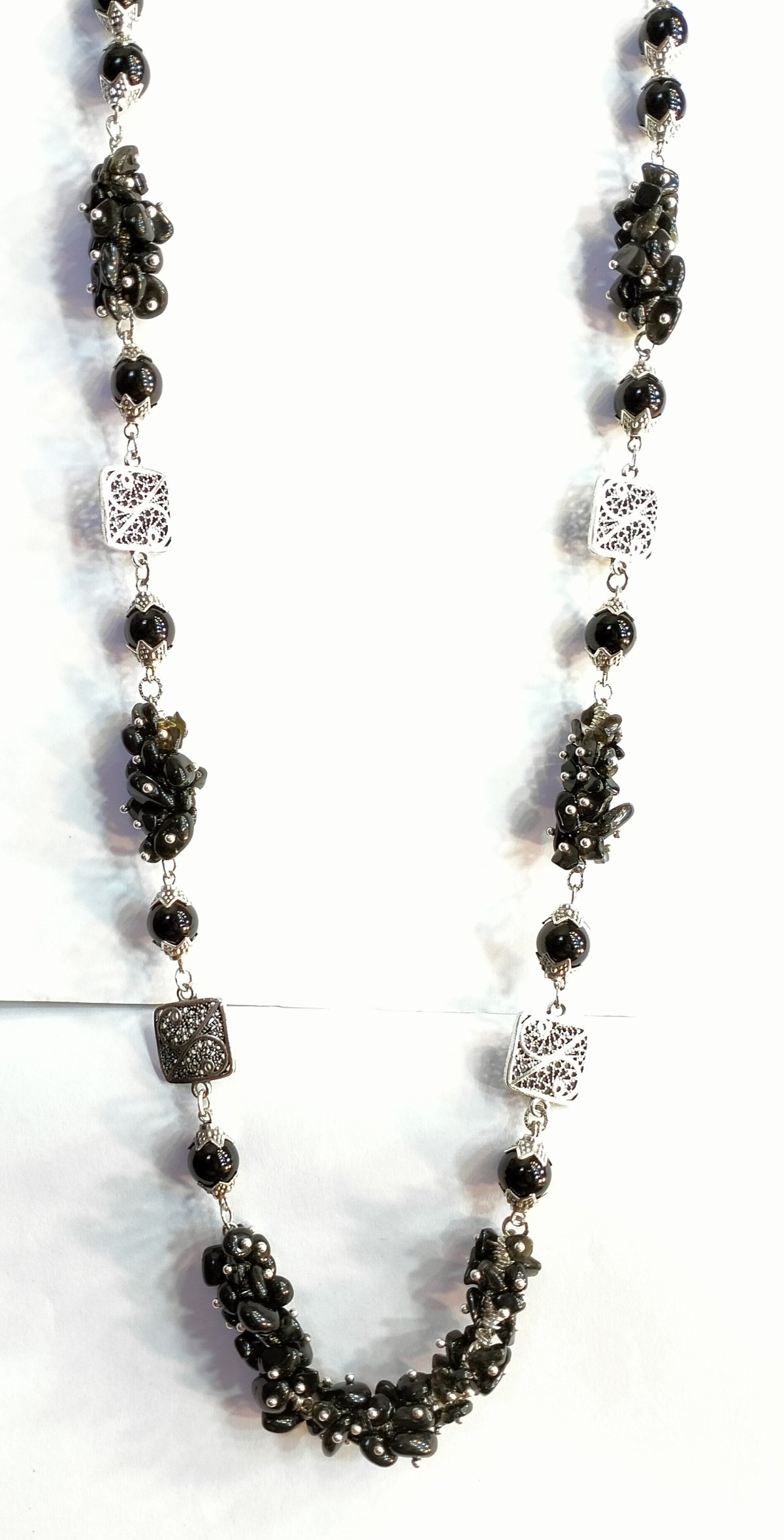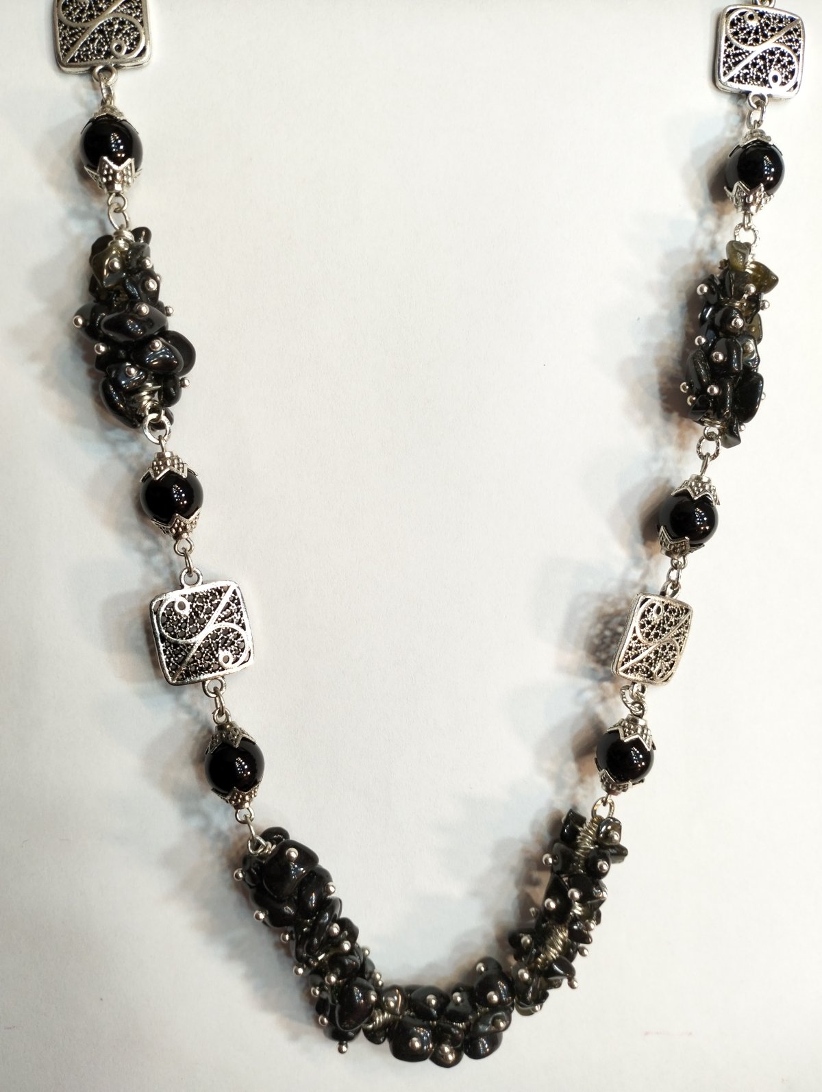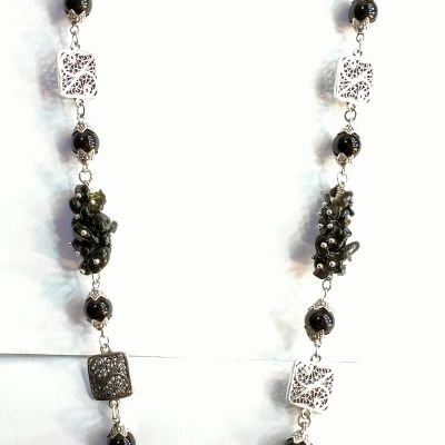 A black agate stone necklace with alabaster stone. The pendant is metal inlaid with a silver color, length 42