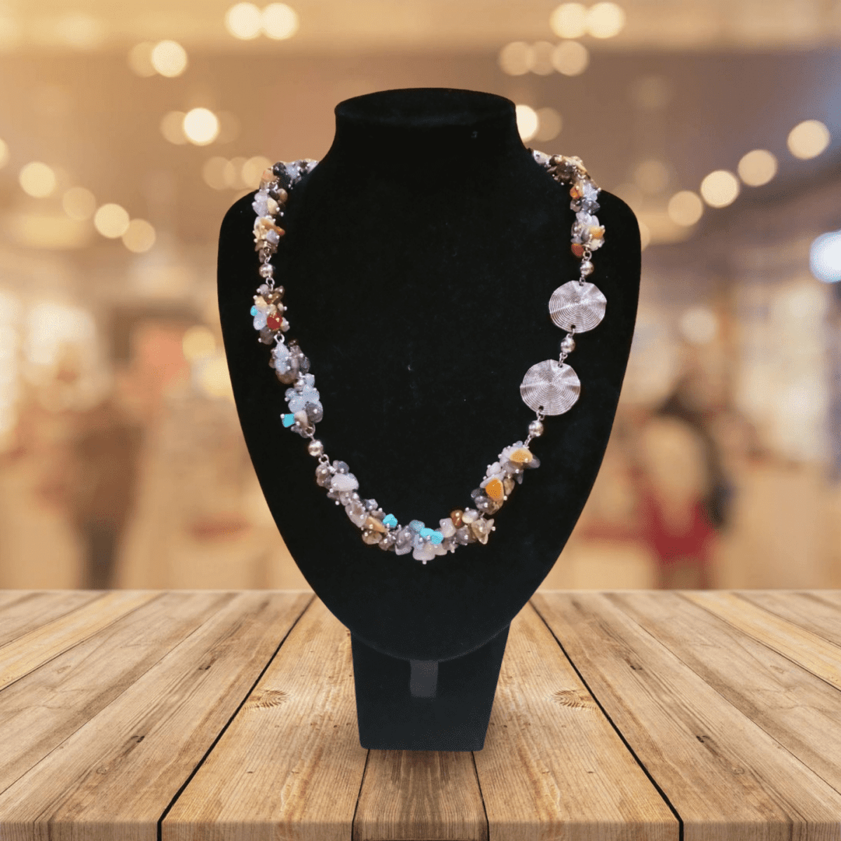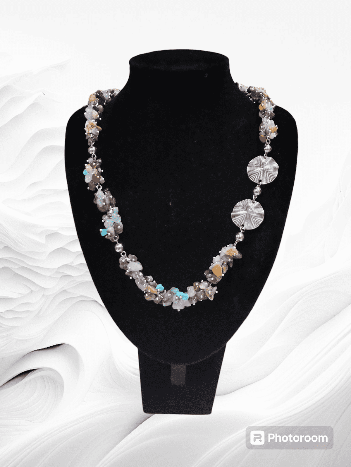 Of broken agate, studded with painted nails and a silver-coloured metal plate, length 42 cm.